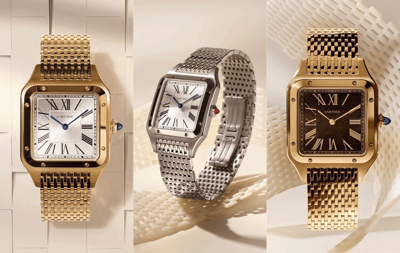 Der Santos Dumont gehört wahrscheinlich zu den besten Dresswatches aller Zeiten. Und jetzt bringt Cartier drei neue Armbänder für diese Uhren heraus, gefertigt aus Gelbgold und Platin. Und ja, sie sind verdammt teuer, aber sie sehen einfach fantastisch aus. Der Santos Dumont verfügt über ein Gehäuse aus Gelbgold mit einem silbernen Zifferblatt oder einem schwarz vergoldeten Zifferblatt, die beide jetzt am 15-reihigen Vollgoldarmband erhältlich sind. Diese Goldversionen kosten dich 39.300 € für das silberne Zifferblatt und 41.300 € für die schwarze Variante, während das 950er Platin mit 50.500 € zu Buche schlägt. Ups.