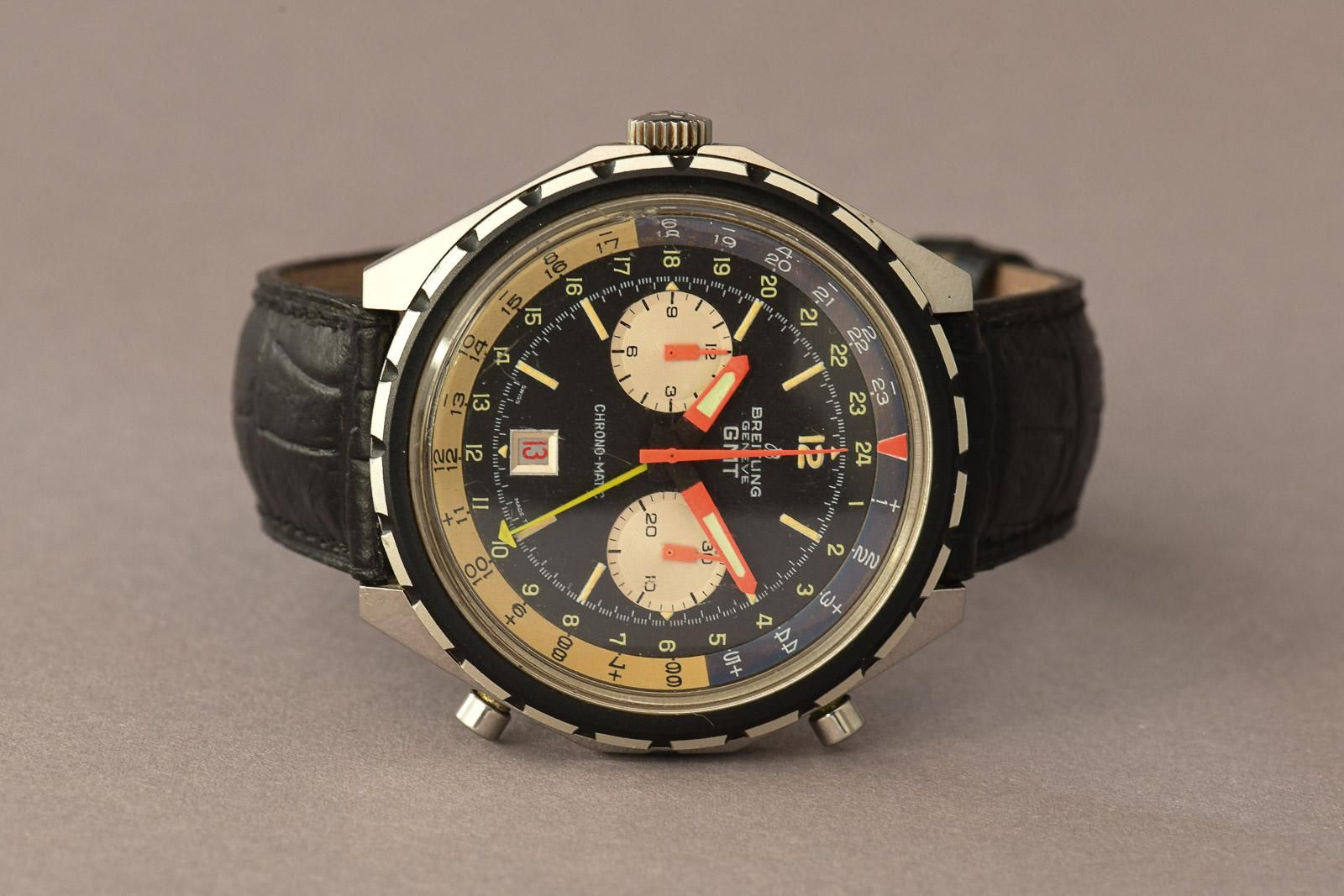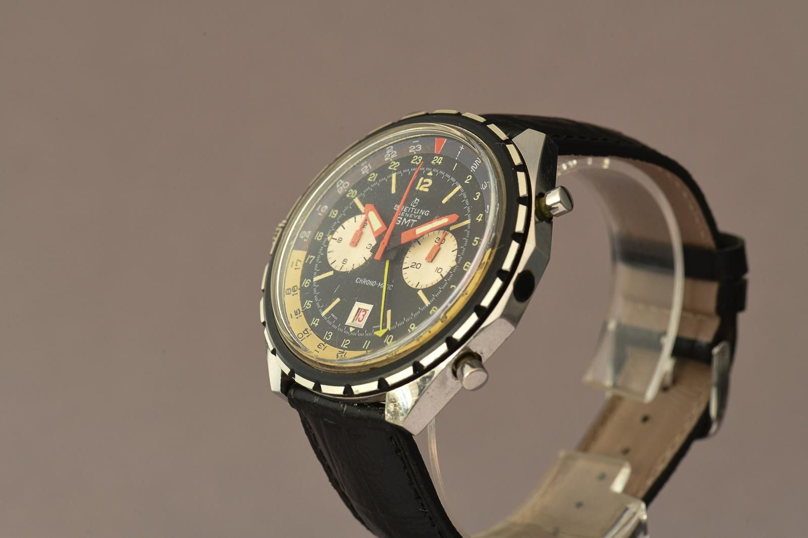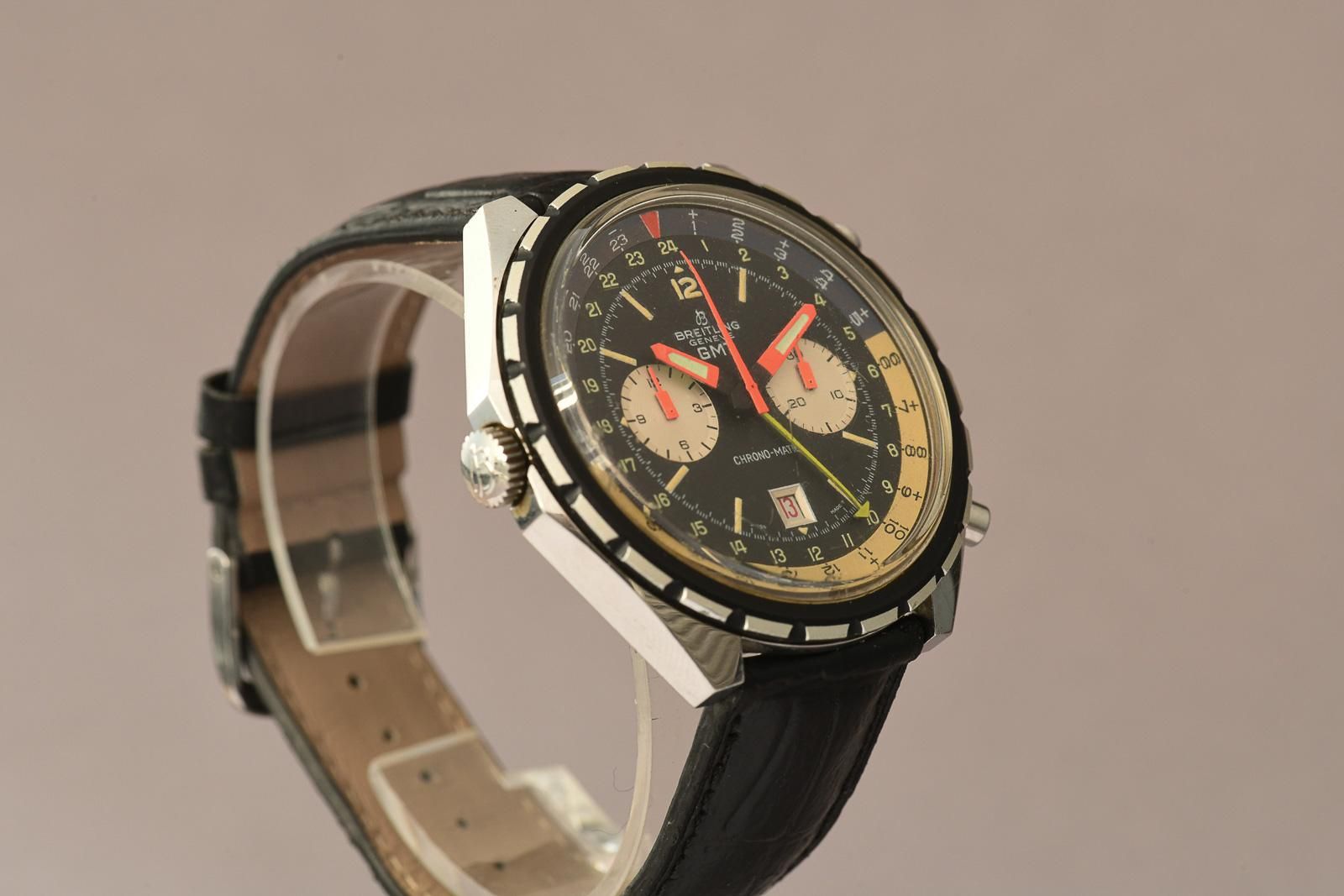 Breitling Chrono-Matic 1970 GMT 2115 (Ultra Rare). Ultra-rare Breitling Chrono-Matic GMT, beautiful, honest original condition. In 1969, the world’s first automatic chronograph movement was presented: the calibre 11. Three manufacturers had worked together on the development of this legendary calibre: Breitling, Heuer-Leonidas and Hamilton-Büren. In 1970, the improved calibre 12 and the calibre 14 with a GMT complication for displaying the second time zone were released. The Chrono-Matic from 1970 shown here is also equipped with the latter. The iconic 46mm oversized stainless steel case is popular with collectors and houses a multicoloured dial. The rotating bezel is divided into light and dark halves, representing day and night. It is nice to see that the original purple colour in the bezel has been beautifully preserved to this day. In most examples from the 1970s, it has faded to a light brown. In this example, the hands still glow in beautiful neon orange. Thanks to the yellow GMT hand, the time in a second time zone can be read. The watch also features a date window with a red date disc and, of course, the chronograph complication with a 30-minute counter and a 12-hour totaliser. A must for any serious Breitling collector.
