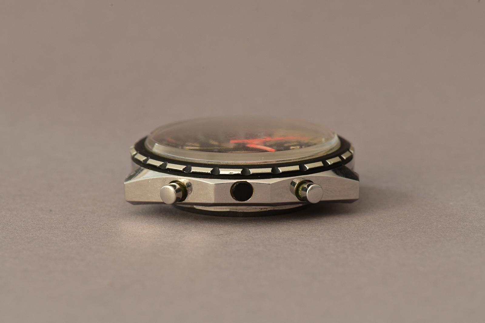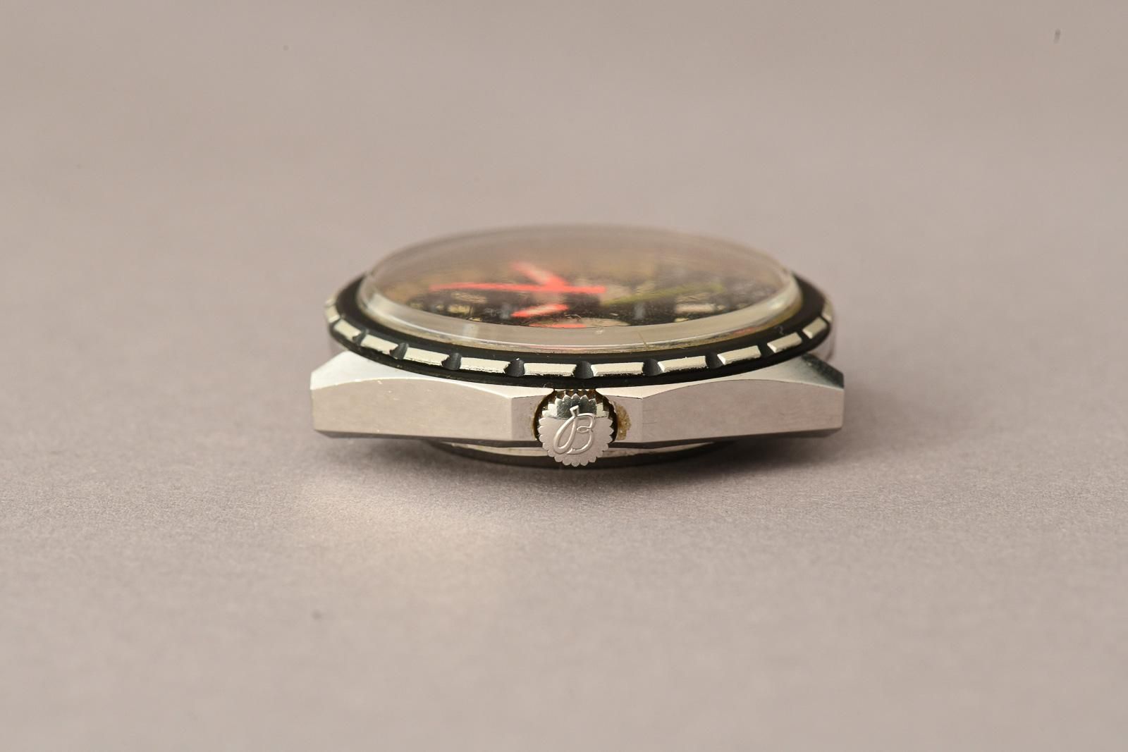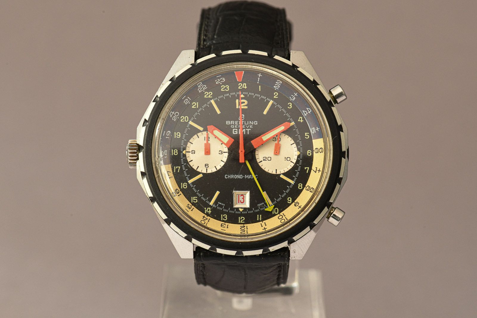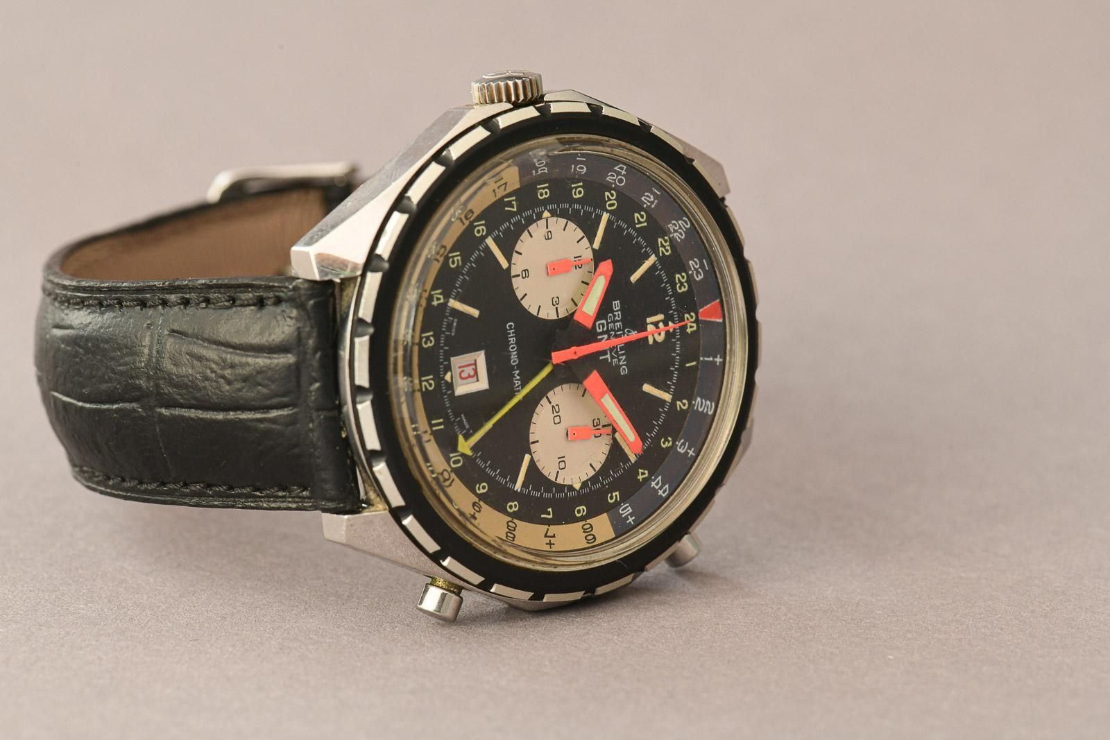 Breitling Chrono-Matic 1970 GMT 2115 (Ultra Rare). Ultra-rare Breitling Chrono-Matic GMT, beautiful, honest original condition. In 1969, the world’s first automatic chronograph movement was presented: the calibre 11. Three manufacturers had worked together on the development of this legendary calibre: Breitling, Heuer-Leonidas and Hamilton-Büren. In 1970, the improved calibre 12 and the calibre 14 with a GMT complication for displaying the second time zone were released. The Chrono-Matic from 1970 shown here is also equipped with the latter. The iconic 46mm oversized stainless steel case is popular with collectors and houses a multicoloured dial. The rotating bezel is divided into light and dark halves, representing day and night. It is nice to see that the original purple colour in the bezel has been beautifully preserved to this day. In most examples from the 1970s, it has faded to a light brown. In this example, the hands still glow in beautiful neon orange. Thanks to the yellow GMT hand, the time in a second time zone can be read. The watch also features a date window with a red date disc and, of course, the chronograph complication with a 30-minute counter and a 12-hour totaliser. A must for any serious Breitling collector.