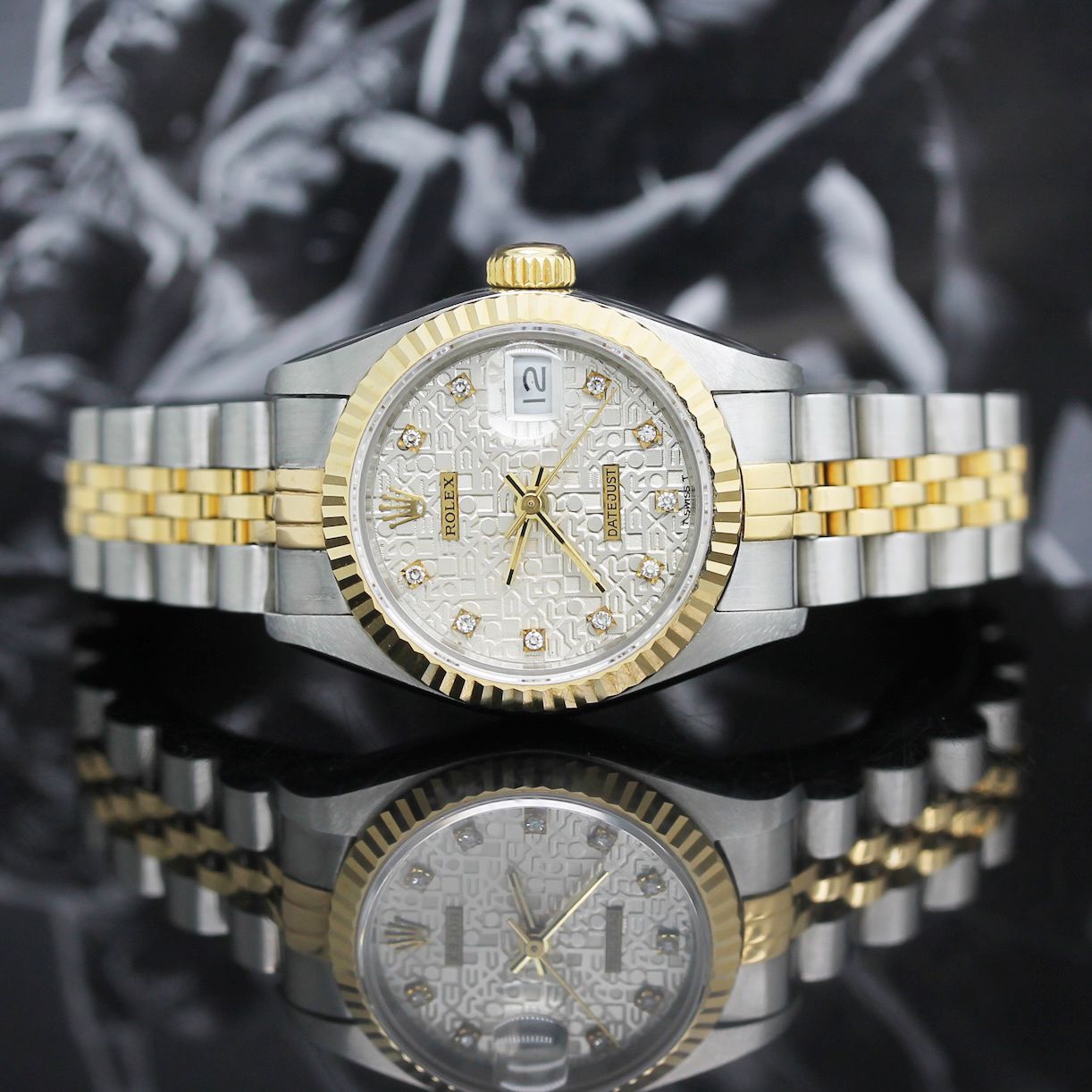 Rolex Lady-Datejust Stahl/Gold Ref: 69173. Die Uhr ist in Anbetracht ihres Alters in einem guten Zustand. Sie ist mit einem automatischen Uhrwerk ausgestattet. Das Werk wurde im September 2023 geölt und gereinigt. Eine Bereicherung für jeden Uhrensammler und -liebhaber. Das Jubiläumsband ist aus Stahl/Gold und gebraucht, aber noch in gutem Zustand (Jubiläumsband 14,5 cm lang (ohne Uhr gemessen)). Du bietest auf eine schöne und klassische Armbanduhr der Spitzenklasse mit Wiedererkennungswert. Saphirglas. Das Zifferblatt ist silberfarben und mit 10 Diamanten besetzt (dies ist eine Rolex-Fassung). Die Lünette ist aus 18KT Gelbgold gefertigt. Die Datejust Uhr ist 32 Jahre alt und wird in gebrauchtem Zustand verkauft. Papiere: Es ist keine Rolex-Box vorhanden. Ein Echtheitszertifikat von unserem Hamburger Uhrengeschäft ist vorhanden.