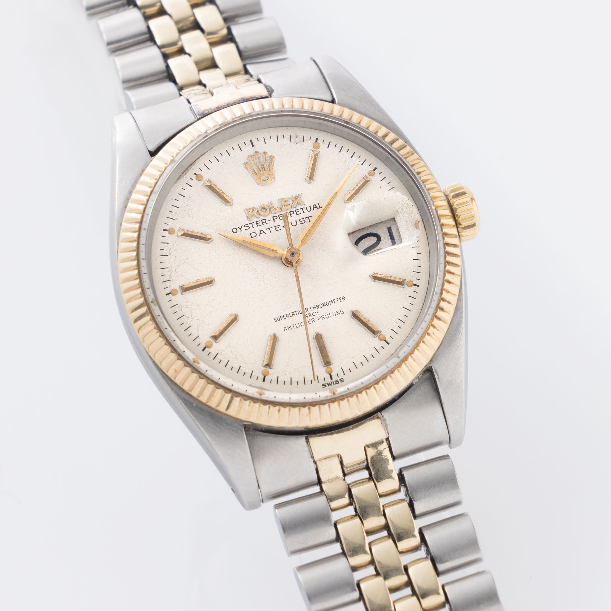 We are happy to present an exceptionally rare and stunning steel and yellow gold Datejust. This timepiece features a dial configuration we’ve never encountered before on a Datejust! First off, it has an applied Rolex logo under the coronet, elegant arrowhead-like hour markers, a “Swiss only” designation at the 6 o'clock position, and beautiful beige lume plots on both the markers and the dauphine-style hands. But there’s more: this beauty also displays “Superlative Chronometer nach amtlicher Prüfung” on the lower half of the dial—a German translation of the "officially certified chronometer" text typically found on these models! While we’ve come across a few Day-Dates with German-translated text (in fact, we’ve sold one and have one in stock!), the text on those pieces differs slightly: “Superlativer Chronometer Amtlich Geprüft.” We believe these watches were produced for the German-speaking regions of Switzerland and/or the German market. Given that we've seen only a few specimens of these "German dials," we also think they were intended as an "experiment" for these specific markets. We are “officially certified Datejust fans” here at Bulang & Sons, but this one made us turn Superlative German! Specifications: - Rolex Datejust Reference 6605 Steel and 18k Gold Execution- 36mm steel and 18k gold execution- Serial 137xxx, dating to 1956- Cream-colored dial with German “Superlative Chronometer nach amtlicher Prüfung” text- Dauphine hands- USA-made coffee bean bracelet in steel and gold execution- Fully serviced by our watchmaker- Free worldwide FedEx Priority shipping