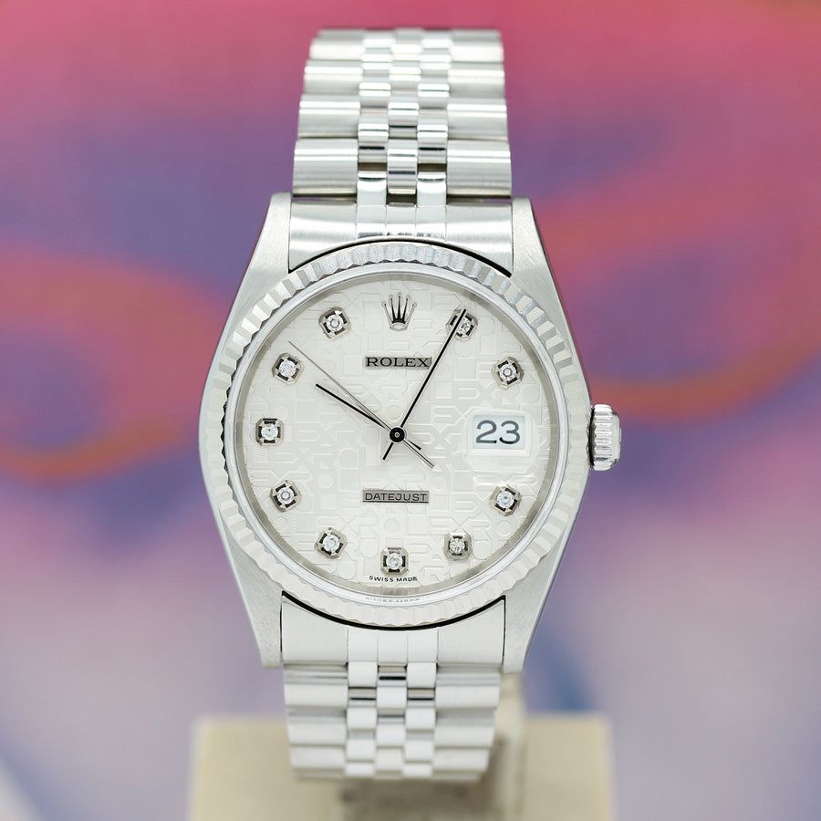 Datejust steel white gold automatic Ref: 16234. The watch is in good condition considering its age. It is equipped with an automatic movement. An enrichment for every watch collector and enthusiast. All functions were checked by the master watchmaker and found to be flawless. The work was oiled and cleaned in March 2025. The anniversary bracelet is made of steel and used, but still in very good condition (16.5 cm long measured without watch). You are bidding on a beautiful and classic top-class wristwatch with recognition value. Sapphire crystal. The dial is silver colored and set with 10 diamonds (this is a Rolex setting). The bezel is 18KT white gold and fluted. The Datejust watch is approximately 20 years old and is sold in used condition. Rolex box & papers (LC 888) are available.