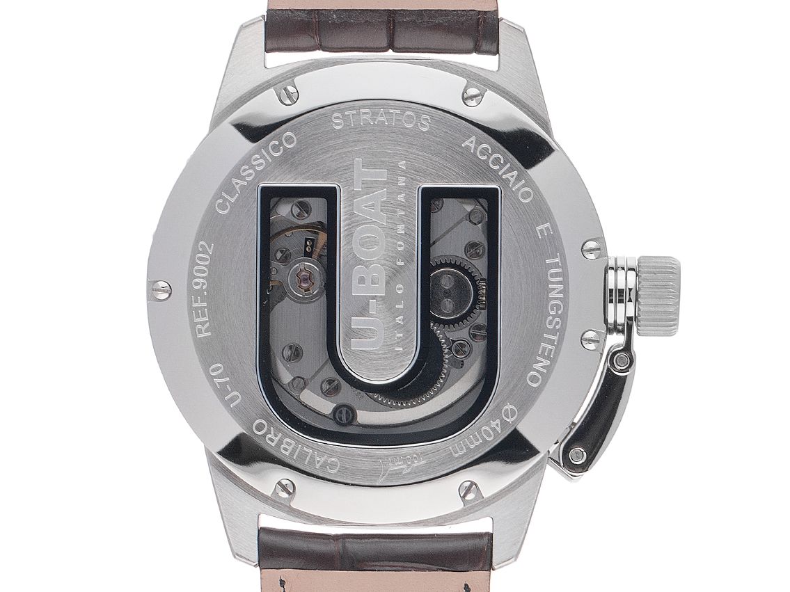 U-Boat Italo Fontana Classico Stratos 40BK Stahl Automatik Armband LederGehäuse Edelstahl poliert und satiniert. Gehäusedurchmesser ohne Krone 40mm, Gehäusehöhe 9,7mm. Lünette Edelstahl glatt und poliert. Armband Leder dunkelbraun mit Ziernaht, Stiftschließe Edelstahl mit Hersteller-Logo. Zifferblatt schwarz mit beigen arabischen Leuchtziffern und Leuchtindexen sowie Leuchtzeigern. Uhrwerk Handaufzug Kaliber U-Boat U-29 mit 21 Edelsteinen, ca. 42 Stunden Gangreserve, 28.800 A/h. Anzeige von Stunde, Minute und Sekunde über Zeiger aus der Mitte mit Sekundenstopp zur sekundengenauen Einstellung der Uhrzeit, Datumsanzeige mit Schnellverstellung bei 9 Uhr. Saphirglas kratzfest. Krone links bei 9 Uhr mit spezial Kronenschutz, verschraubbar. Boden Edelstahl verschraubt, graviert mit Saphirglas Sichtfenster. Gewicht der Uhr inklusive Armband 82g. Wasserdicht 10 ATM. Referenznummer: 9002, ID: ST115433401217RE-2900, Artikelnummer: 10000040383. Original U-Boat Box und Garantie Papiere, Full Set. Neu. Lieferzeit sofort.