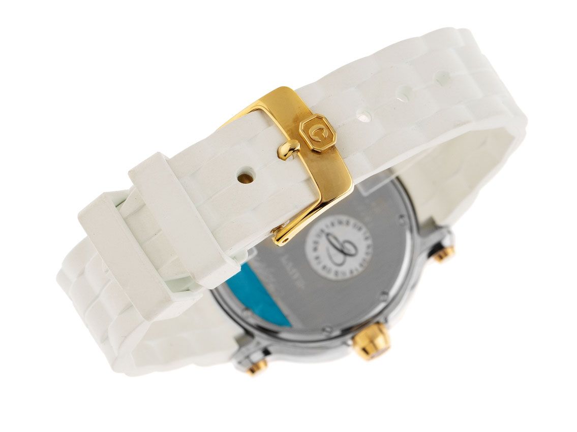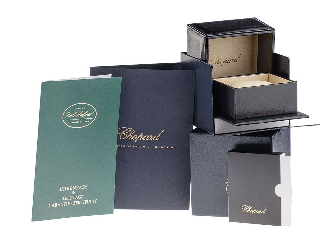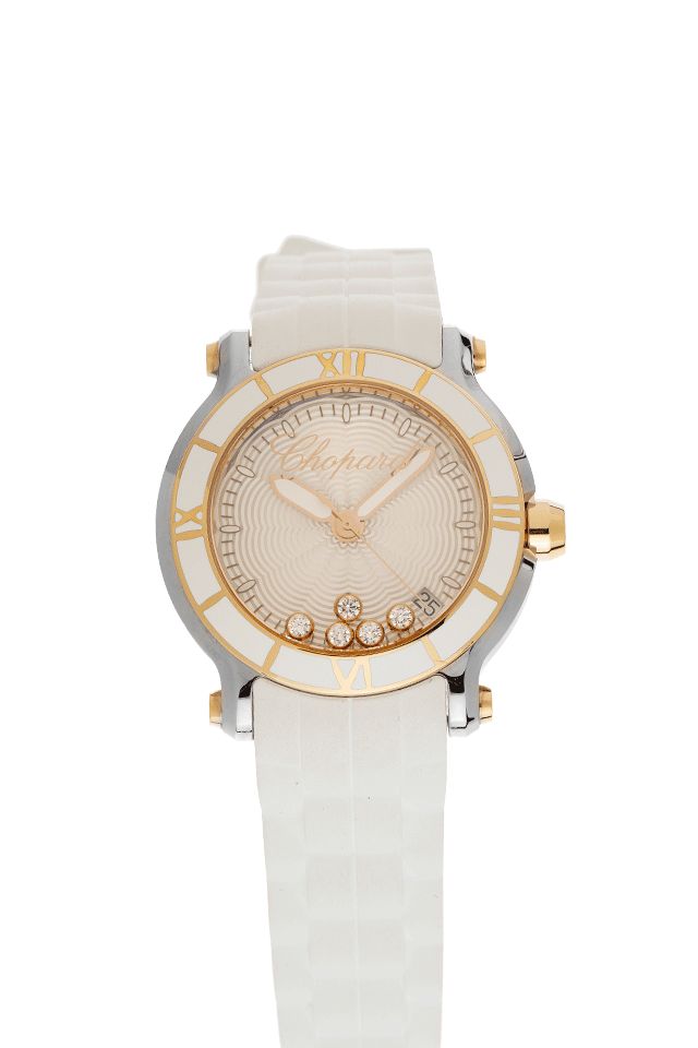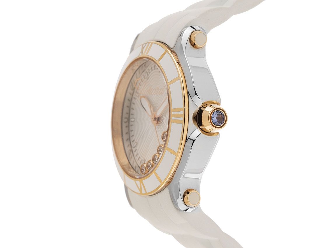 Gehäuse Edelstahl poliert, Gehäusedurchmesser ohne Krone 36mm, Gehäusehöhe 10,7mm, Lünette Gelbgold mit weißem Inlay und römischen Ziffern. Armband kautschuk weiß, Anstoßbreite 18mm, Stiftschließe Gelbgold vergoldet mit Hersteller-Logo. Zifferblatt cremeweiß guillochiert mit 5 beweglichen Brillanten, aufgesetzten Leuchtindexen und roségoldenen Zeigern. Uhrwerk quarzgesteuert, Kaliber Chopard. Anzeige von Stunde, Minute und Sekunde über Zeiger aus der Mitte mit Sekundenstopp zur sekundengenauen Einstellung der Uhrzeit, Datumsanzeige mit Schnellverstellung zwischen 4 und 5 Uhr. Saphirglas kratzfest. Krone mit Saphir Cabochon ca. 0,10ct. Boden Edelstahl 8-fach verschraubt und graviert. Gewicht der Uhr inklusive Armband 80g. Wasserdicht bis 3 ATM. Referenznummer: 278551-6002, ID: KJST2510109080523H-10200, Artikelnummer: 10000069948. Original Chopard Box und Garantie Papiere sowie Beschreibung, Full Set. Ungetragen. Lieferzeit sofort.