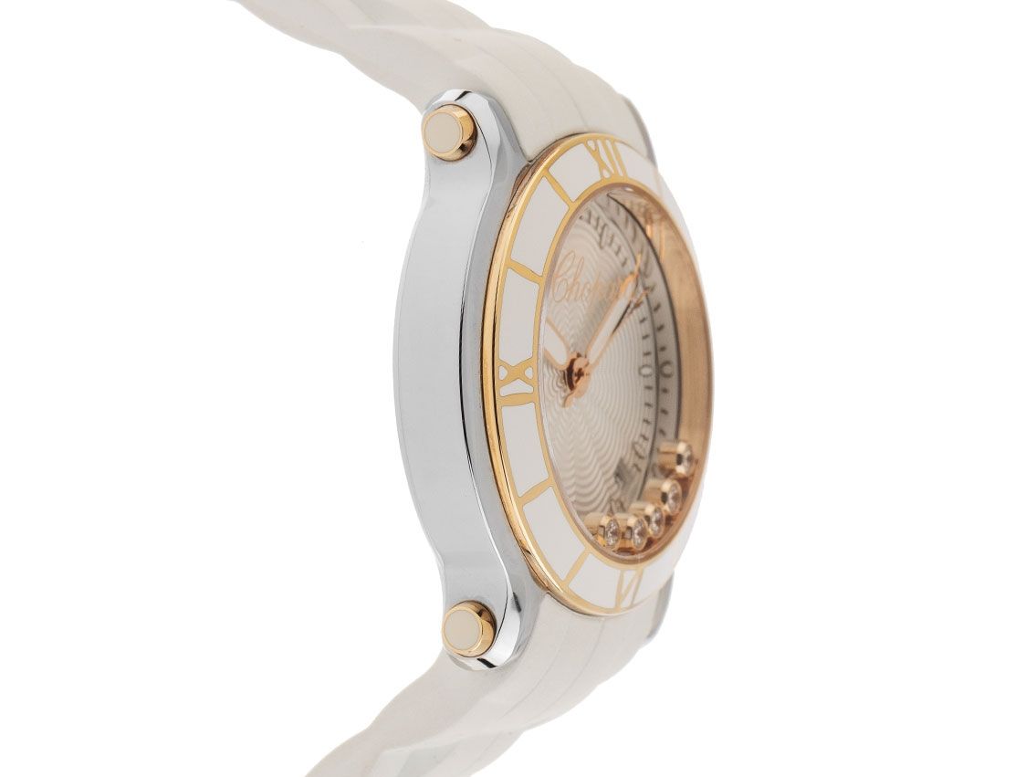 Chopard Happy Sport Luxury Stahl Gelbgold Diamanten Quarz Armband KautschukGehäuse Edelstahl poliert, Gehäusedurchmesser ohne Krone 36mm, Gehäusehöhe 10,7mm, Lünette Gelbgold mit weißem Inlay und römischen Ziffern. Armband kautschuk weiß, Anstoßbreite 18mm, Stiftschließe Gelbgold vergoldet mit Hersteller-Logo. Zifferblatt cremeweiß guillochiert mit 5 beweglichen Brillanten, aufgesetzten Leuchtindexen und roségoldenen Zeigern. Uhrwerk quarzgesteuert, Kaliber Chopard. Anzeige von Stunde, Minute und Sekunde über Zeiger aus der Mitte mit Sekundenstopp zur sekundengenaeun Einstellung der Uhrzeit, Datumsanzeige mit Schnellverstellung zwischen 4 und 5 Uhr. Saphirglas kratzfest. Krone mit Saphir Cabochon ca. 0,10ct. Boden Edelstahl 8-fach verschraubt und graviert. Gewicht der Uhr inklusive Armband 80g. Wasserdicht bis 3 ATM. Referenznummer: 278551-6002, ID: KJST2510109080523H-10200, Artikelnummer: 10000069948. Original Chopard Box und Garantie Papiere sowie Beschreibung, Full Set. Ungetragen. Lieferzeit sofort.