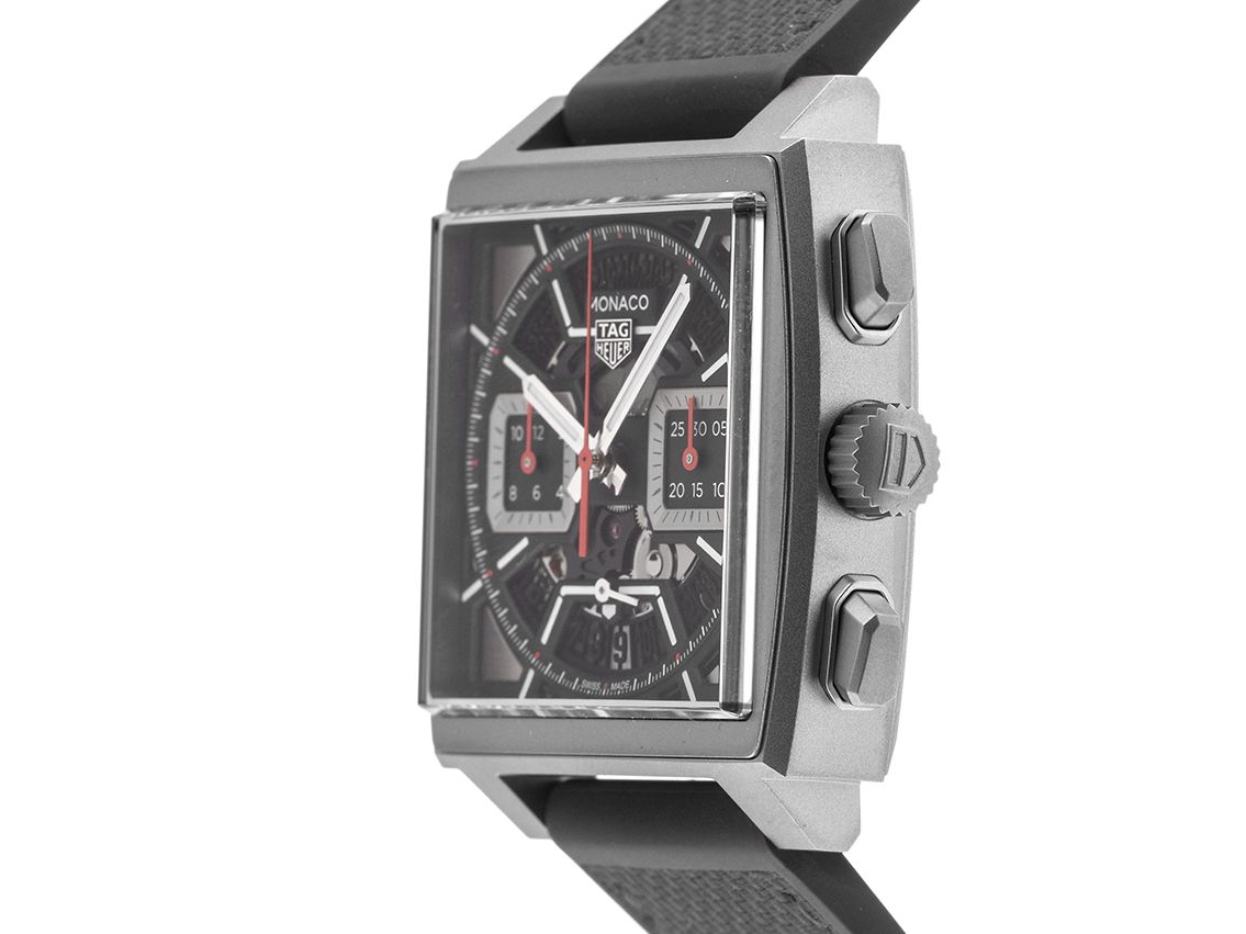 Tag Heuer Monaco Titan Automatik Chronograph Armband Kautschuk FaltschließeGehäuse Titan satiniert, rechteckig, Gehäusemaße ohne Krone (L x B x H) 39 x 39 x 15,1mm. Armband Kautschuk schwarz, Anstoßbreite 22mm, Sicherheitsfaltschließe Titan mit Hersteller-Logo. Zifferblatt schwarz skelettiert mit Leuchtindexen und Leuchtzeigern. Uhrwerk Automatik, Tag Heuer Manufakturkaliber Calibre Heuer 02 mit 33 Edelsteinen. Anzeige von Stunde und Minute über Zeiger aus der Mitte, kleine Sekunde mit Sekundenstopp zur sekundengenauen Einstellung der Uhrzeit bei 6 Uhr, Datumsanzeige mit Schnellverstellung bei 6 Uhr. Saphirglas kratzfest. Krone mit Hersteller-Logo. Boden Titan 4-fach verschraubt und graviert mit Saphirglas Sichtfenster. Gewicht der Uhr inklusive Armband 99g. Wasserdicht bis 10 ATM. Referenznummer: CBL2183.FT6236, ID: ST1160142801223H-10900, Artikelnummer: 10000072806. Original Tag Heuer Box mit Umkarton und Garantie Papiere von 12/2023, Full Set. Ungetragen. Lieferzeit sofort.