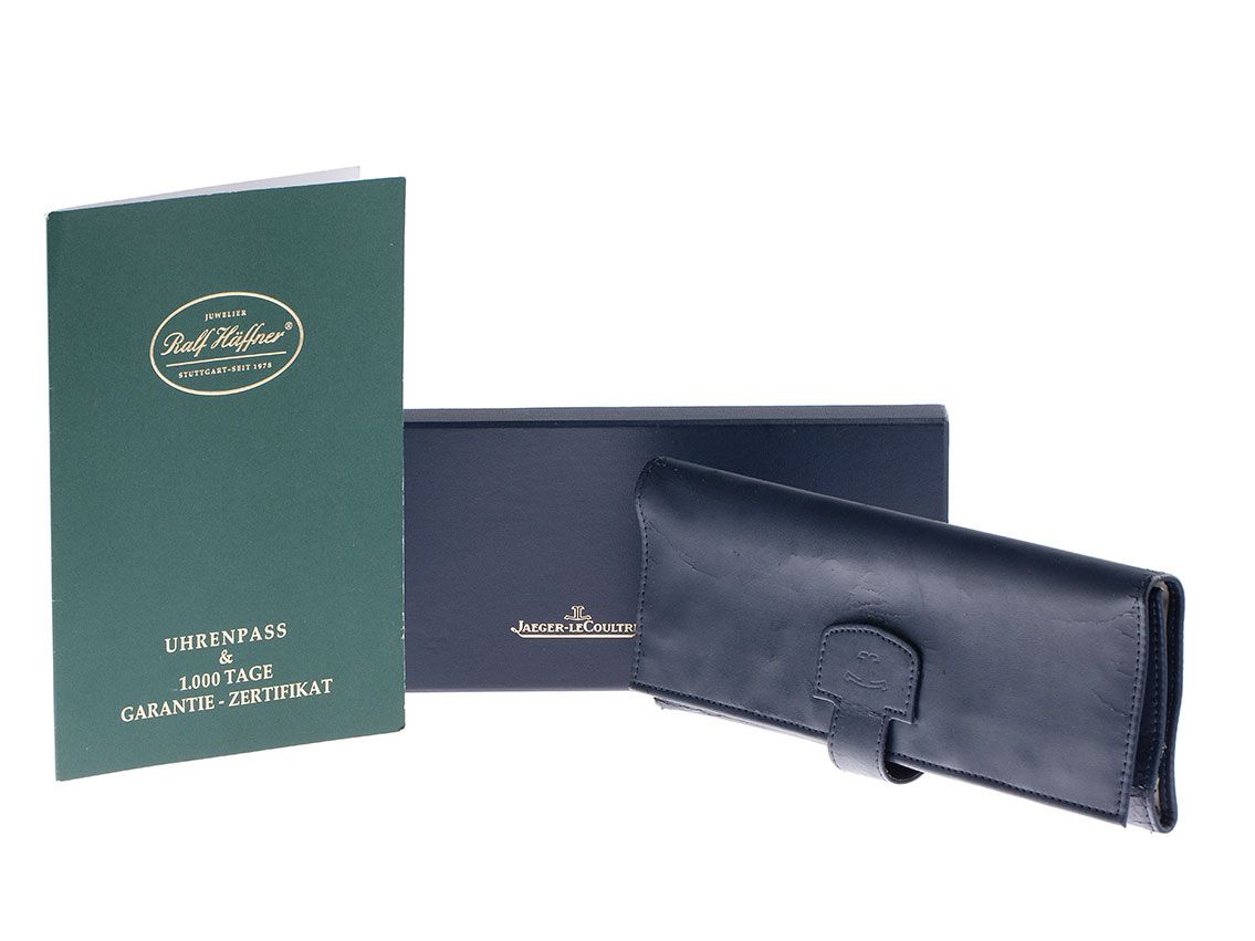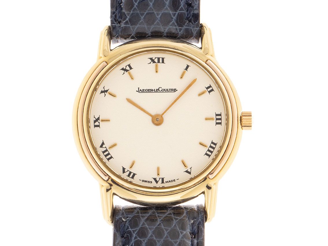 Gehäuse 18kt Gelbgold poliert, Gehäusedurchmesser ohne Krone 27mm, Gehäusehöhe 4,8mm. Lünette 18kt Gelbgold poliert. Armband Leder blau mit Ziernaht, Anstoßbreite 14mm, Stiftschließe Gelbgold vergoldet. Zifferblatt weiß mit schwarzen römischen Ziffern, aufgesetzten gelbgoldenen Indexen und gelbgoldenen Zeigern. Uhrwerk Handaufzug, Kaliber Jaeger-leCoultre 639 mit 18 Edelsteinen. Anzeige von Stunde und Minute über Zeiger aus der Mitte. Mineralglas. Krone geriffelt mit Hersteller-Logo. Boden 18kt Gelbgold 4-fach verschraubt und graviert. Gewicht der Uhr inklusive Armband 25g. Referenznummer: 163.7.79, Gehäusenummer: 0XXX, Baujahr: 1990, ID: P878236000124H-3950, Artikelnummer: 10000072932. Mit Uhrwerk Revision und kompletter äußerlicher Aufarbeitung von Januar 2024, inkl. 1000 Tage Garantie! Original Jaeger-leCoultre Box mit Umkarton und Uhrenpass. Superschnäppchen, sehr seltenes Sammlerstück, aus erster Hand, fast nicht getragen. Sehr guter Zustand. Lieferzeit sofort.