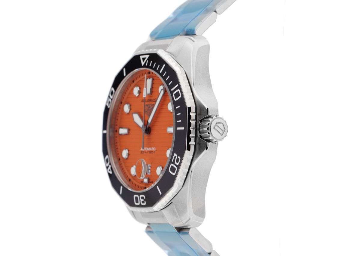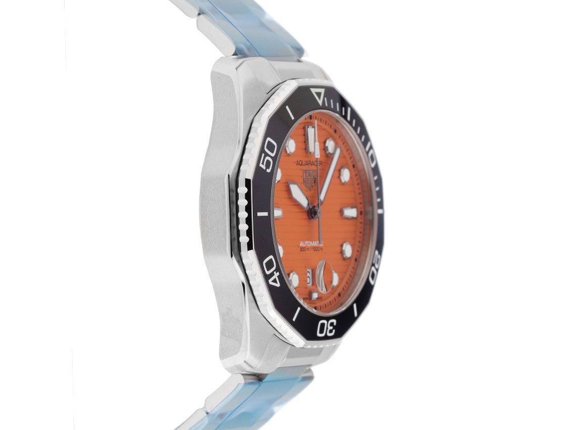 Tag Heuer Aquaracer Professional 300 Stahl Keramik Automatik Armband StahlGehäuse Edelstahl poliert und satiniert, Gehäusedurchmesser ohne Krone 43mm, Gehäusehöhe 12,5mm. Lünette Edelstahl mit schwarzem Keramik Inlay und 60-Minuten Skala, einseitig drehbar. Armband Edelstahl poliert und satiniert, Sicherheitsfaltschließe Edelstahl mit Hersteller-Logo. Zifferblatt orange mit Streifen Dekor, aufgesetzten Leuchtindexen und Leuchtzeigern. Uhrwerk Automatik, Tag Heuer Calibre 5, Gangreserve ca. 38 Stunden. Anzeige von Stunde, Minute und Sekunde über Zeiger aus der Mitte mit Sekundenstopp zur sekundengenauen Einstellung der Uhrzeit, Datumsanzeige mit Schnellverstellung bei 6 Uhr. Saphirglas kratzfest. Krone verschraubbar mit Flankenschutz und Hersteller-Logo. Boden Edelstahl und graviert. Gewicht der Uhr inklusive Armband 188g, Länge des Armbandes inkl. Gehäuse 200mm. Wasserdicht bis 30 ATM. Referenznummer: WBP201F.BA0632, ID: ST116045420624H-3550, Artikelnummer: 10000074985. Original Tag Heuer Box mit Umkarton und Garantie Papiere von 2024 sowie Beschreibung, Full Set. Ungetragen. Lieferzeit sofort.
