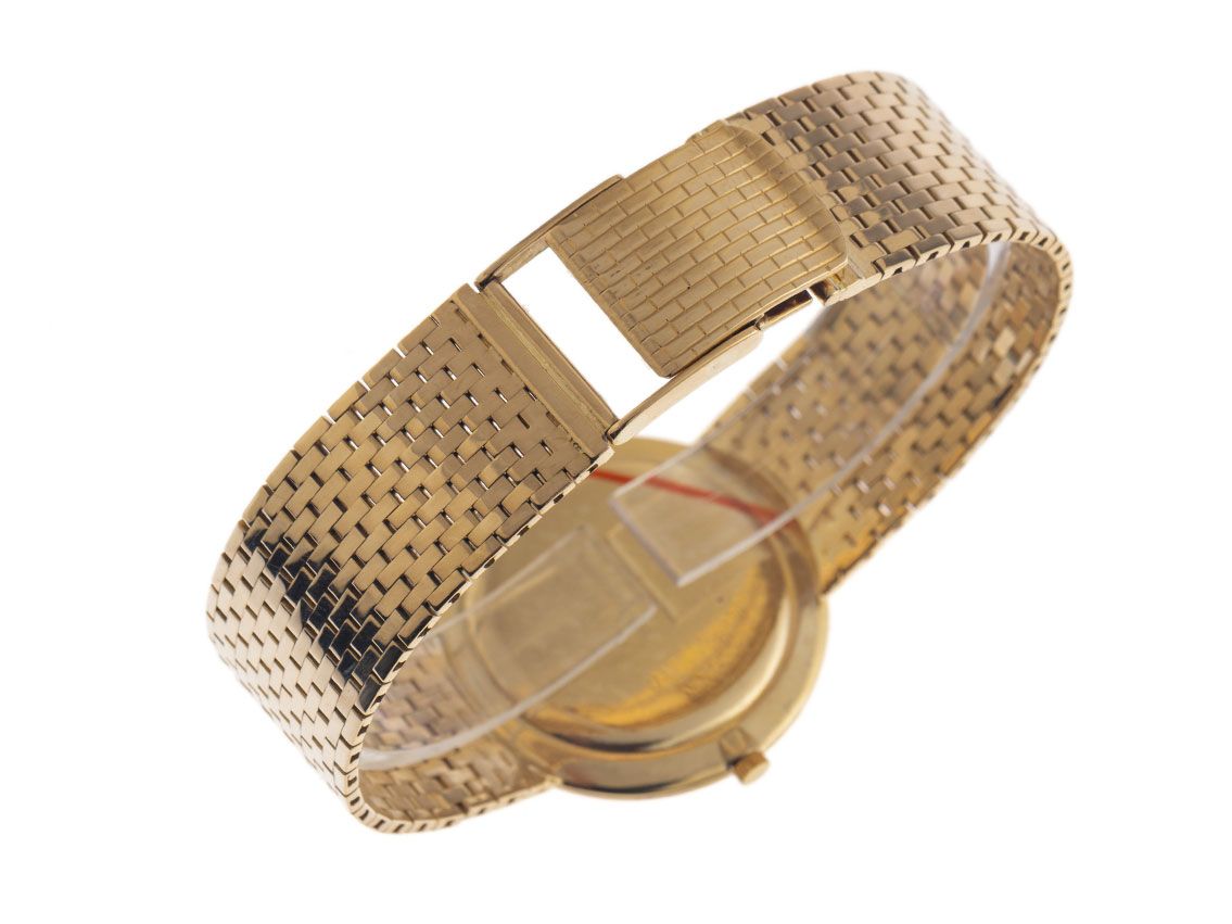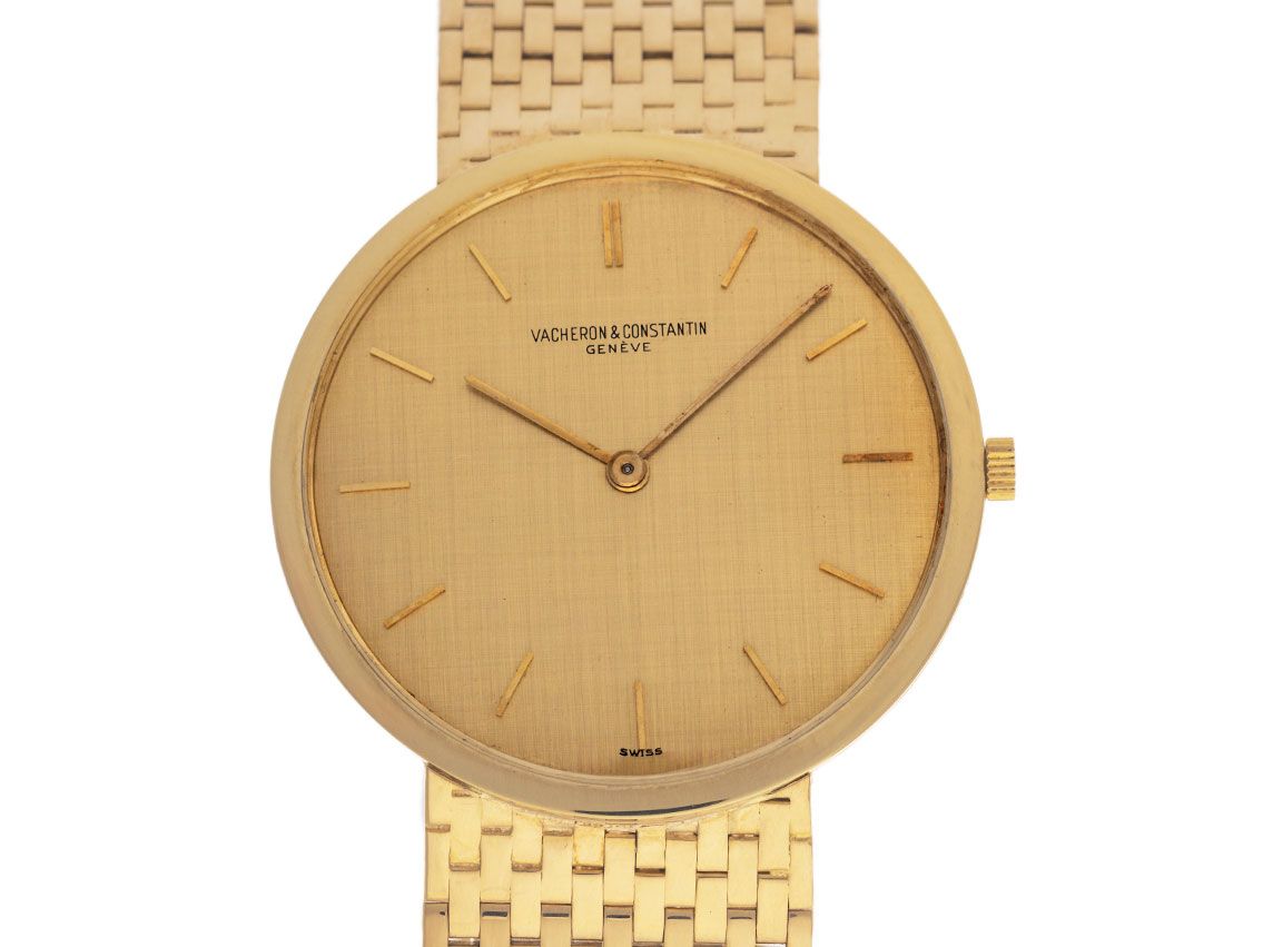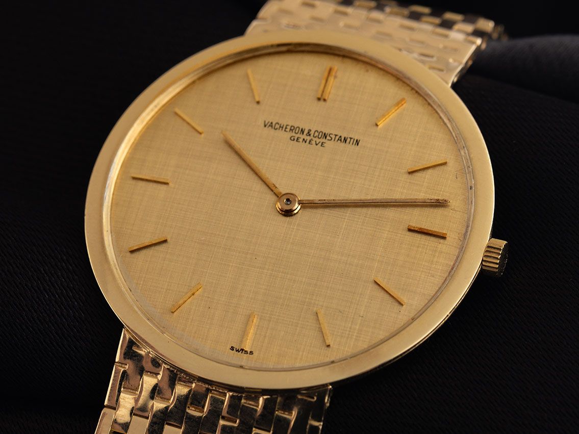 Vacheron Constantin Patrimony Ultra Thin 18kt Gelbgold Handaufzug Armband 18kt GelbgoldGehäuse 18kt Gelbgold poliert, Gehäusedurchmesser ohne Krone 33mm, Gehäusehöhe 4,3mm. Armband 18kt Gelbgold, Schließe 18kt Gelbgold. Zifferblatt champagnerfarben mit aufgesetzten gelbgoldenen Indexen und gelbgoldene Zeigern. Uhrwerk Handaufzug, Vacheron Constantin Manufakturkaliber 1003 mit 17 Edelsteinen. Anzeige von Stunde und Minute über Zeiger aus der Mitte. Plexiglas kratzfest. Krone geriffelt. Boden 18kt Gelbgold. Gewicht der Uhr inklusive Armband 76g, Länge des Armbandes inklusive Gehäuse 190mm. Referenznummer: 6115, Gehäusenummer: 376XXX, ID: P955287000724H-8500, Baujahr um 1965, Artikelnummer: 10000075611.mit Gangkontrolle und kompletter äußerlicher Aufarbeitung von Juli 2024inkl. 1000 Tagen Garantie. Original Vacheron Constantin Box und Uhrenpass. Superschnäppchen, Kapitalanlage mit Wertsteigerungspotential, extrem seltenes Sammlerstück. Sehr guter Zustand. Lieferzeit sofort.