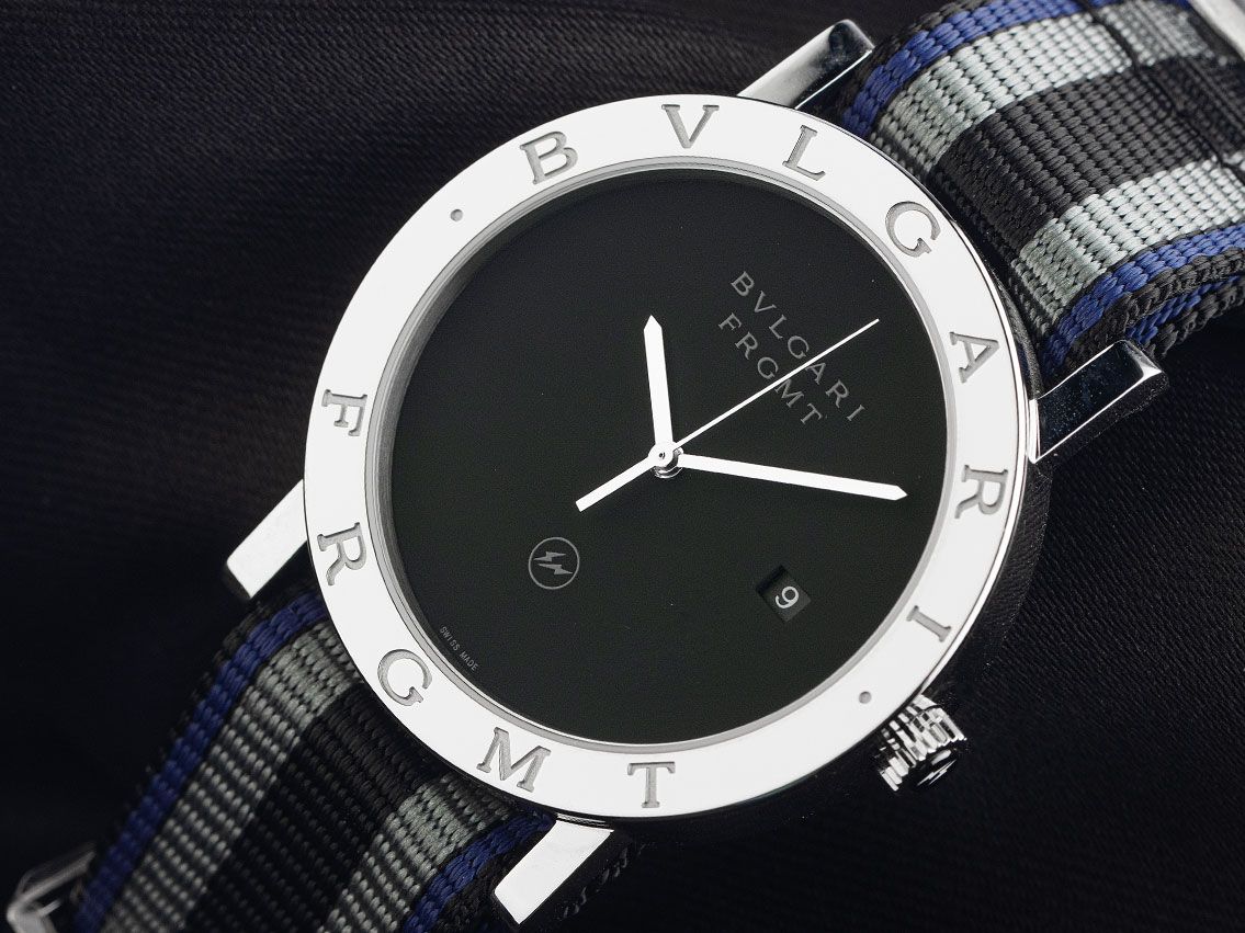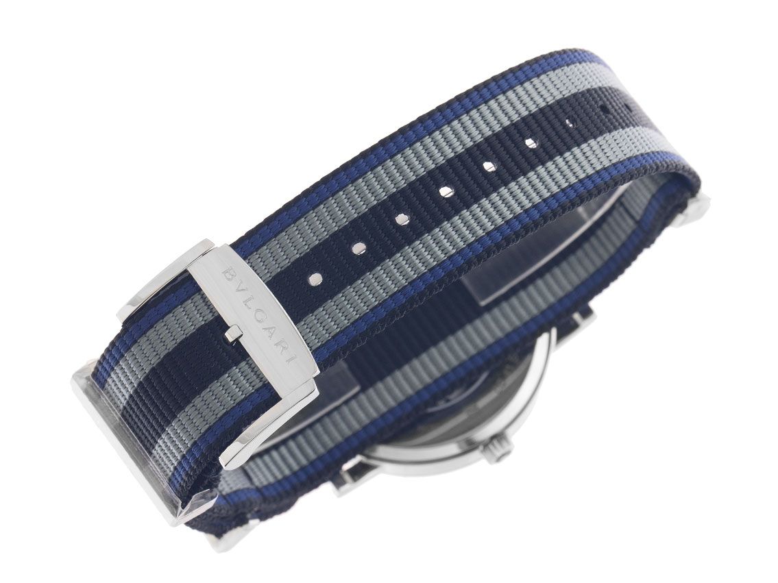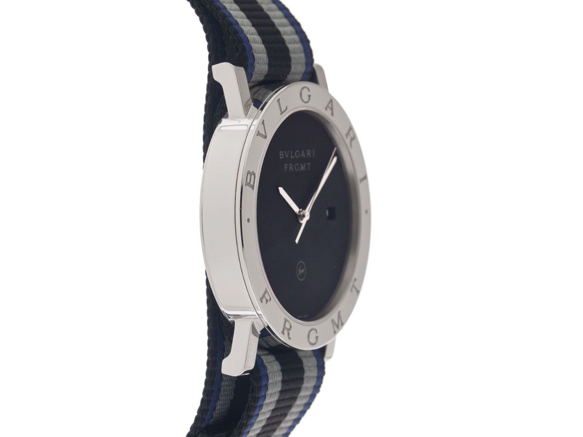 Gehäuse Edelstahl poliert, Gehäusedurchmesser ohne Krone 40mm, Gehäusehöhe 9,0mm. Lünette Edelstahl mit Bulgari / FRGMT Gravur. Armband Textil schwarz / blau / grau, Anstoßbreite 22mm, Stiftschließe Edelstahl mit Hersteller-Logo. Zifferblatt schwarz matt mit polierten Edelstahl Zeigern. Uhrwerk Automatik, Bulgari Kaliber BVL 191 mit 26 Edelsteinen, Gangreserve ca. 42 Stunden. Anzeige von Stunde, Minute und Sekunde über Zeiger aus der Mitte mit Sekundenstopp zur sekundengenauen Einstellung der Uhrzeit, Datumsanzeige mit Schnellverstellung bei 3 Uhr. Saphirglas kratzfest. Krone geriffelt. Boden Edelstahl graviert mit Saphirglas Sichtfenster. Gewicht der Uhr inklusive Armband 86g. Referenznummer: 103570, ID: ST116070640824H-5500, Artikelnummer: 10000075833. Original Bulgari Box mit Umkarton und Garantie Papiere von Juli 2024, Full Set. Ungetragen. Lieferzeit sofort.