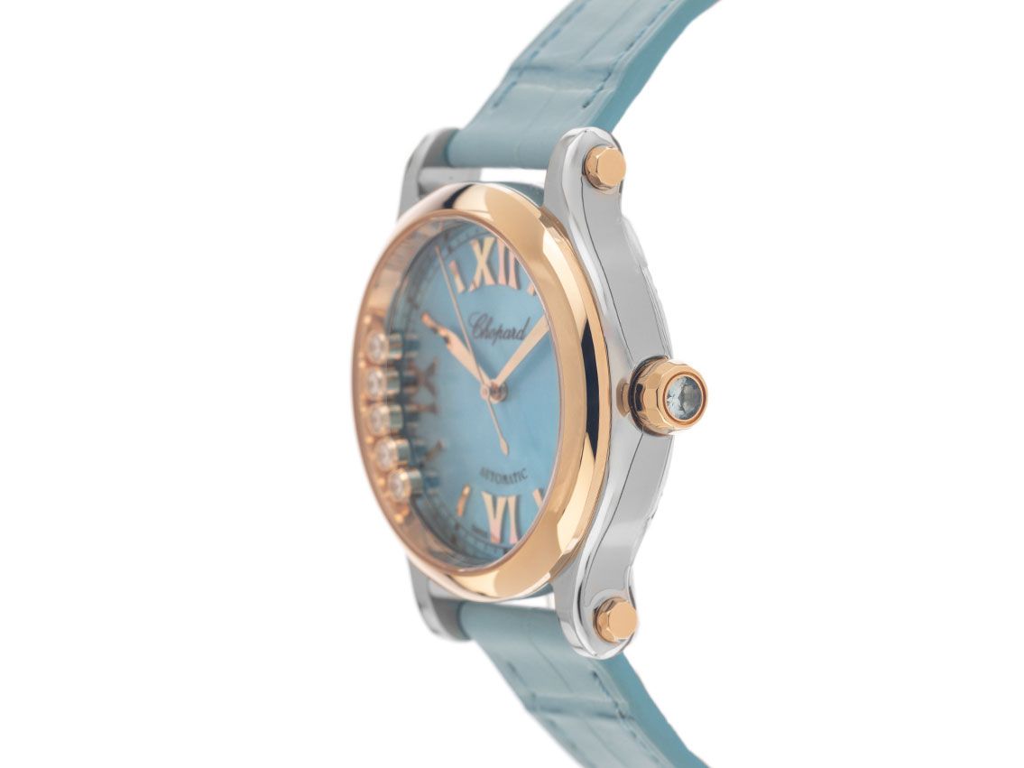 Chopard Happy Sport Stahl 18kt Roségold Diamanten Automatik Armband LederGehäuse Edelstahl / 18kt Roségold poliert und satiniert, Gehäusedurchmesser ohne Krone 33mm, Gehäusehöhe 10,84mm. Lünette 18kt Roségold glatt und poliert. Armband Leder türkis mit Ziernaht, Anstoßbreite 16mm, Stiftschließe Edelstahl mit Hersteller-Logo. Zifferblatt Perlmutt türkis mit 5 beweglichen in 18kt Weißgold gefassten Diamanten, zusammen ca. 0,25ct, aufgesetzten roségoldenen römischen Ziffern und roségoldenen Zeigern. Uhrwerk Automatik, Kaliber Chopard 09.01-C mit 27 Edelsteinen, Gangreserve ca. 42 Stunden. Anzeige von Stunde, Minute und Sekunde über Zeiger aus der Mitte mit Sekundenstopp zur sekundengenauen Einstellung der Uhrzeit. Saphirglas kratzfest. Krone mit Aquamarin. Boden Edelstahl 6-fach verschraubt und graviert mit Saphirglas Sichtfenster. Wasserdicht bis 3 ATM. Gewicht der Uhr inklusive Armband 47g. Referenznummer: 278608-6013 , ID: ST1160158600924H-12100, Artikelnummer: 10000076468. Original Chopard Box mit Umkarton und Garantie Papiere von September 2024 sowie Beschreibung, Full Set. Ungetragen. Lieferzeit sofort.