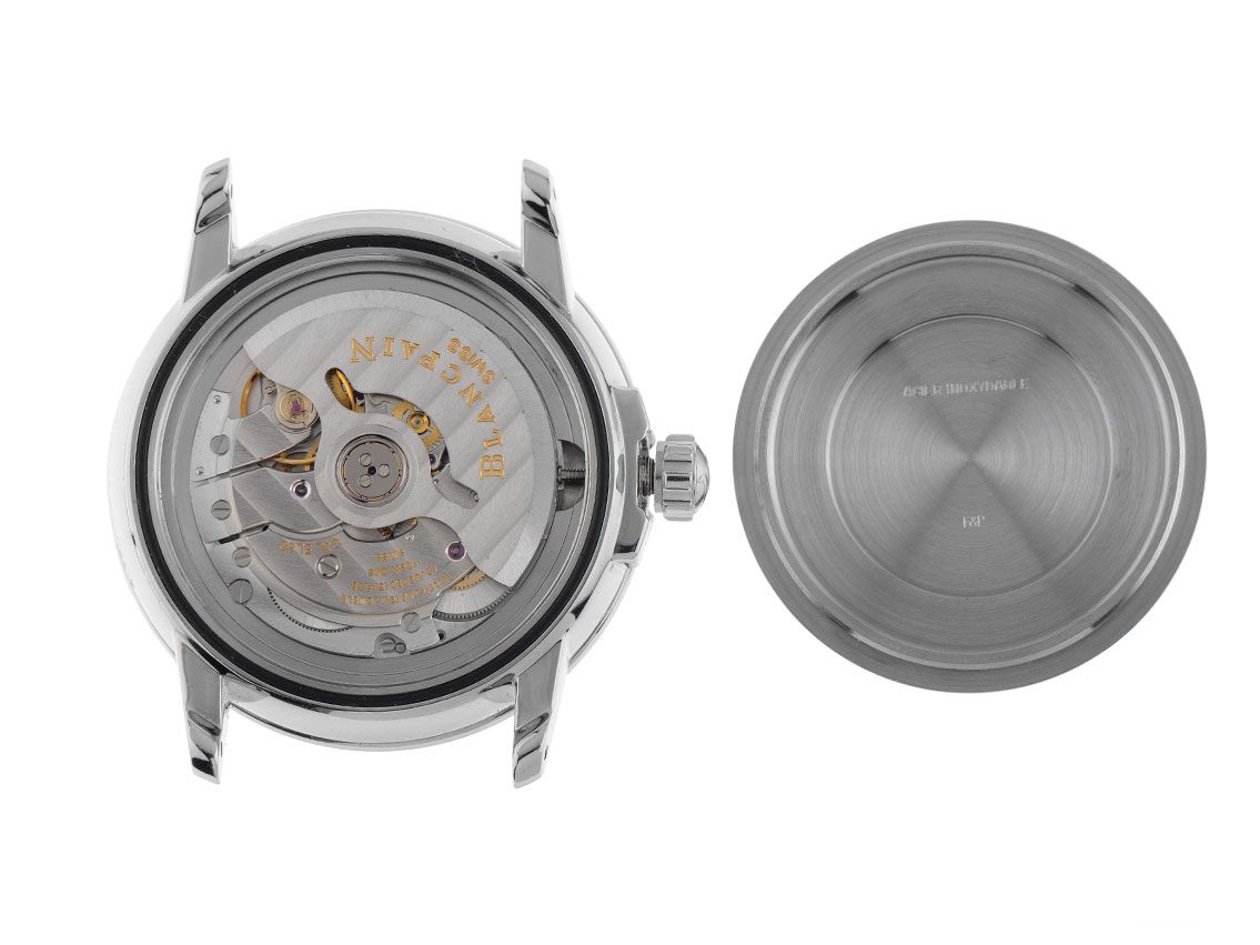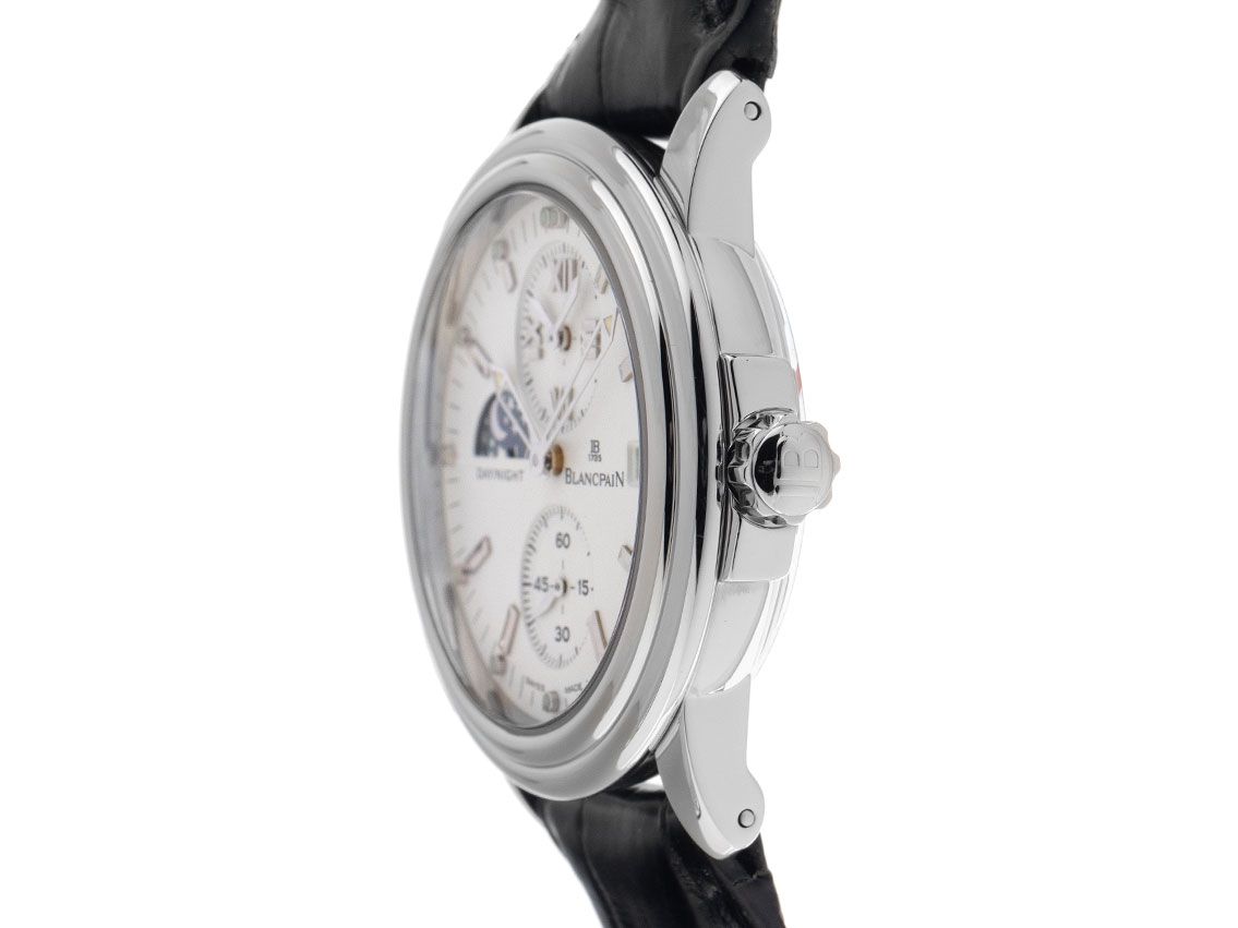 Gehäuse Edelstahl poliert, Durchmesser ohne Krone 38mm, Gehäusehöhe 11,6mm. Lünette Edelstahl glatt und poliert. Armband Leder schwarz mit Ziernaht, Anstoßbreite 20mm, Stiftschließe Edelstahl mit Hersteller-Logo. Zifferblatt weiß mit aufgesetzten Edelstahl Indexen und Edelstahl Zeigern. Uhrwerk Automatik, Kaliber Blancpain 5L60 mit 31 Edelsteinen. Anzeige von Stunde und Minute über Zeiger aus der Mitte, kleine Sekunde bei 6 Uhr, Datumsanzeige mit Schnellverstellung bei 3 Uhr, zweite Zeitzone bei 12 Uhr, Tag- und Nachtanzeige bei 9 Uhr. Saphirglas kratzfest und gewölbt. Krone verschraubbar mit Hersteller-Logo. Boden Edelstahl verschraubt und graviert. Gewicht der Uhr inklusive Armband 64g. Referenznummer: 2160-1127-53, Gehäusenummer: 1XXX, Baujahr: 2002, ID: P036280000125H-9800, Artikelnummer: 10000078154. Mit Uhrwerk Revision und kompletter äußerlicher Aufarbeitung von Januar 2025, inkl. 1000 Tage Garantie. Original Blancpain Box mit Umkarton und Uhrenpass. Superschnäppchen, sehr seltenes Sammlerstück, fast nicht getragen. Wie Neu. Lieferzeit sofort.