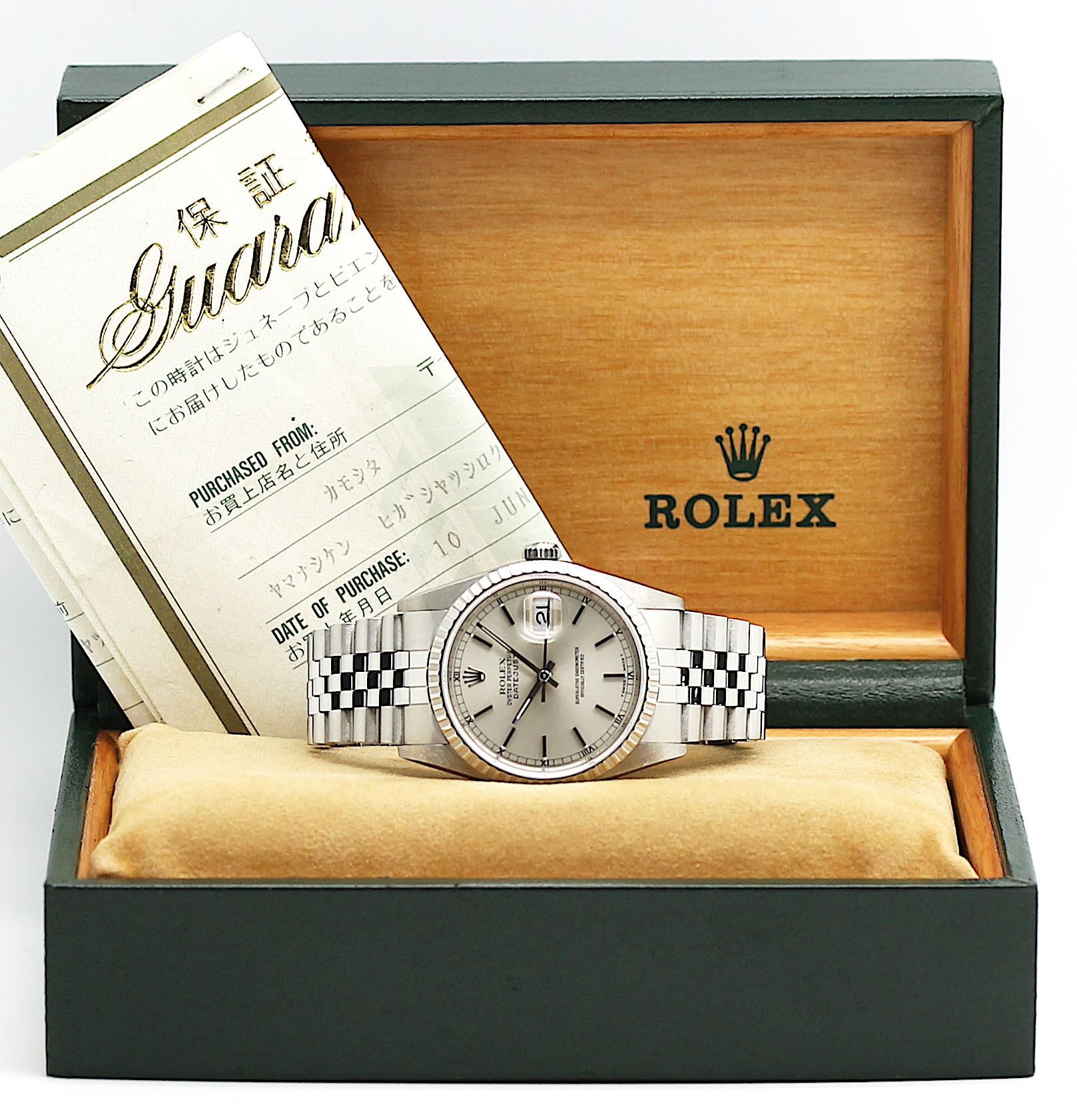 Die Uhr befindet sich in einem dem Alter entsprechend guten Zustand. Sie ist mit einem Automatikwerk ausgestattet. Eine Bereicherung für jeden Uhrensammler und Liebhaber. Alle Funktionen wurden vom Uhrmachermeister überprüft und für einwandfrei befunden. Das Werk wurde im April 2025 geölt und gereinigt. Das Jubileeband ist in Stahl und gebraucht, aber in einem noch sehr guten Zustand ( 16.5 cm Länge ohne Uhr gemessen ). Sie bieten hier auf eine Wunderschöne und klassische Armbanduhr der Spitzenklasse mit Wiedererkennungswert. Saphirglas . Das Zifferblatt ist silber - farbig. Die Lünette ist aus Edelstahl und geriffelt. Die Datejust Uhr ist ca 35 Jahre alt, und wird in einem gebrauchten Zustand verkauft.Rolex Box & Papiere ( LC 900 ) sind vorhanden.