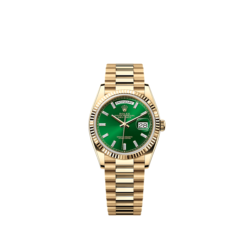 Rolex Day-Date 36 Rolex 128238-0130 - Day-Date 36 Yellow Gold / Fluted / Bright Green - Baguette / President