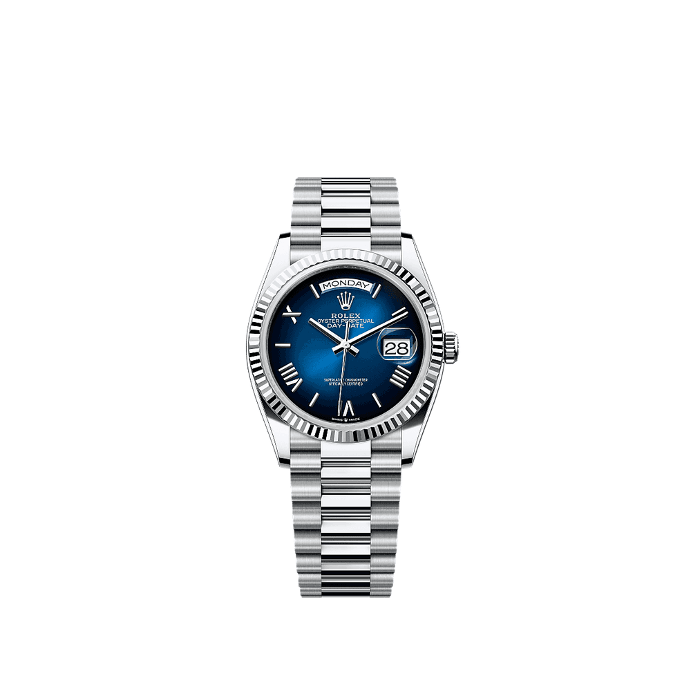 Rolex 128236-0020 - Day-Date 36 Platin - geriffelt / Blau Ombr̩ - Römer / Präsident