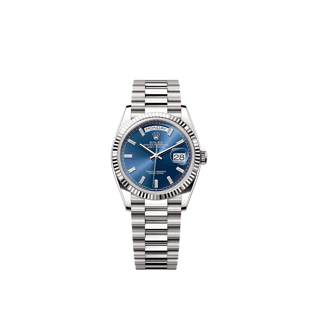 Rolex 128239-0069 - Day-Date 36 White Gold - Fluted / Bright Blue - Baguette / President