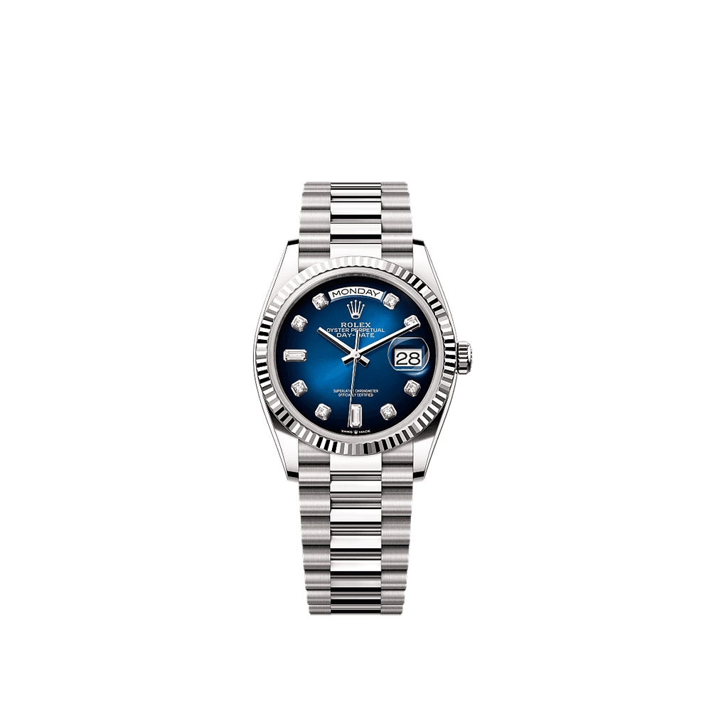 Rolex 128239-0023 Day-Date 36 Weißgold / geriffelt / Blauer Ombre-Diamant / Präsident
