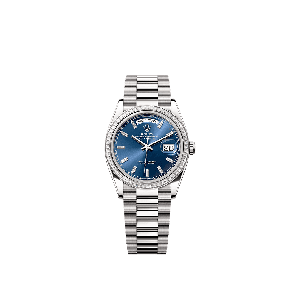 Rolex 128399TBR-0027 - Day-Date 36 White Gold - Baguette / Bright Blue - Baguette / President