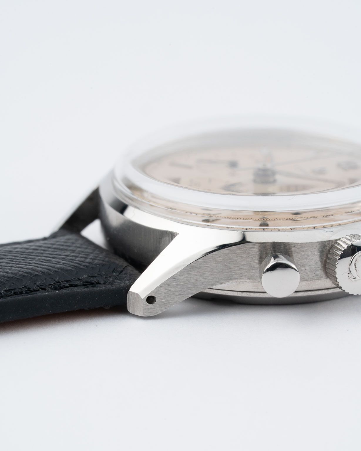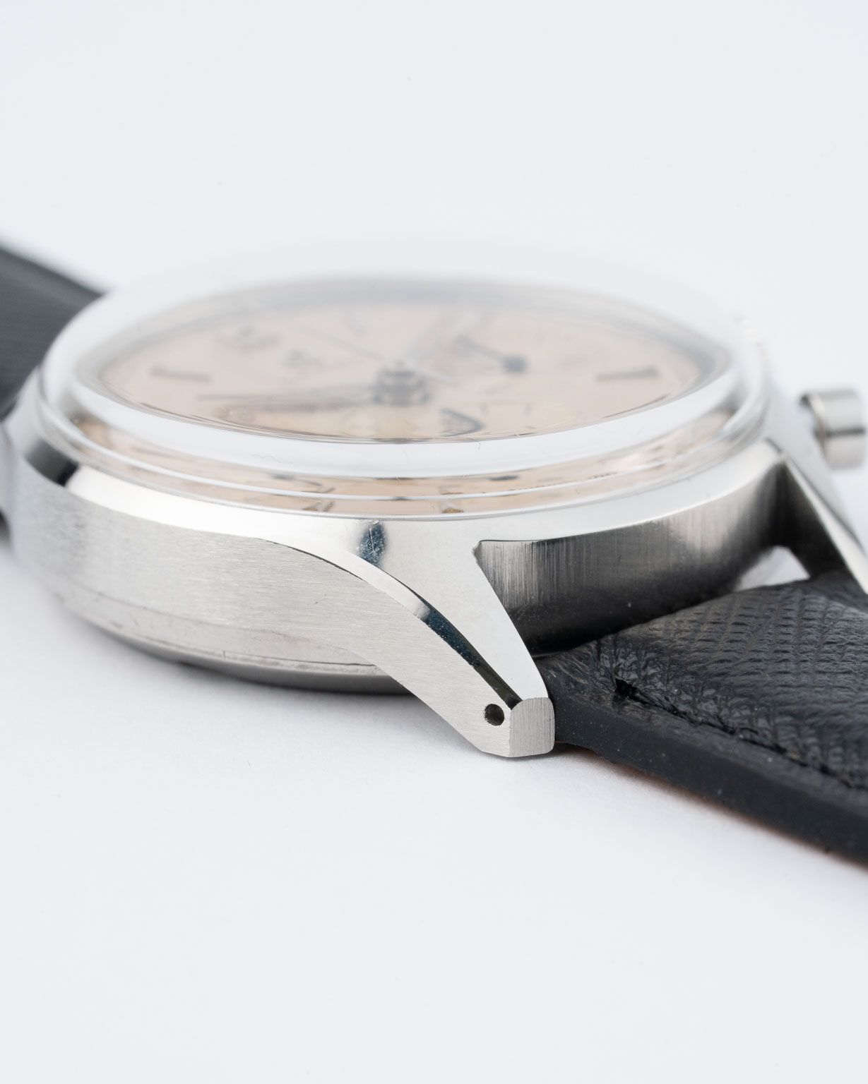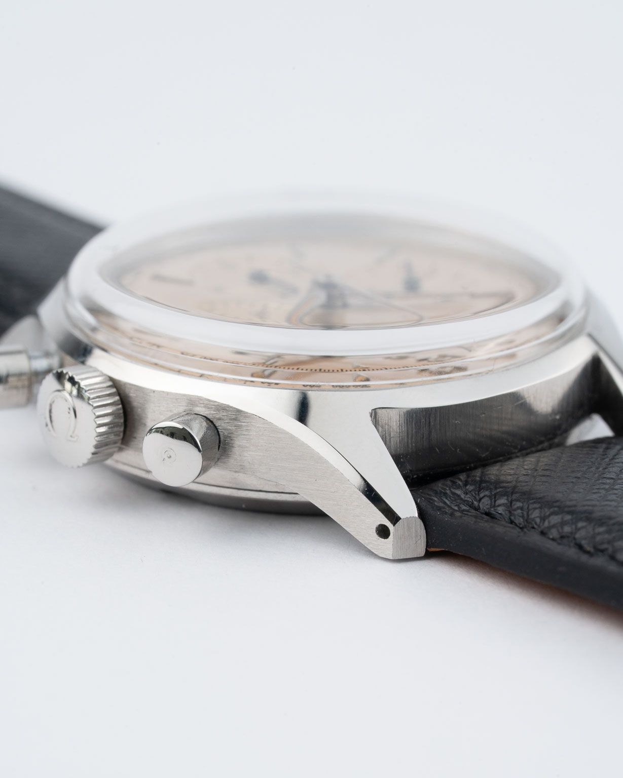 Das Herzstück dieses Chronographen, das berühmte Kaliber 321 von Omega, ist ein Uhrwerk von historischer Bedeutung, das den Wert der Uhr für Liebhaber unterstreicht. Das Kaliber 321, das von den 1940er bis zu den 1960er Jahren die Chronographen von Omega antrieb, darunter auch die NASA-zertifizierten Uhren für die Apollo-Mondmissionen, wird für seinen Säulenradmechanismus geschätzt, der für seine reibungslose Funktion und zuverlässige Präzision gelobt wird. Das Erbe dieses Uhrwerks hat es zu einem der begehrtesten Vintage-Chronographenkaliber gemacht, zumal Omega seine Produktion 1968 einstellte, was jedes Modell mit diesem Kaliber zu einer Rarität macht. Das nach heutigen Maßstäben kompakte 35-mm-Gehäuse verkörpert die Designvorlieben der damaligen Zeit und umrahmt das Zifferblatt mit subtilen, fein gearbeiteten Bandanstößen, die die Uhr im Gleichgewicht am Handgelenk halten.