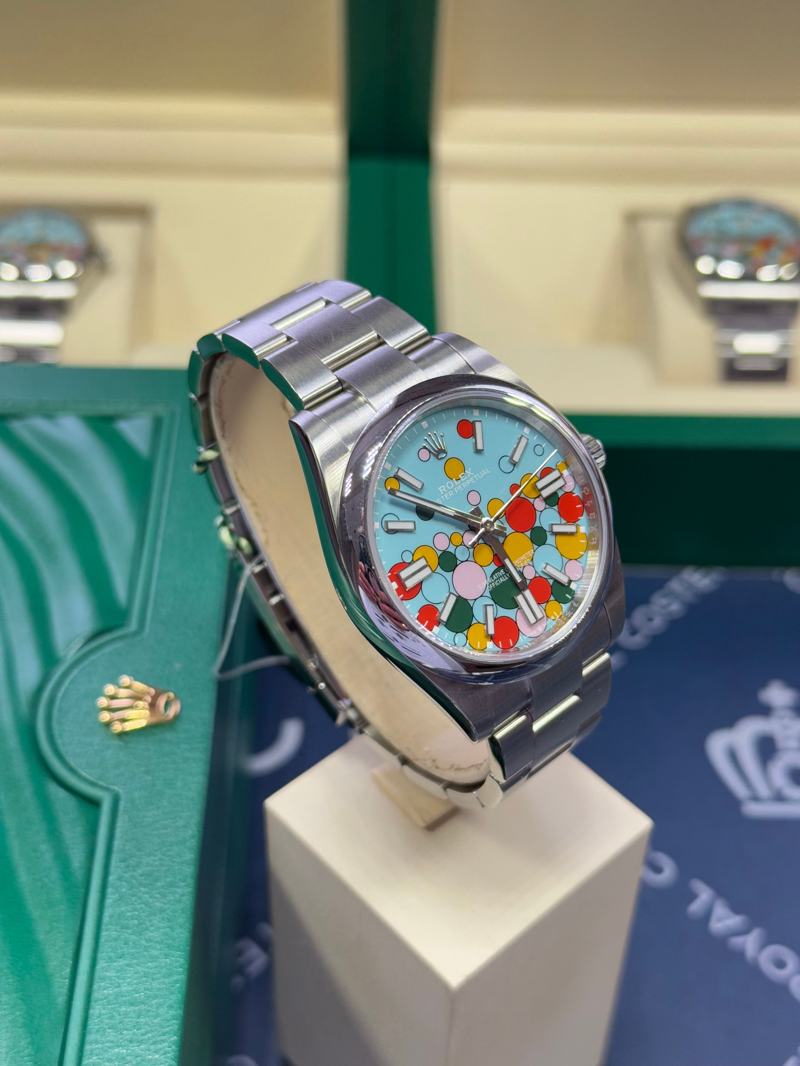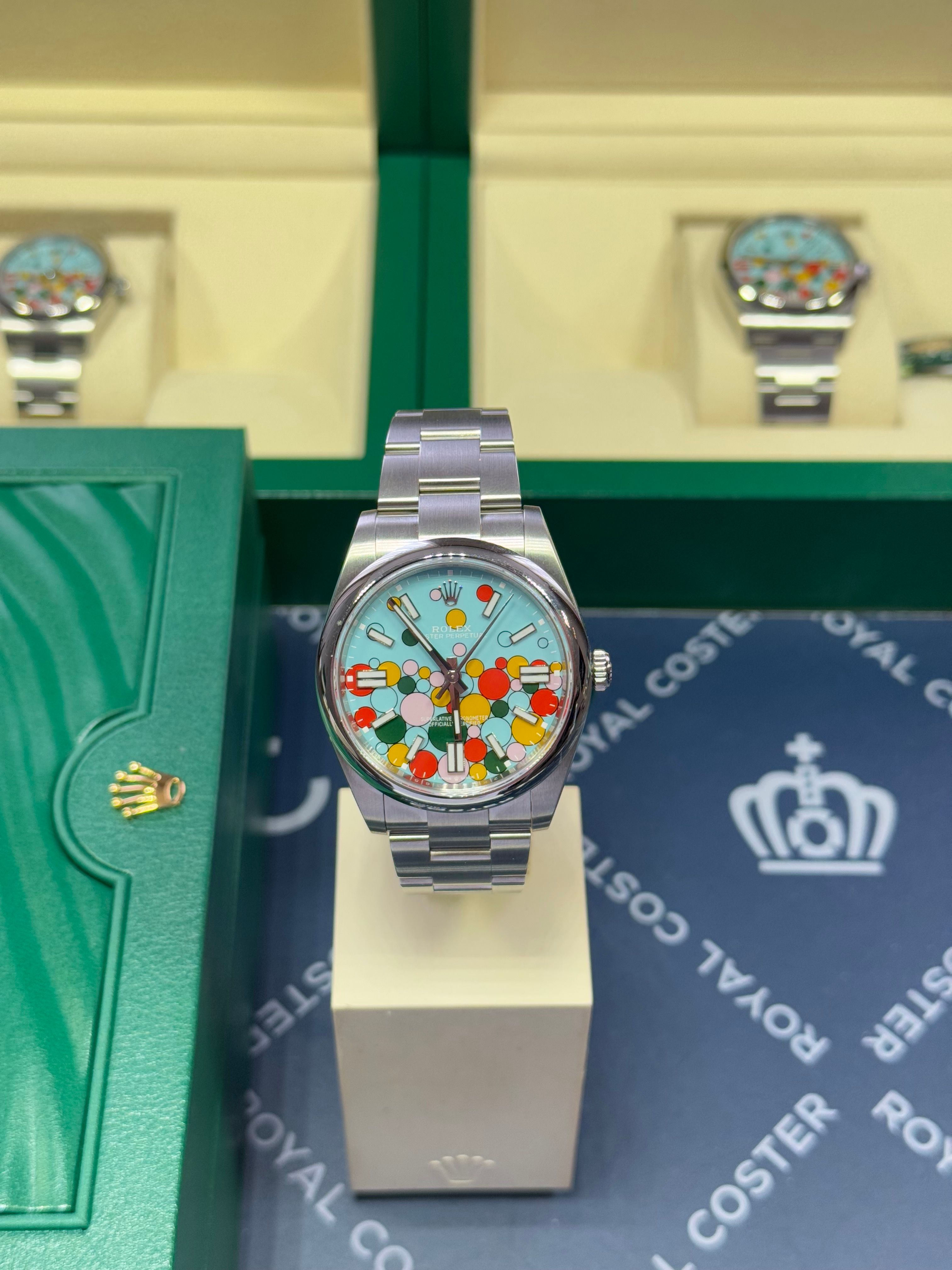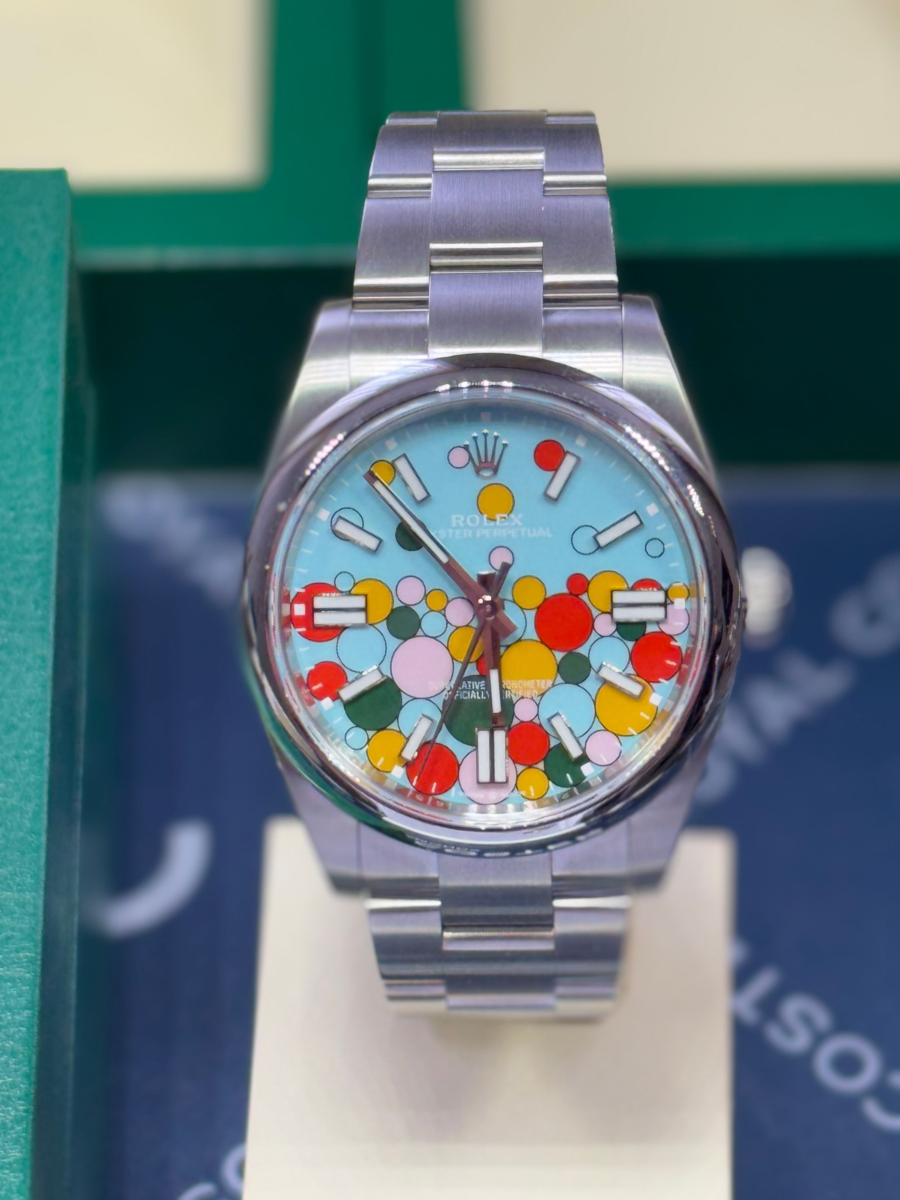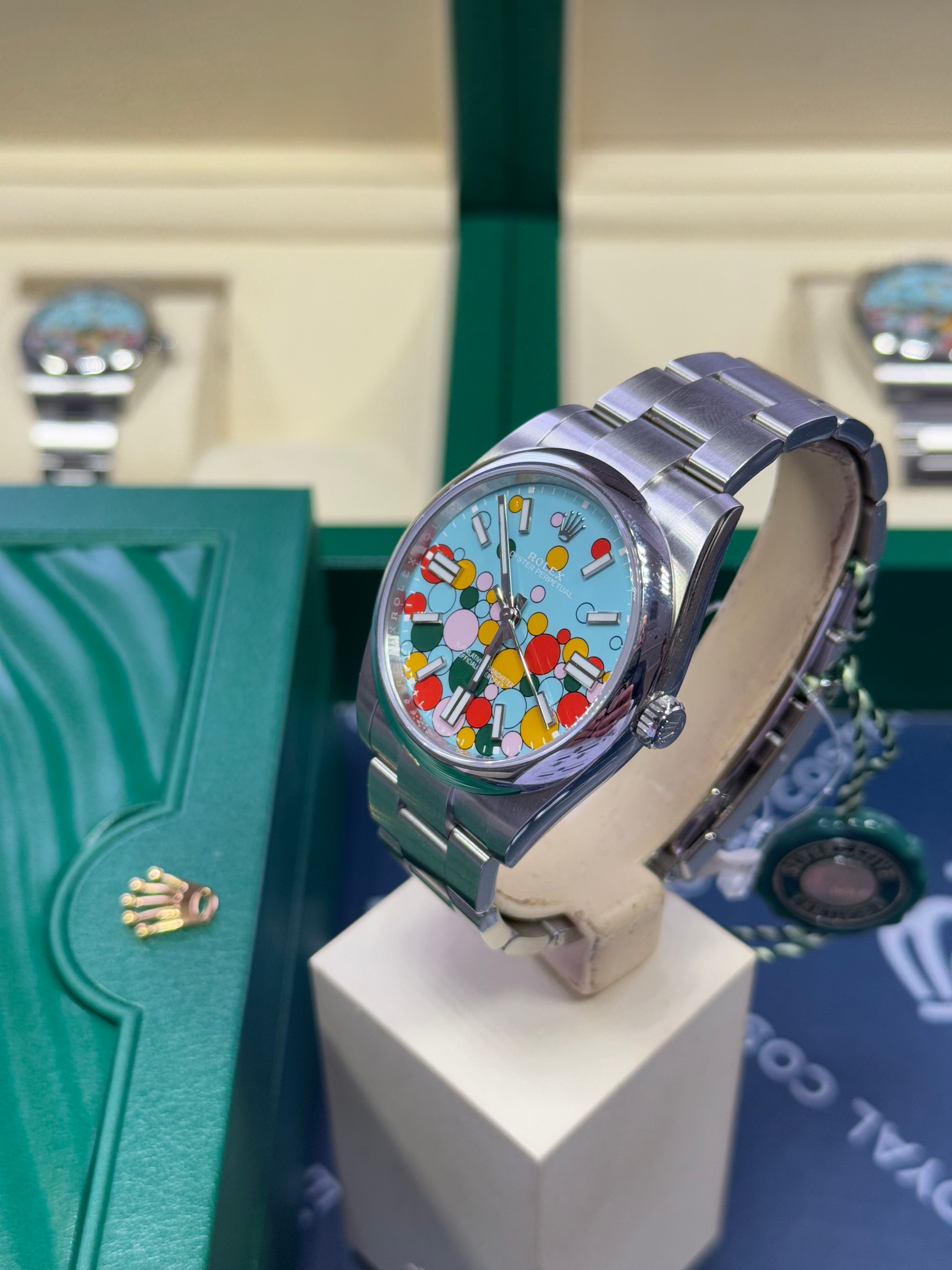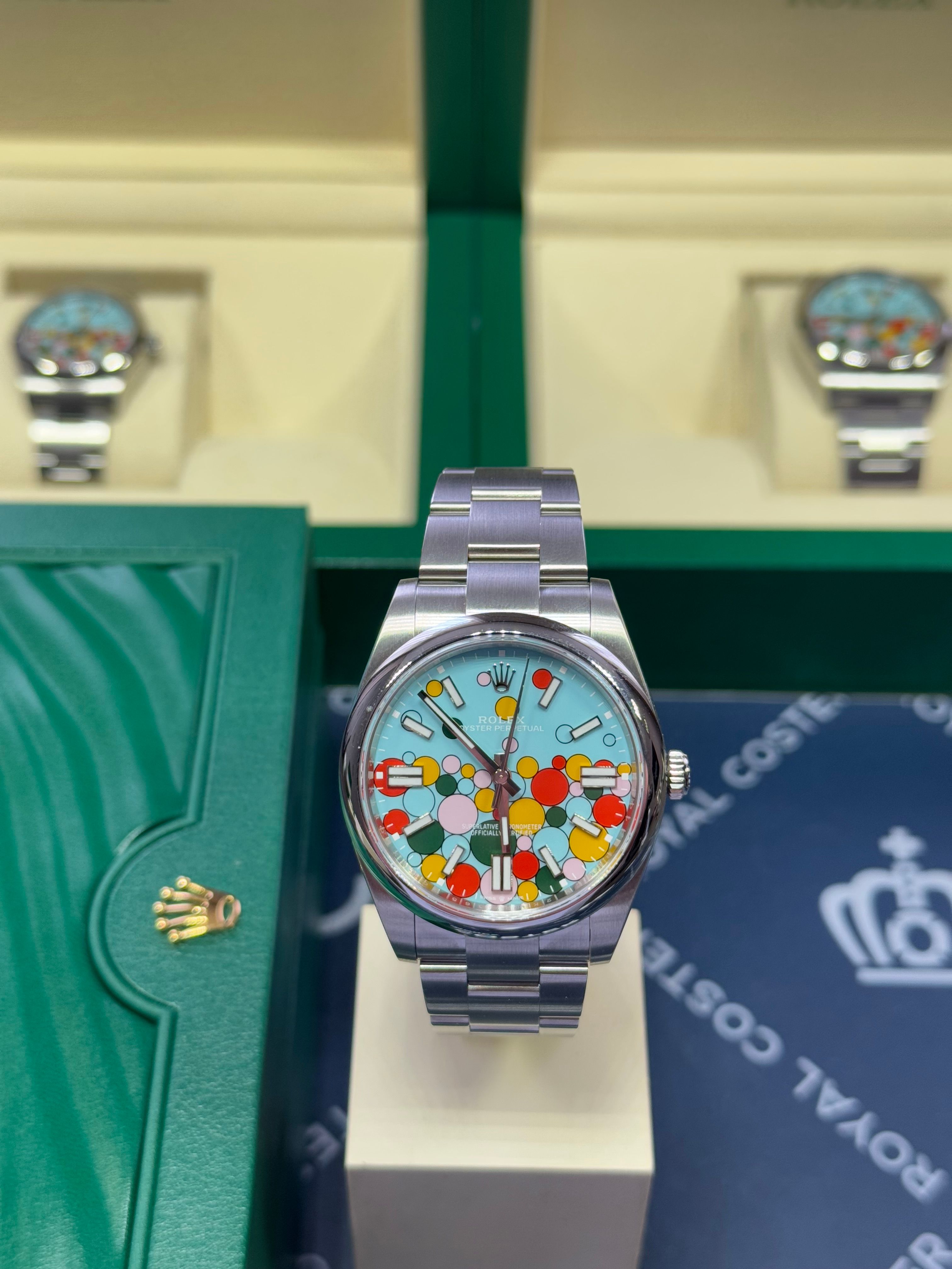 The discontinued "Celebrations" OP 124300 in 41mm. Most colors for the buck. This dial has all the dial colors that Rolex delivered on the OPs until spring 2025. They are now taken of the Rolex website, and it is not possible to purchase anymore other than the second hand market. This watch is new and all complete and we offer it for the best price on Wristler and that other site. The guarantee card has been stamped in September of 2024.The watch can be ordered and picked up at Wristler or at Royal Coster Diamonds in Amsterdam (on the Museumplein). Let us know what your preference is so we can make sure the watch is at the correct location.