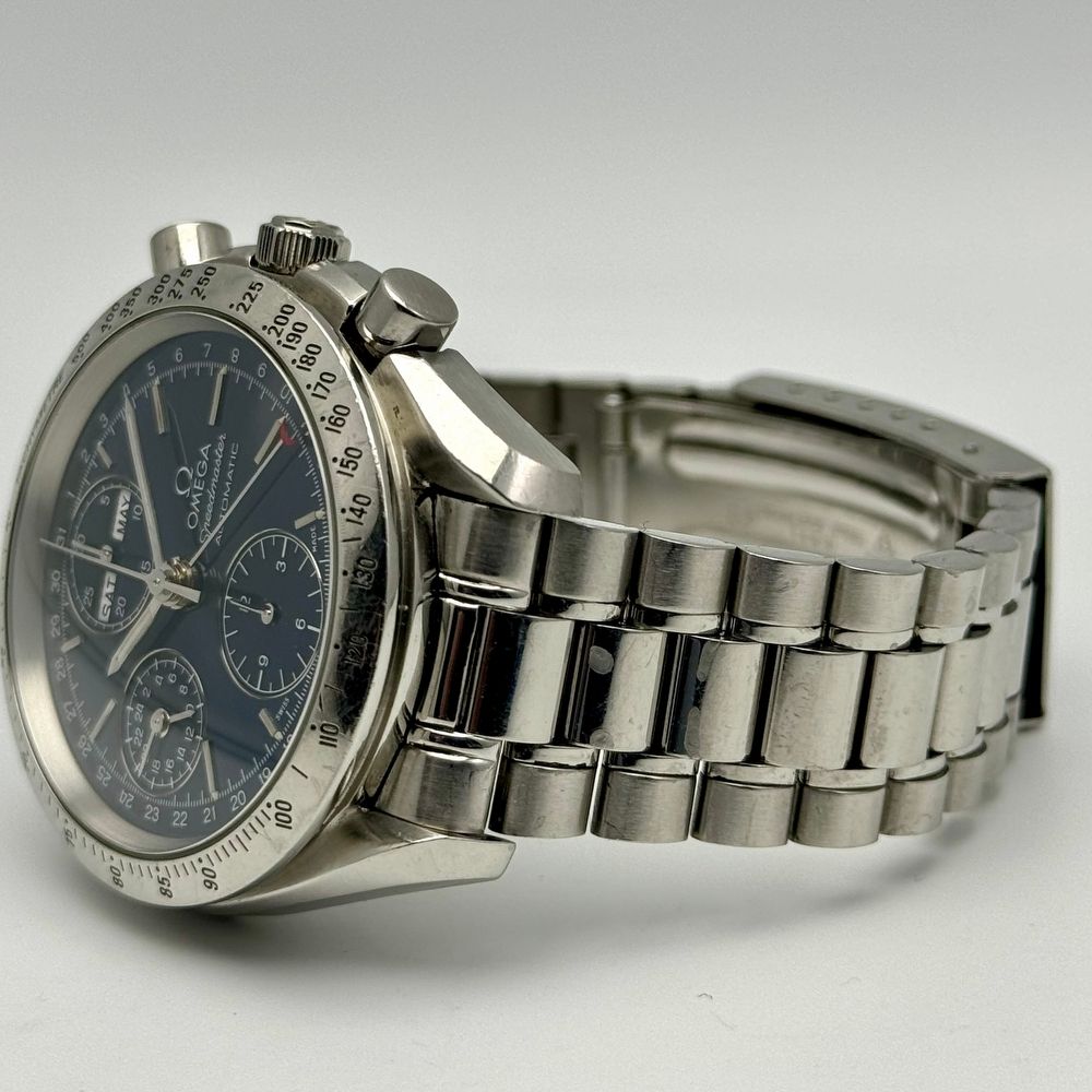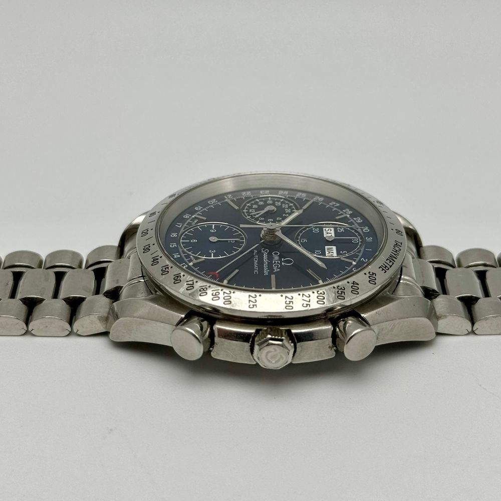 Omega Speedmaster Triple Date 3521.80.00 Men's Watch. 39mm stainless steel case with a stationary tachymeter bezel and black bezel insert. Blue dial with luminous hands and index markers. Triple date function with a day of the week and month indicator at 12 o'clock position, date indicator on the outer dial. The chronograph subdials display seconds, minutes, and hours. Stainless steel bracelet with a hidden fold-over clasp. Caliber 1151 automatic self-winding movement with 44-hour power reserve.This Speedmaster was well taken care of in the years of its life. Comes in the Omega service box ad a full service from April 2025 with 1 year warranty. Lovely Speedmaster! We are proud to offer a two-year warranty on every Rolex watch offered by us. Other brands come with a one-year warranty unless otherwise mentioned. The warranty includes the functioning of the watch including the functioning of any present complications. Excluded from the warranty are: water damage, turn and push buttons, crystal, watch strap and clasp.