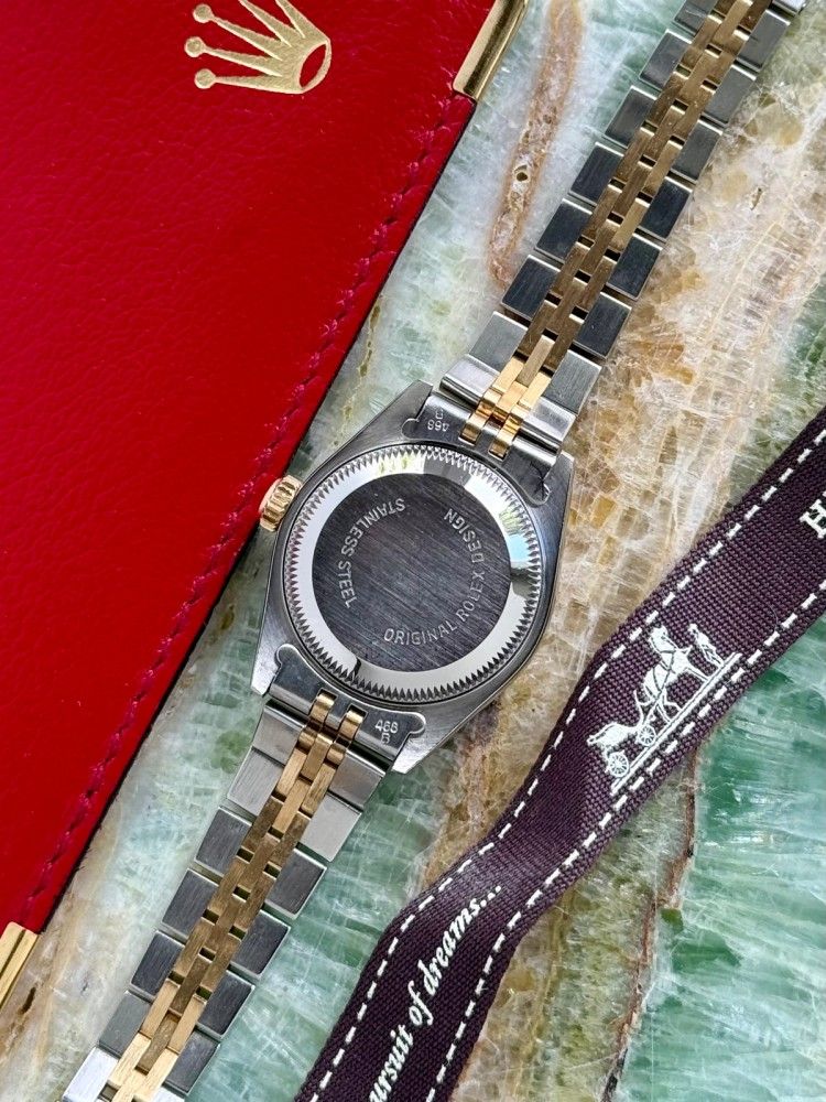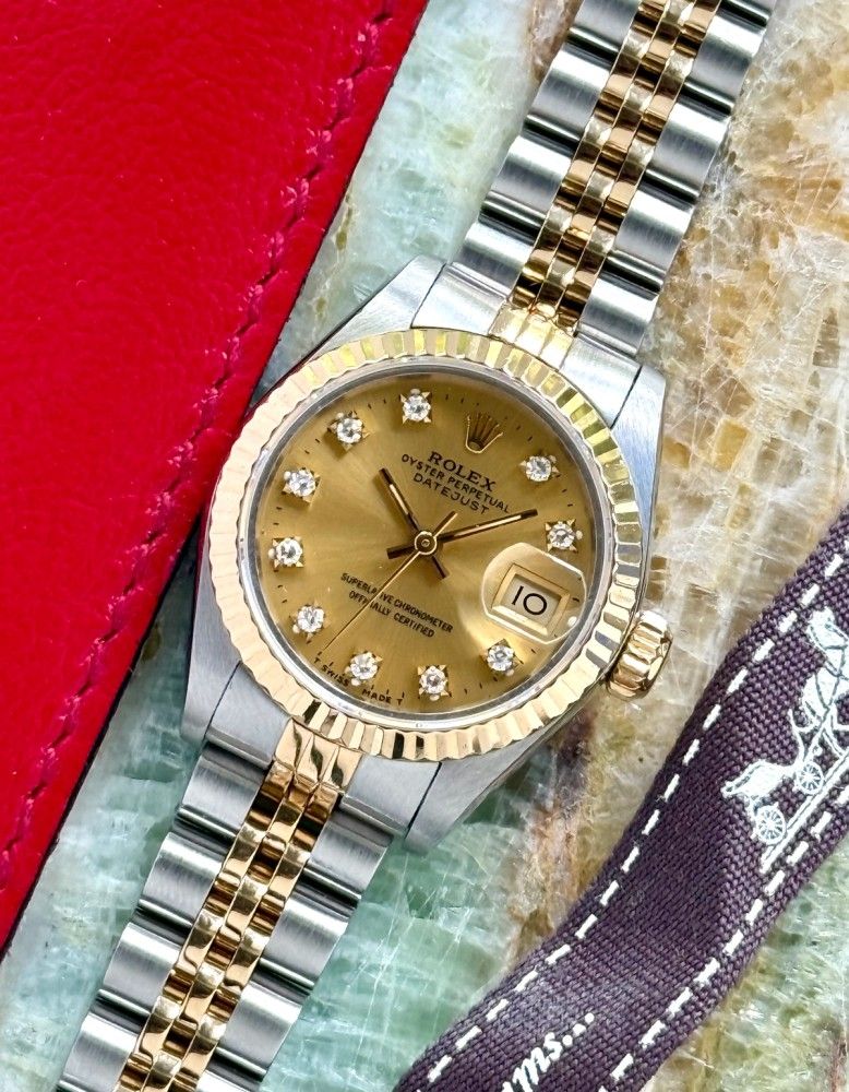 Diese elegante Rolex Lady-Datejust mit der Referenz 69173G ist in ausgezeichnetem Zustand. Die Uhr ist aus Edelstahl und Gelbgold gefertigt. Die Uhr ist mit einem schönen goldenen Zifferblatt mit werkseitig gefassten Diamanten ausgestattet. Die Uhr wurde 1990 von Rolex hergestellt (E-Serie) und mit Box und Papieren geliefert. Das automatische Uhrwerk Kal. 2135 läuft sehr genau und wurde vollständig gewartet. Das 26-mm-Edelstahl-Oyster-Gehäuse ist sehr schön, mit scharfen Kanten und einer schönen und gleichmäßigen Bürstung an den Bandanstößen. Die Serien- und Gehäusenummer zwischen den Bandanstößen ist deutlich zu erkennen. Das Original-Jubiläumsarmband aus Stahl und Gelbgold ist ebenfalls in sehr gutem Zustand und weist nur geringe Dehnungsstreifen auf. Die geriffelte Lünette aus 18-karätigem Gelbgold ist in einem sehr guten Zustand und hält das kratzfeste Saphirglas an seinem Platz.
