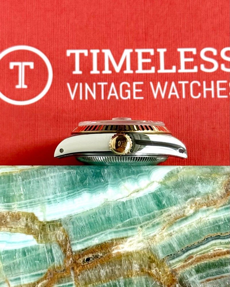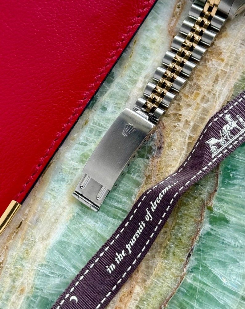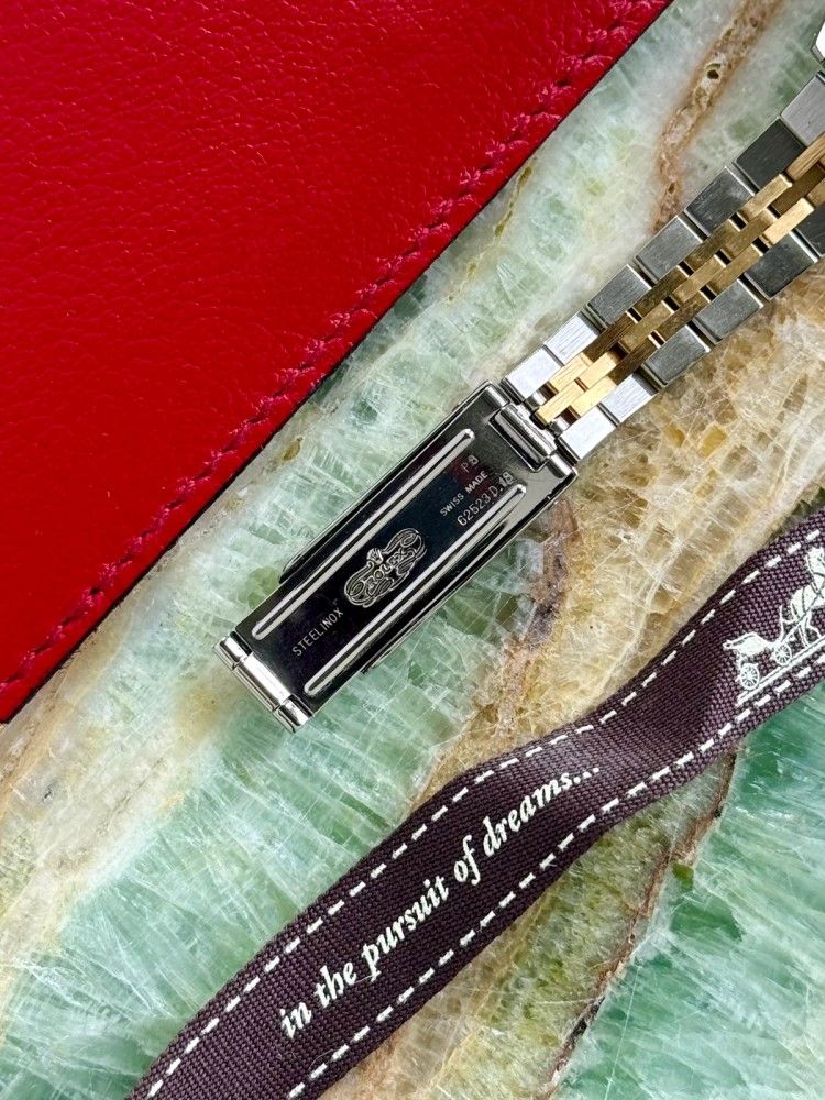 This elegant Rolex Lady Datejust with reference 69173G is in excellent condition, the watch is made from stainless steel and yellow gold. The watch is equipped with a beautiful gold dial with factory set diamonds. The watch was produced in 1990 by Rolex (E-serial) and with box and papers. The cal. 2135 automatic movement is running very accurate and was fully serviced. The 26mm stainless steel oyster case is very nice, with sharp edges and nice and even brushing on the lugs. The serial- and case number between the lugs are clearly readable. The original steel and yellow gold jubilee bracelet is also in really good condition, showing very little stretch. The 18k yellow gold fluted bezel is in great shape keeping the scratch resistant sapphire crystal in place.