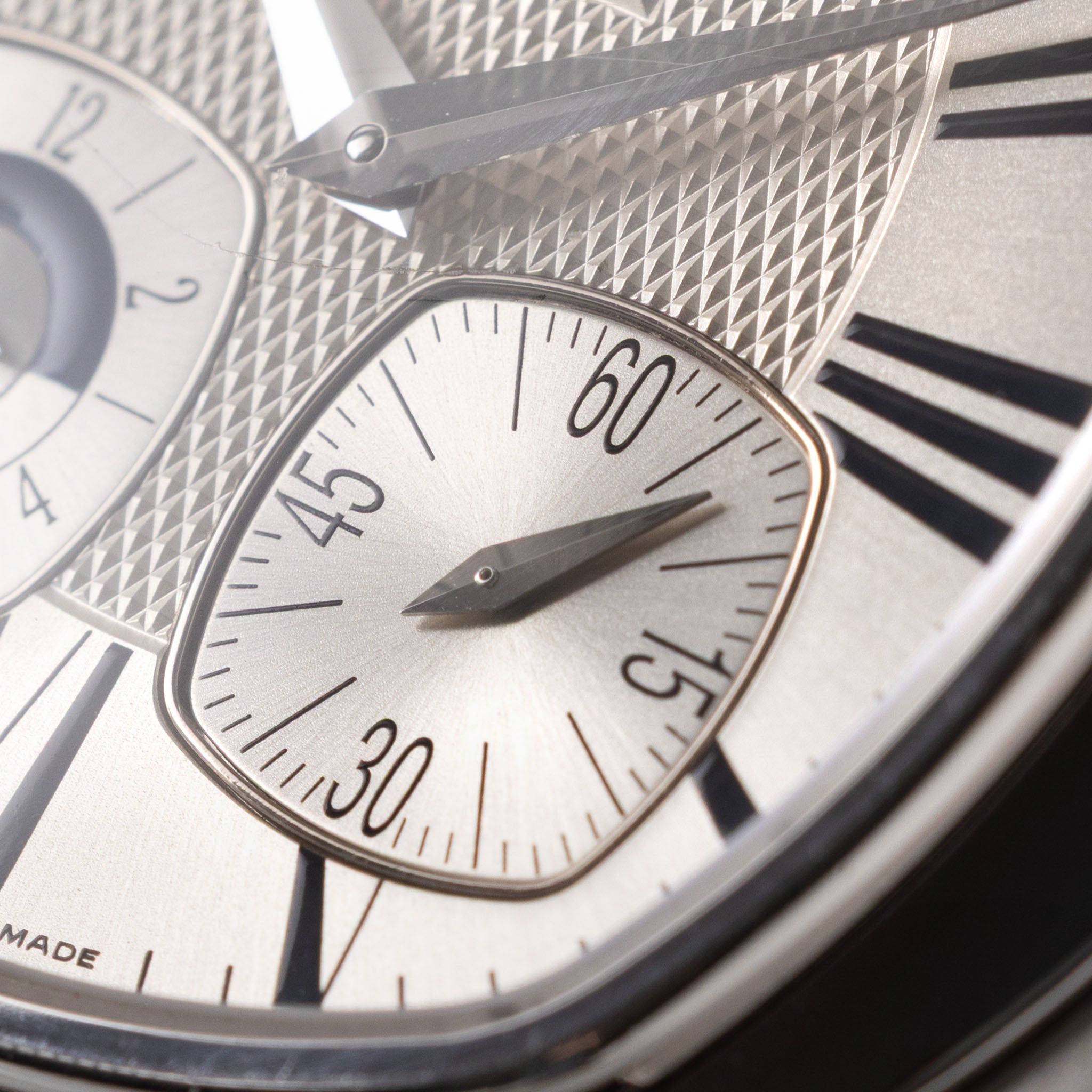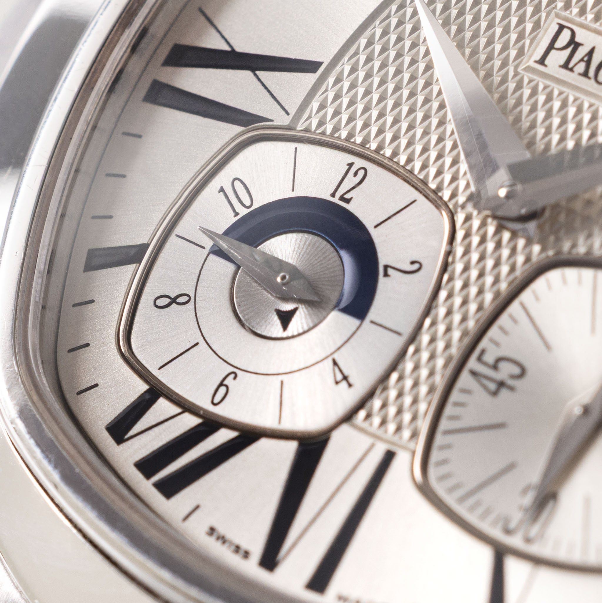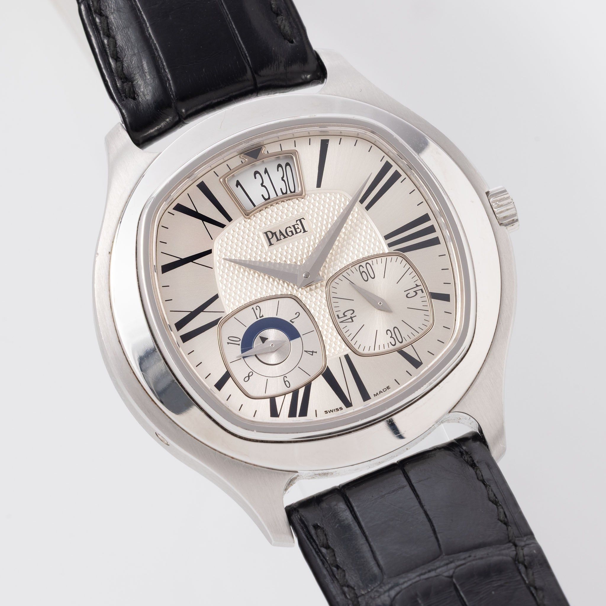 We’re presenting a limited edition (200 pieces produced) “black tie travel watch” — a lovely dual time zone piece housed in an 18k white gold cushion-shaped case with a distinctive, almost flying saucer-like profile. This unusually executed case features short, thick lugs and a sapphire display back, and remains in excellent condition throughout. The silver dial is quite refined, showcasing glossy black painted Roman numerals, a prominent big date window at 12 o’clock, and two sub-dials indicating the second time zone with day/night functionality and small seconds. The central portion of the dial features a finely hand-executed guilloché pattern, perfectly matched with elegant dauphine hands. Completing the look is a gently worn Piaget leather strap, fitted with Piaget’s own 18k white gold folding clasp. Powering this refined traveller is Piaget’s automatic calibre 850P, fully checked and regulated by our watchmaker, and running flawlessly—ready to serve for many years to come. No regretti's, we’ve got Mom’s spaghetti and this “Piagetti”! Specifications: - Piaget Emperador Dual Time Silver Dial Limited Edition Reference P10351- 42mm 18k white gold cushion case, display caseback- Silver dial with guilloché pattern, two sub-dials, big date window- No-lume dauphine hands, second time zone, small seconds, AM/PM indicator- Automatic movement, Piaget Cal. 850P- Piaget leather strap with 18k white gold folding buckle- Limited edition no. 1xx out of 200, serial DZ9xxx dating to early 2000s- Fully checked by our watchmaker- One-year mechanical warranty- Free worldwide FedEx Priority shipping