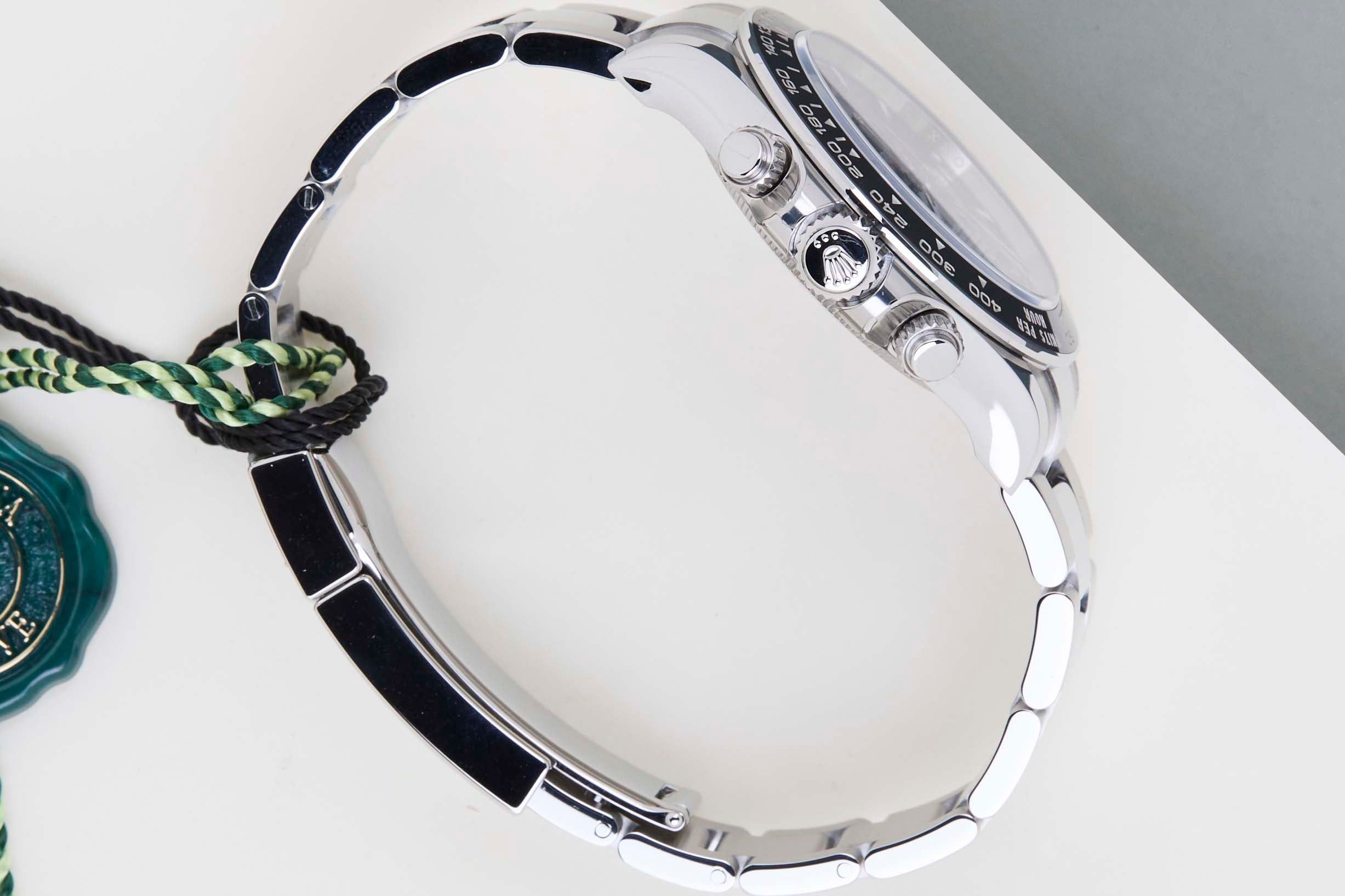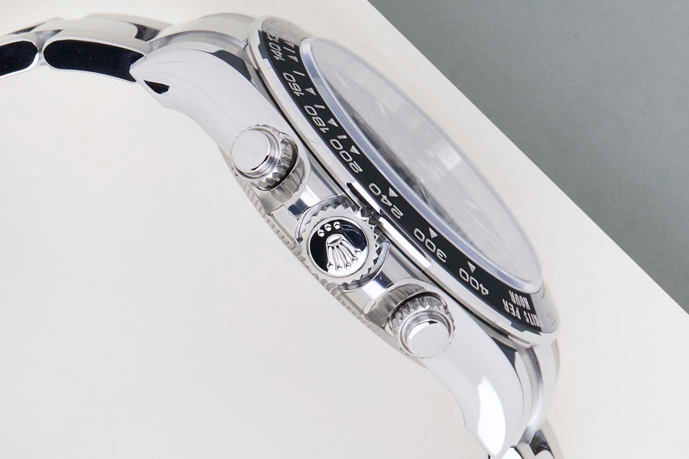 Die Referenz 126500LN ist die neueste Generation der Daytona mit einer Keramiklünette. Das Material, aus dem diese Lünette gefertigt ist, nennt sich 'Cerachrom', das vollständig intern von Rolex entwickelt wurde, um äußerst kratzfest zu sein.