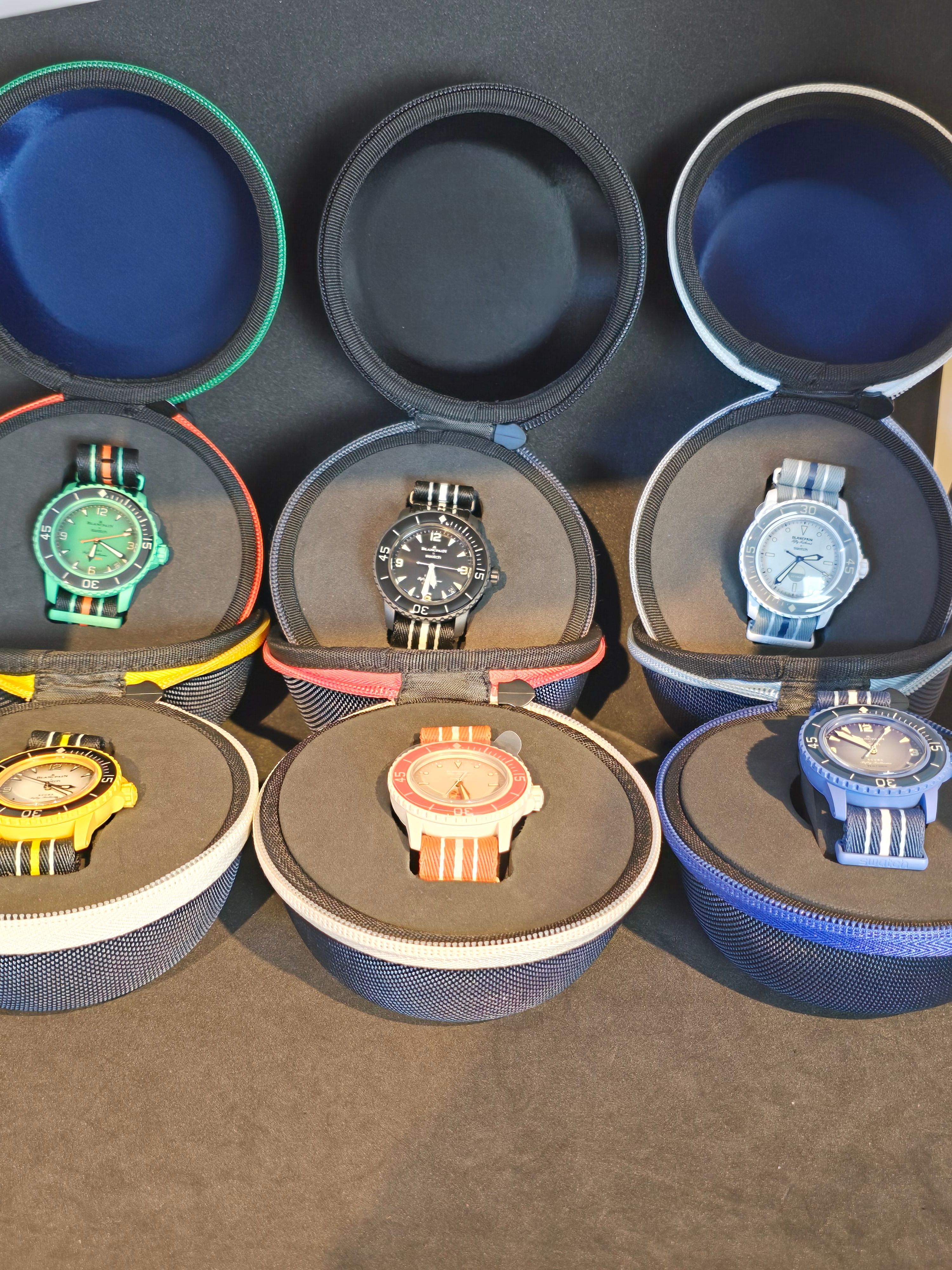 This is the complete set of all six Blancpain x Swatch Bioceramic Scuba Fifty Fathoms watches — a vibrant and highly collectible tribute to Blancpain’s legendary Fifty Fathoms dive watch and the five oceans of the world, plus The all black Ocean of Storms variant.