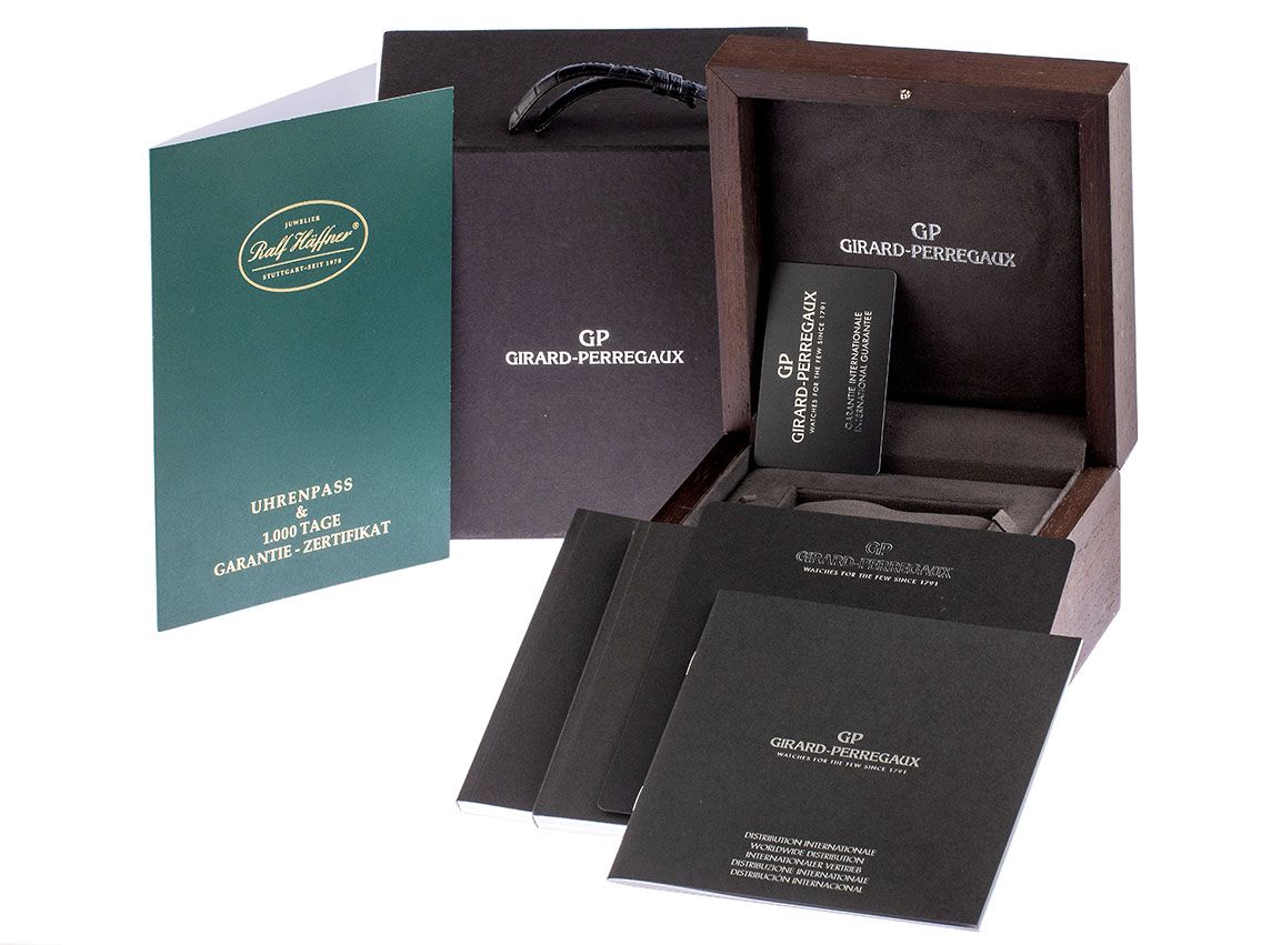 Gehäuse 18kt Weißgold poliert, Gehäusedurchmesser ohne Krone 40mm, Gehäusehöhe 11,9mm. Lünette 18kt Weißgold glatt und poliert mit Unterglas Tachymeterskala. Armband Krokoleder blau, Anstoßbreite 20mm, Stiftschließe 18kt Weißgold mit Hersteller-Logo. Zifferblatt silberfarben mit aufgesetzten weißgoldenen Indexen und arabischen weißgoldenen Ziffern 6 und 12 sowie weißgoldenen und gebläuten Zeigern. Uhrwerk Automatik, Girard Perregaux Manufakturkaliber GP030C0 mit 38 Edelsteinen. Anzeige von Stunde und Minute über Zeiger aus der Mitte, kleine Sekunde mit Sekundenstopp zur sekundengenauen Einstellung der Uhrzeit bei 9 Uhr. Saphirglas kratzfest und gewölbt. Krone mit Hersteller-Logo. Boden 18kt Weißgold graviert mit Saphirglas Sichtfenster. Gewicht der Uhr inklusive Armband 82g. Wasserdicht bis 3 ATM. Referenznummer: 49539-53-151-BK6A, ID: P8449110001023H-29000, Artikelnummer: 10000071742. Original Girard Perregaux Box mit Umkarton und Garantie Papiere von 10/2021 sowie Beschreibung und Tag, Full Set. Ungetragen. Extrem seltenes Sammlerstück, lag nur im Tresor. Lieferzeit sofort.