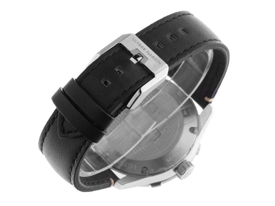 Gehäuse Edelstahl poliert und satiniert, Gehäusedurchmesser ohne Krone 42mm, Gehäusehöhe 12,1mm. Lünette Edelstahl poliert und satiniert mit grauem Inlay und 60-Minuten Skala, einseitig drehbar. Armband Leder schwarz mit Ziernaht, Anstoßbreite 24mm.Stiftschließe Edelstahl mit Hersteller-Logo. Zifferblatt schwarz matt mit aufgesetzten Edelstahl Leuchtindexen und Edelstahl Leuchtzeigern. Uhrwerk Automatik, Ulysse Nardin Manufakturkaliber UN-816, Gangreserve ca. 42 Stunden. Anzeige von Stunde, Minute und Sekunde über Zeiger aus der Mitte mit Sekundenstopp zur sekundengenauen Einstellung der Uhrzeit, Datumsanzeige mit Schnellverstellung bei 6 Uhr. Saphirglas kratzfest. Krone Edelstahl verschraubbar mit Hersteller-Logo. Boden Edelstahl 6-fach verschraubt und graviert. Gewicht der Uhr inklusive Armband 86g. Wasserdicht bis 30 ATM. Referenznummer: 8163-175/92 , ID: ST116097180224H-7700, Artikelnummer: 10000073379. Original Ulysse Nardin Box mit Umkarton und Garantie Papiere von Februar 2024 sowie Beschreibung, Full Set. Ungetragen. Lieferzeit sofort.