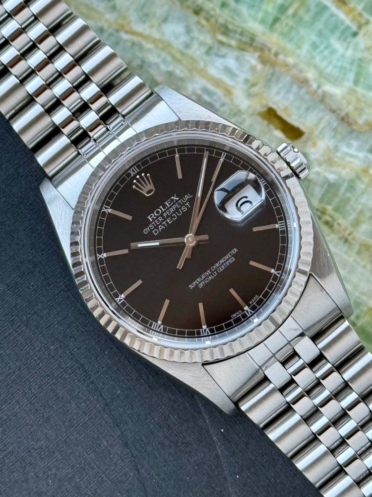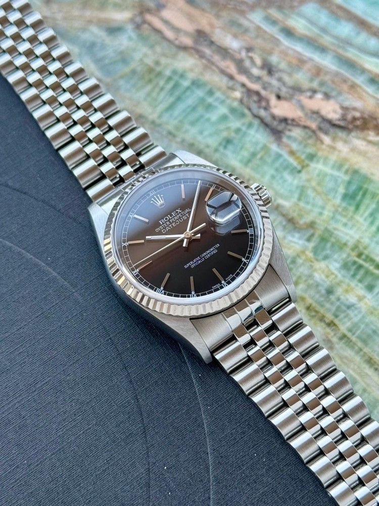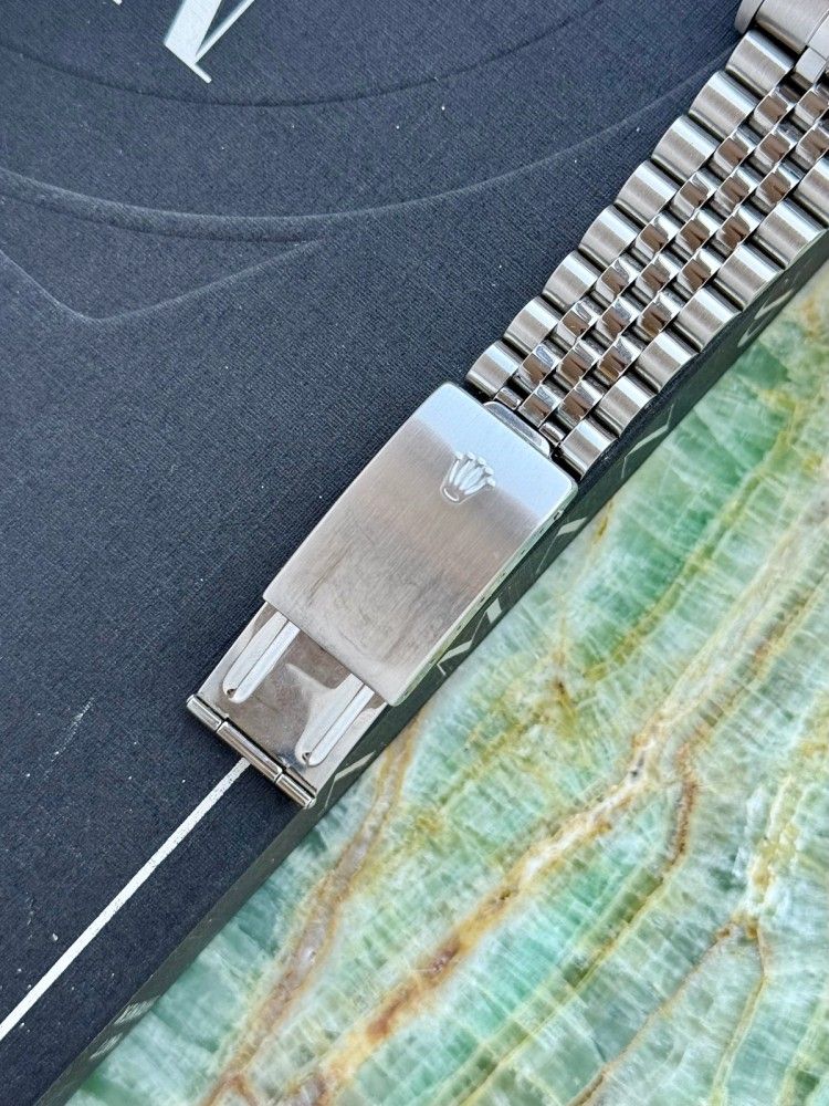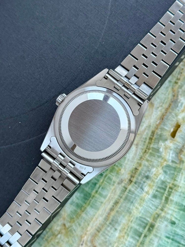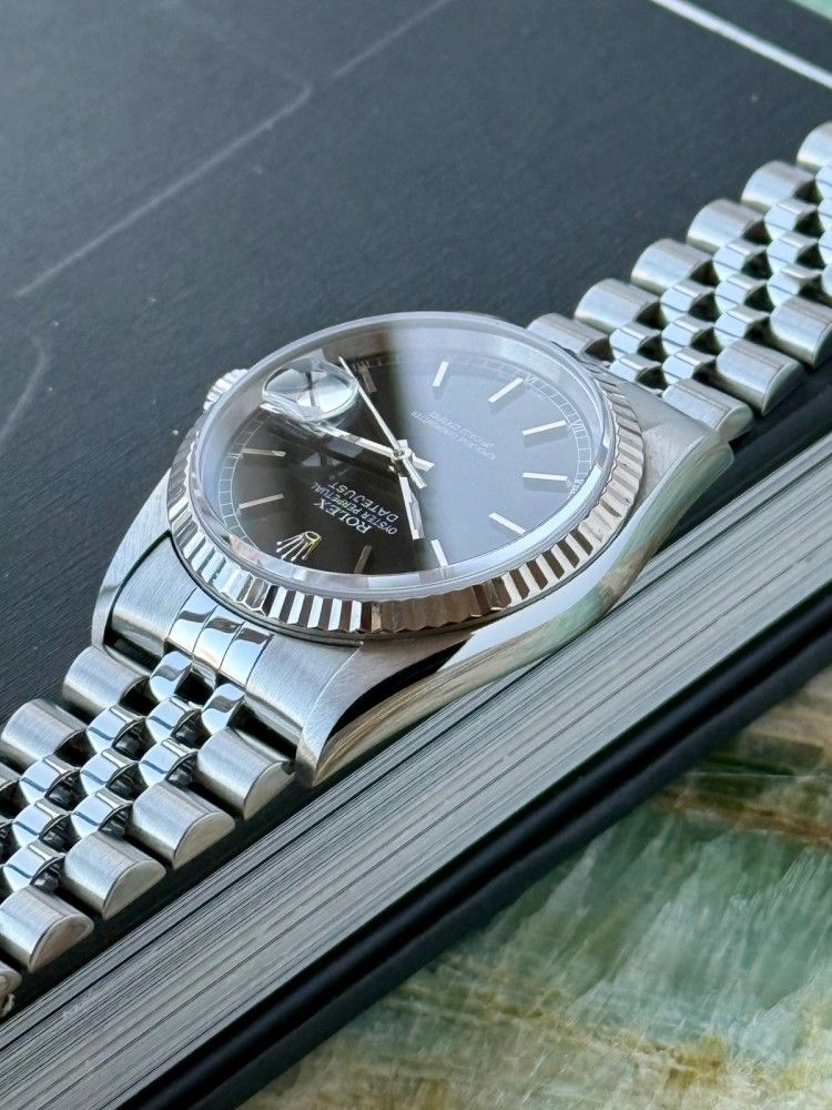 This Rolex Datejust from 2002 with reference 16234 is in great condition. The cal. 3135 movement is recently serviced and keeps time very well. The watchcase seems to be polished very lightly with sharp lines, and even brushing on the lugs. The serial- and case number are clearly readable. The original Rolex stainless steel Jubilee bracelet is also in great condition and has very little stretch. The white gold fluted bezel is sharp and in great shape keeping the scratch resistant sapphire crystal in place. Which in it's turn protects the black dial with roman minute track and 18k white gold hour markers. The watch comes with the original box and papers.