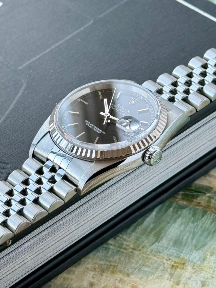 Diese Rolex Datejust aus dem Jahr 2002 mit der Referenz 16234 ist in einem tollen Zustand. Das Kal. 3135 Uhrwerk wurde kürzlich gewartet und hält die Zeit sehr gut ein. Das Gehäuse ist sehr leicht poliert und weist scharfe Linien und sogar Bürsten an den Bandanstößen auf. Die Serien- und Gehäusenummer sind gut lesbar. Das originale Rolex-Edelstahl-Jubiläumsarmband ist ebenfalls in einem sehr guten Zustand und weist nur eine geringe Dehnung auf. Die geriffelte Lünette aus Weißgold ist scharf und gut erhalten und hält das kratzfeste Saphirglas an seinem Platz. Dieses schützt wiederum das schwarze Zifferblatt mit römischer Minuterie und 18-karätigen Weißgold-Indizes. Die Uhr wird mit der Originalbox und den Papieren geliefert.