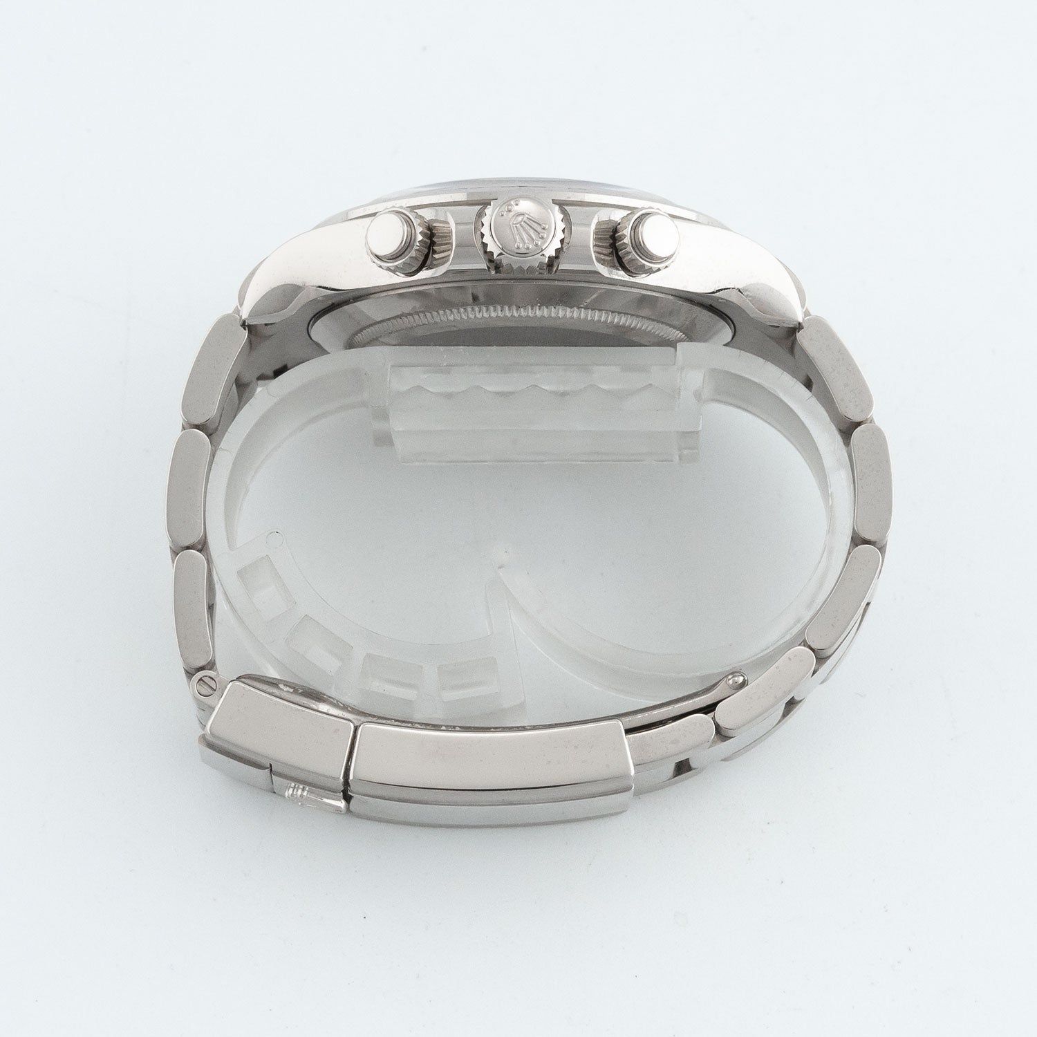 Rolex Daytona White Gold "Ghost Panda" Dial 2021 – Ref. 116509The Rolex Cosmograph Daytona – a legend among chronographs. This exclusive model with the reference 116509 captivates with its combination of sporty aesthetics and the finest materials. The nickname "Ghost Panda" refers to the silver-white dial with contrasting black subdials – subtle, stylish, iconic.Watch Highlights:Model: Rolex Cosmograph DaytonaReference number: 116509Case material: 18kt white goldDiameter: 40 mm – sporty and elegant at the same timeDial: Ghost Panda – silver with black chronograph counters, applied indices, and red Daytona letteringBezel: Fixed tachymeter bezel in polished white goldMovement: Caliber 4130 – automatic chronograph with COSC certification, approximately 72 hours power reserveBracelet: Solid gold Oyster bracelet with Oysterlock folding claspCrystal: Scratch-resistant sapphire crystalThe watch dates from 2021 and is in excellent condition. The Ghost Panda is particularly coveted and highly sought-after among collectors – a true statement on the wrist with potential for appreciation.You receive a 1-year warranty on the movement.The watch is subject to differential taxation, and VAT is not deductible.