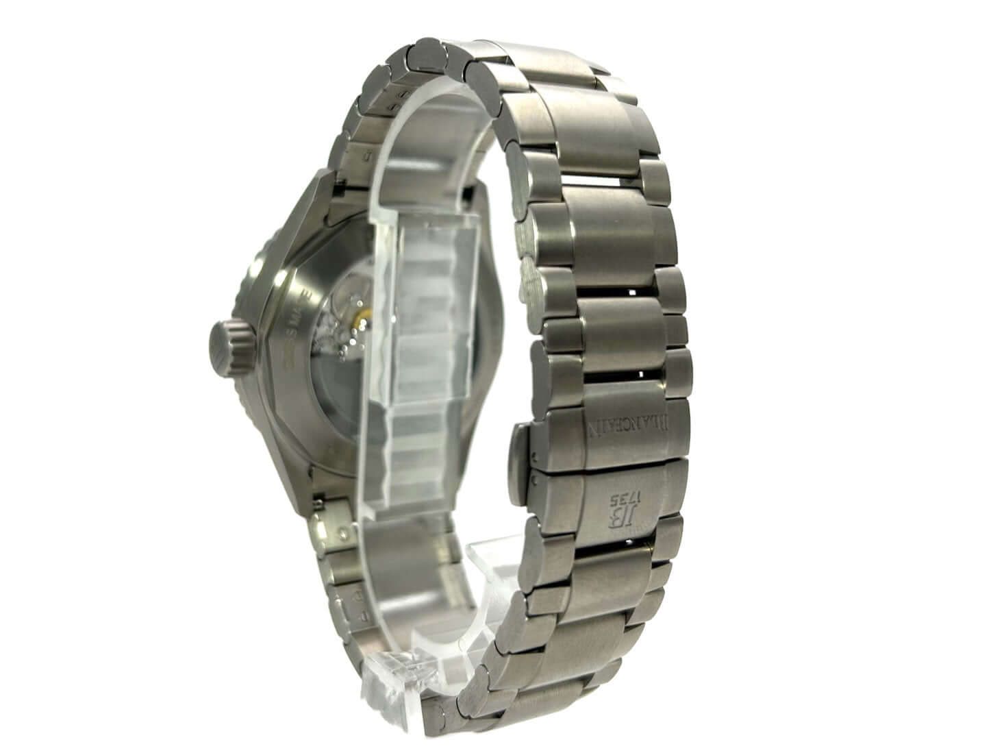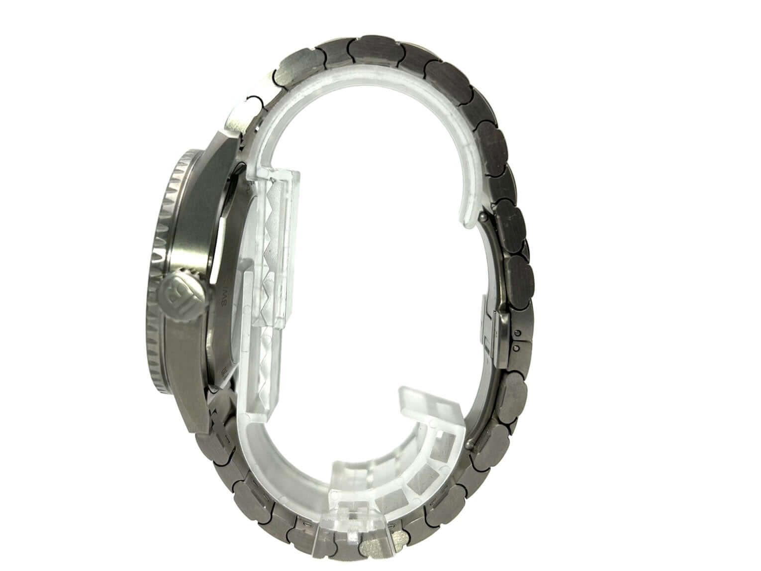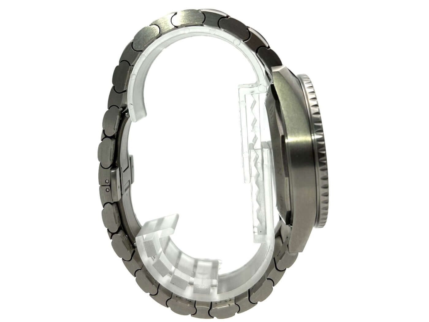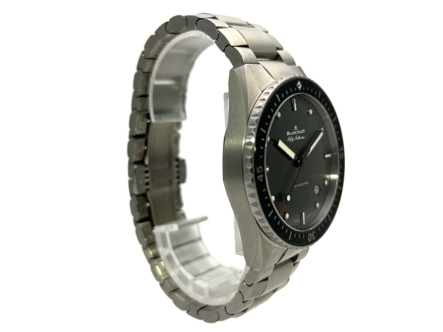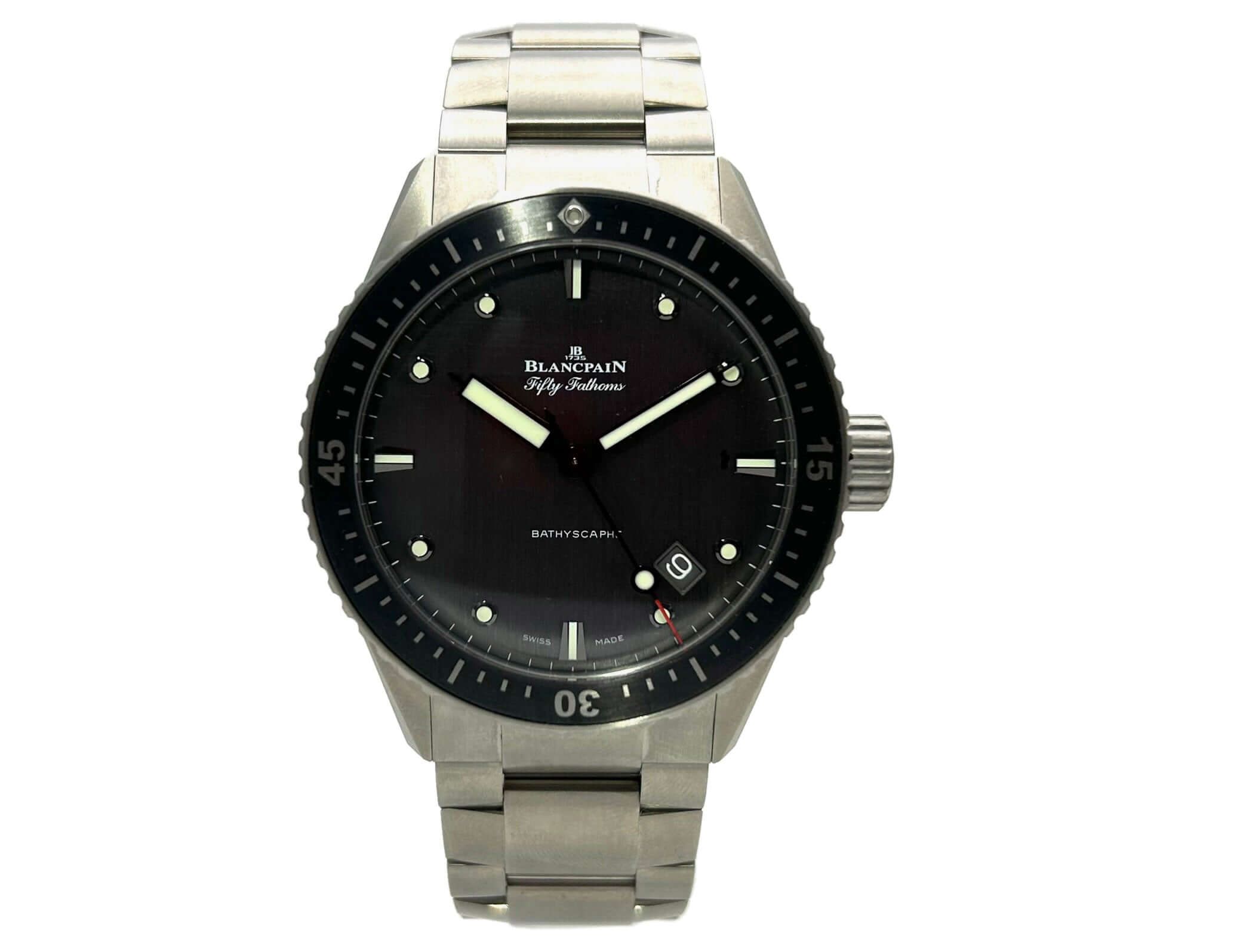Blancpain Fifty Fathoms Bathyscaphe Ref. 5000-1210-98S Satiniertes Titangehäuse, Gehäusedurchmesser 43 mm, Titanlünette mit schwarzer Keramikeinlage, drehbar mit Arretierung, Titanarmband mit Faltschließe, graues Zifferblatt mit applizierten Leuchtpunkten, Leuchtzeiger, Automatik, Kaliber Blancpain 1315, 35 Steine, Gangreserve ca. 120 Stunden, Datum, Saphirglas, verschraubte Krone mit Seitenschutz, Sekundenzeiger mit Leuchtspitze, zentrale Sekunde, verschraubter Titanboden mit Sichtfenster, wasserdicht bis 30 bar.