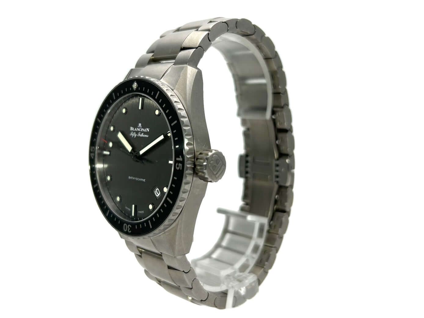 Blancpain Fifty Fathoms Bathyscaphe Ref. 5000-1210-98S Satin-finished titanium case, case diameter 43 mm, titanium bezel with black ceramic inlay, rotatable with lock, titanium strap with folding clasp, gray dial with applied luminous dots, luminous hands, automatic, caliber Blancpain 1315, 35 jewels, power reserve approx. 120 hours, date, sapphire crystal, screw-down Crown with side protection, second hand with luminous tip, central seconds, screwed titanium back with viewing window, water resistant up to 30 bar.