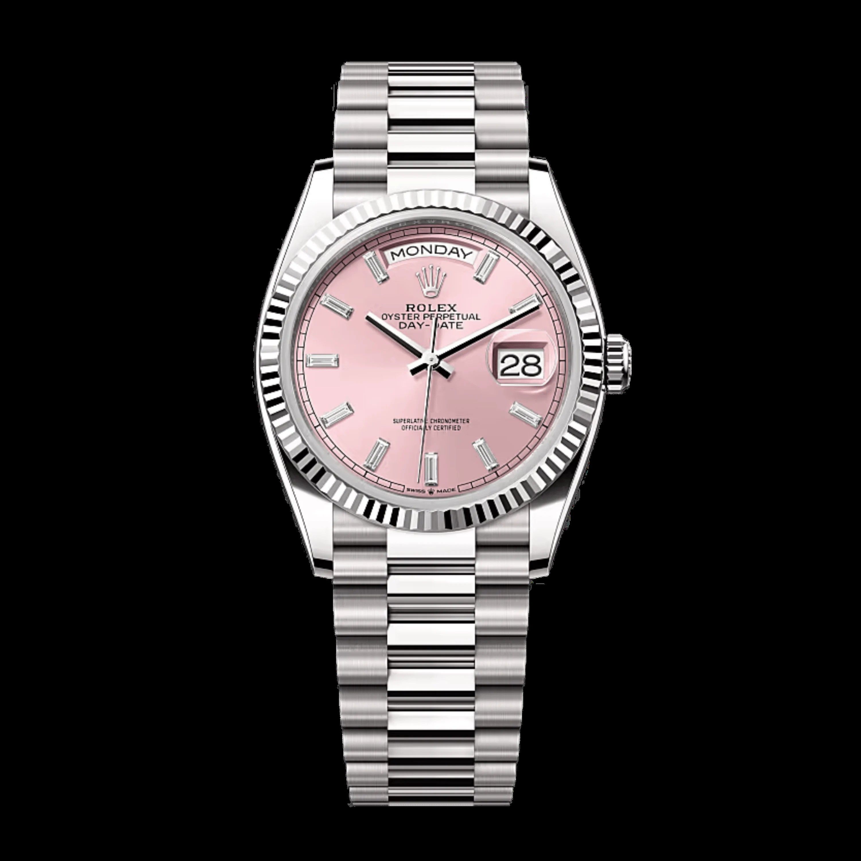 Rolex 128239-0071 - Day-Date 36 White Gold - Fluted / Pink - Baguette / President