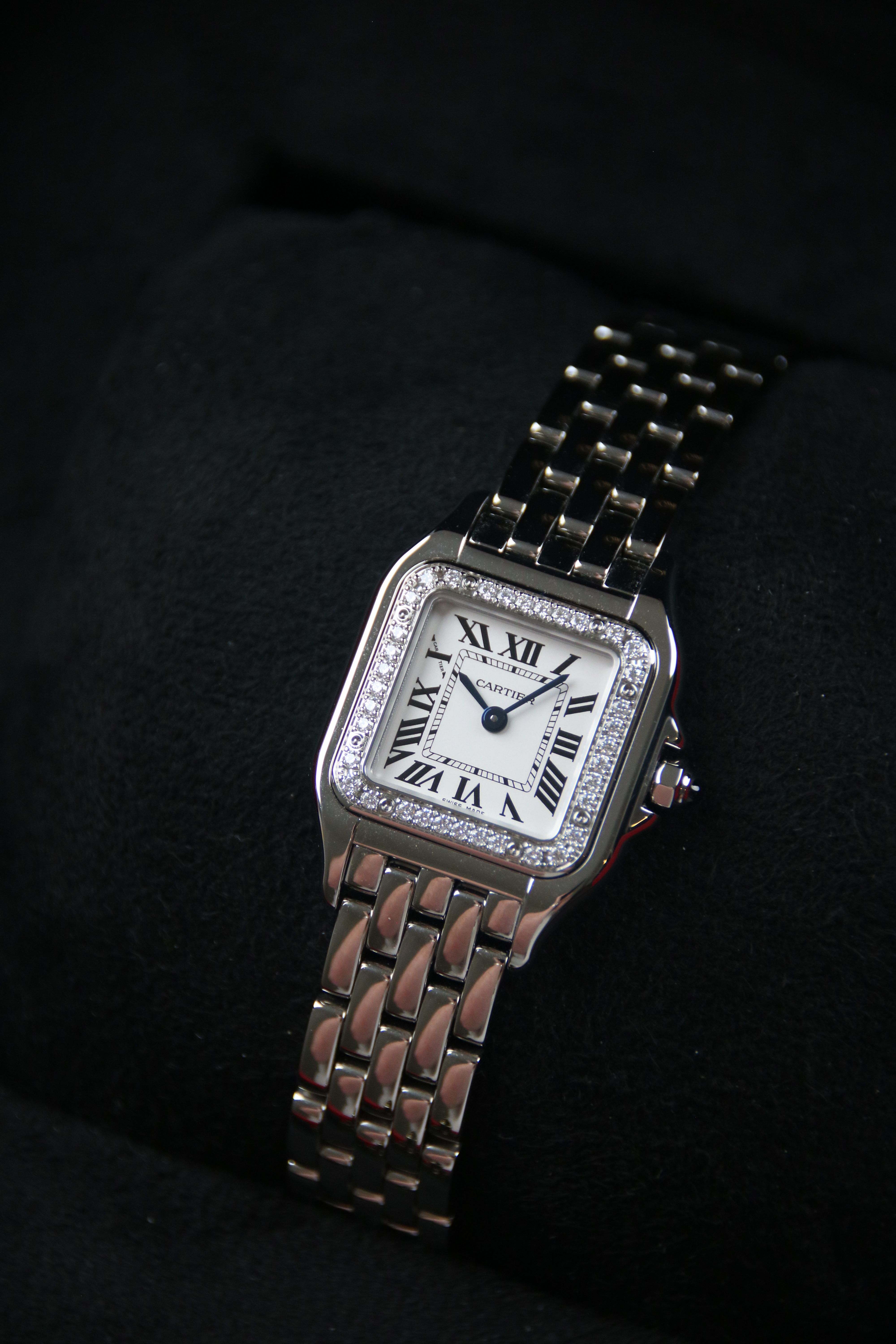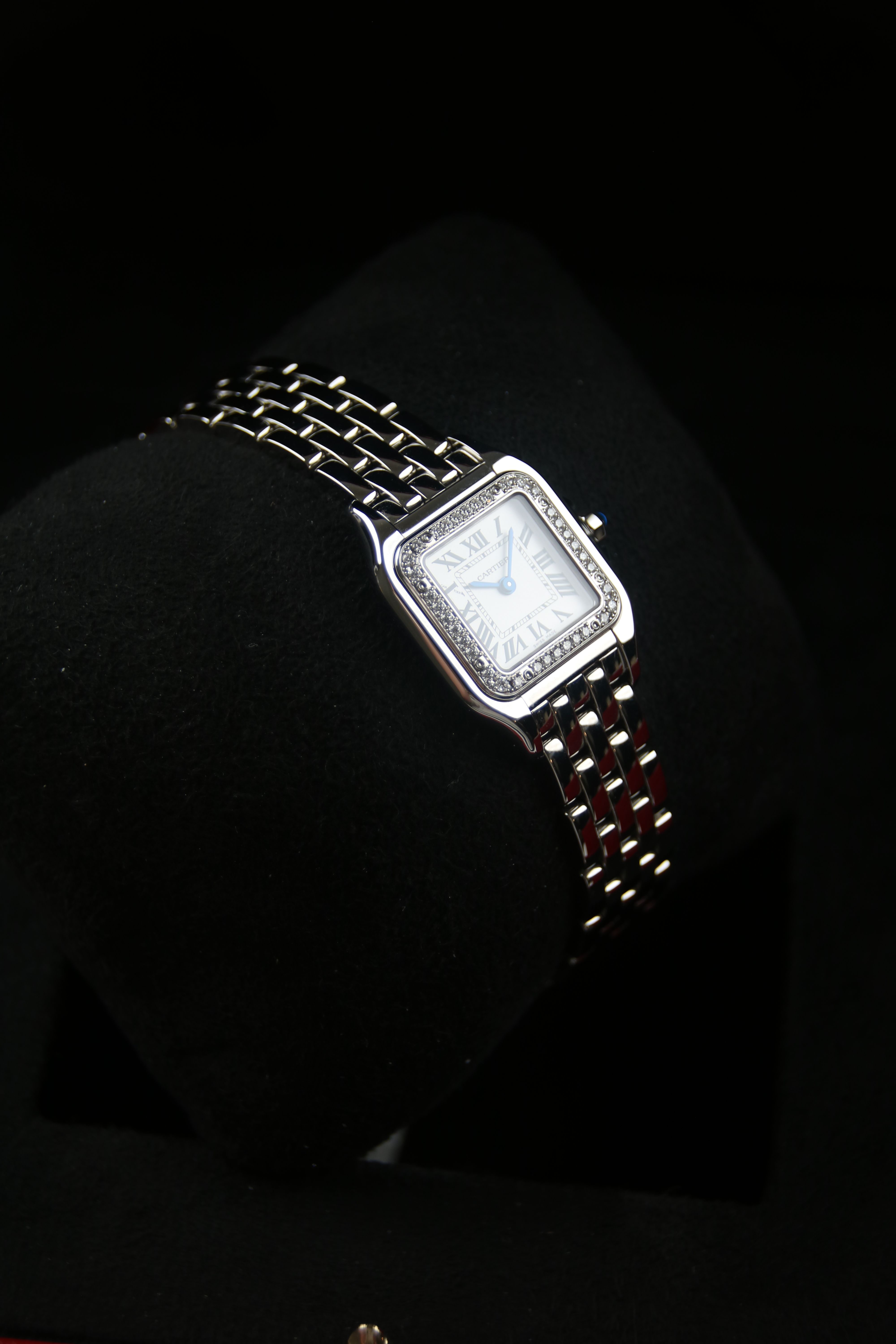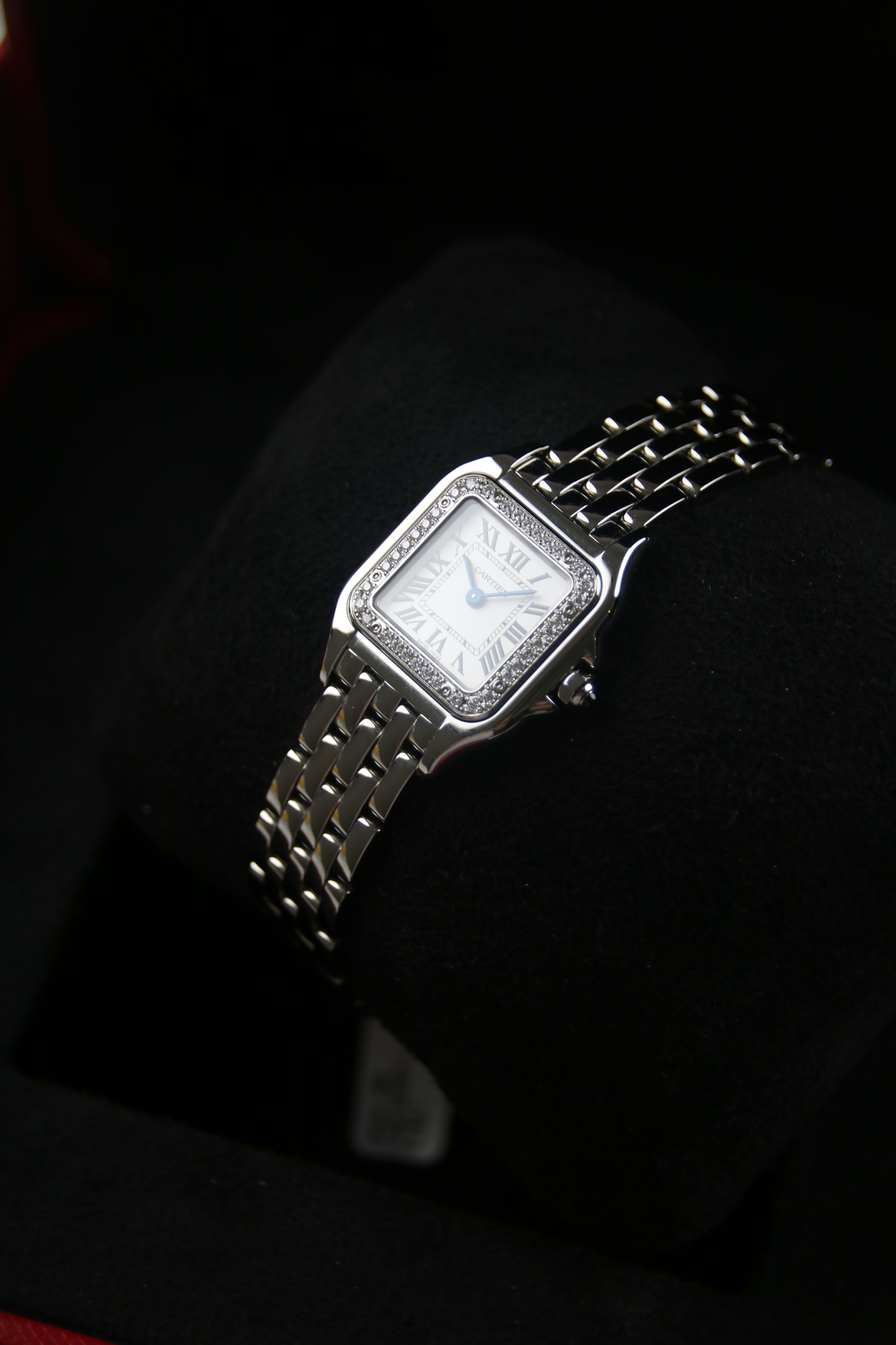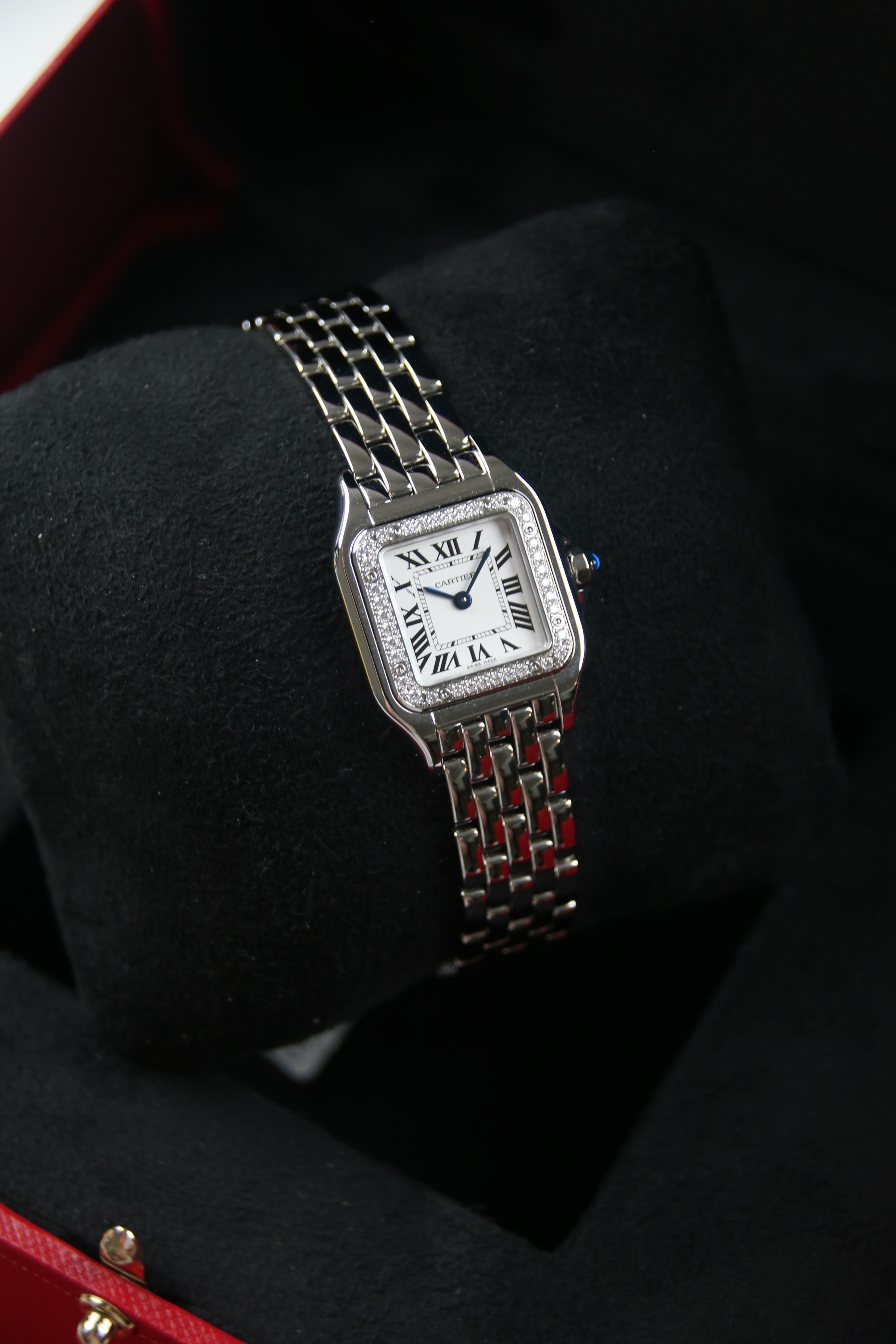 Zum Verkauf steht eine brandneue Cartier Panthere Small Damenuhr mit Diamant-Lünette. Gekauft bei einem autorisierten Händler im Jahr 2025, Cartier Garantie bis 2033.