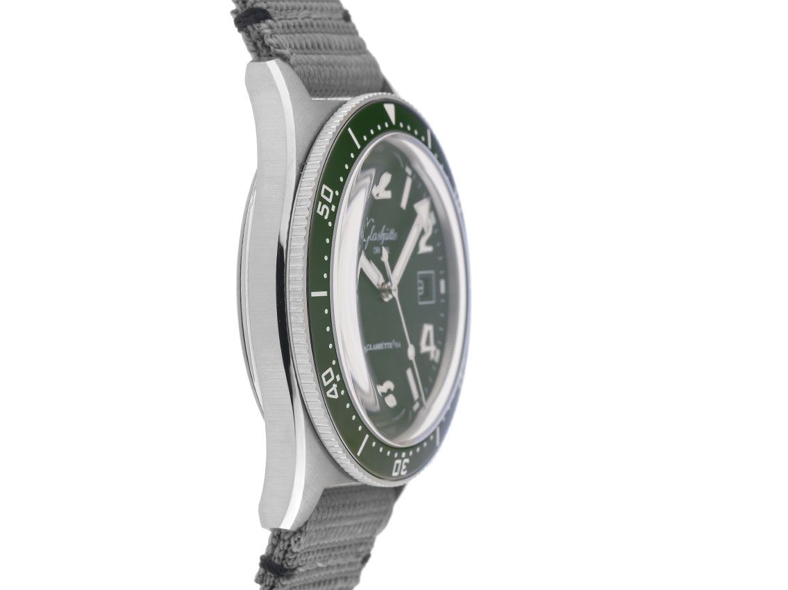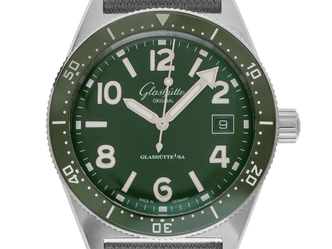 Gehäuse Edelstahl satiniert, Gehäusedurchmesser ohne Krone 39,5mm, Gehäusehöhe 12,15mm. Lünette Edelstahl mit grünem Inlay und 60-Minuten Skala, einseitig drehbar. Armband Textil grau, Anstoßbreite 20mm, Sicherheitsfaltschließe Edelstahl mit Hersteller-Logo. Zifferblatt grün mit aufgesetzten arabischen Leuchtziffern und Leuchtindexen sowie Leuchtzeigern. Uhrwerk Automatik, Glashütte Original Manufakturkaliber 39-11 mit 25 Edelsteinen, Gangreserve ca. 40 Stunden. Anzeige von Stunde, Minute und Sekunde über Zeiger aus der Mitte mit Sekundenstopp zur sekundengenauen Einstellung der Uhrzeit, Datumsanzeige mit Schnellverstellung bei 3 Uhr. Saphirglas kratzfest und gewölbt. Krone verschraubbar mit Hersteller-Logo. Boden Edelstahl verschraubt und graviert. Gewicht der Uhr inklusive Armband 104g. Wasserdichtigkeit bis 20 ATM. Referenznummer: 1-39-11-13-83-34, ID: ST1160141200625RE-10200, Artikelnummer: 10000080898. Glashütte Original Box mit Umkarton und Garantie Papiere von Juni 2025, Full Set. Ungetragen. Lieferzeit sofort.
