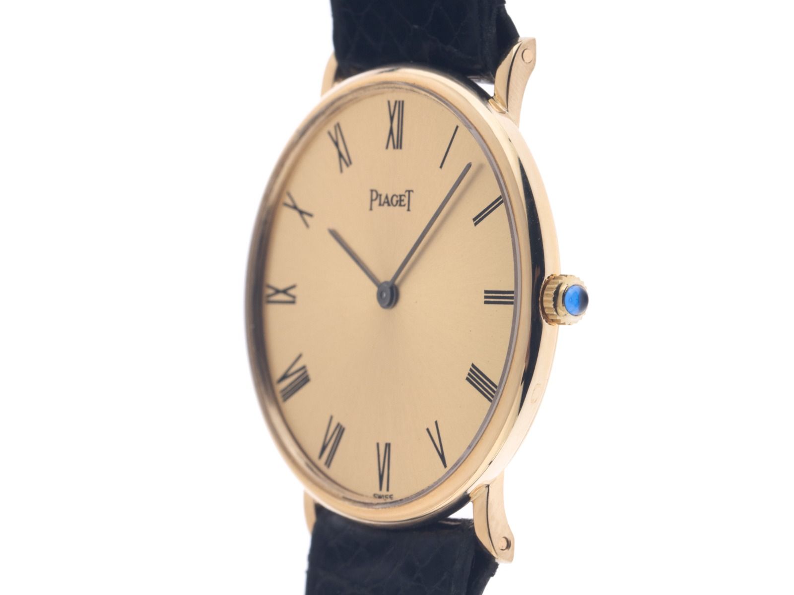 Gehäuse 18kt Gelbgold poliert, Gehäusedurchmesser ohne Krone 30mm, Gehäusehöhe 4,2mm. Piaget Armband Krokoleder schwarz mit Ziernaht, Anstoßbreite 16mm, Stiftschließe 18kt Gelbgold. Zifferblatt champagnerfarben mit schwarzen römischen Ziffern und schwarzen Zeigern. Uhrwerk Handaufzug, Kaliber Piaget 9P mit 18 Edelsteinen. Anzeige von Stunde und Minute über Zeiger aus der Mitte. Mineralglas. Krone geriffelt mit Saphir Cabochon. Boden 18kt Gelbgold graviert. Gewicht der Uhr inklusive Armband 27g. Referenznummer: 9025, Gehäusenummer: 216XXX, ID: P116040000725H-6200, Artikelnummer: 10000081240. Mit Gangkontrolle und kompletter äußerlicher Aufarbeitung von Juli 2025.Original Piaget Box, Watchregister Auszug von Juli 2025, The Watch Register Zertifikat / ohne Eintrag (Internationale Datenbank für verlorene oder gestohlene Uhren). Superschnäppchen, Kapitalanlage mit Wertsteigerungspotential, extrem seltenes Sammlerstück. Sehr guter Zustand. Lieferzeit sofort.