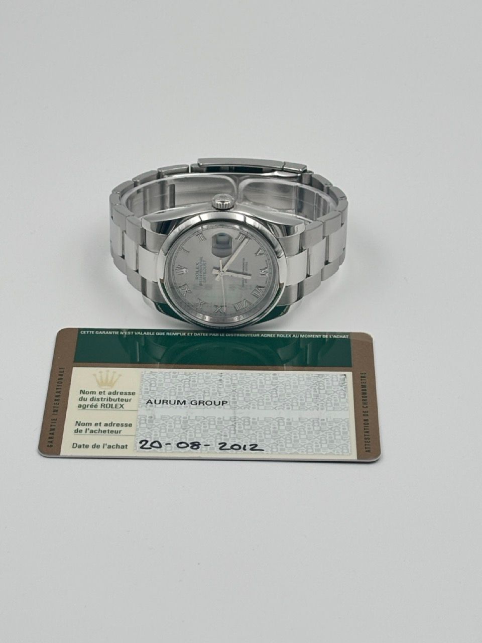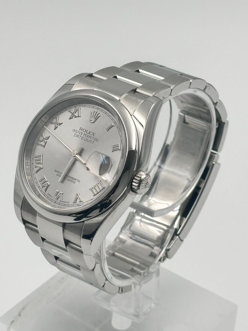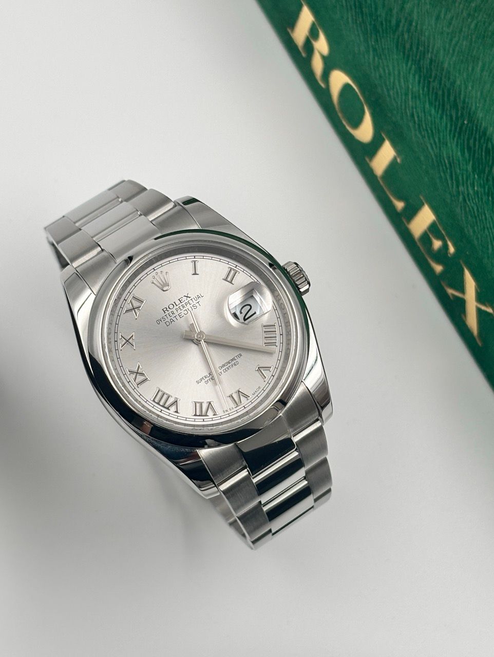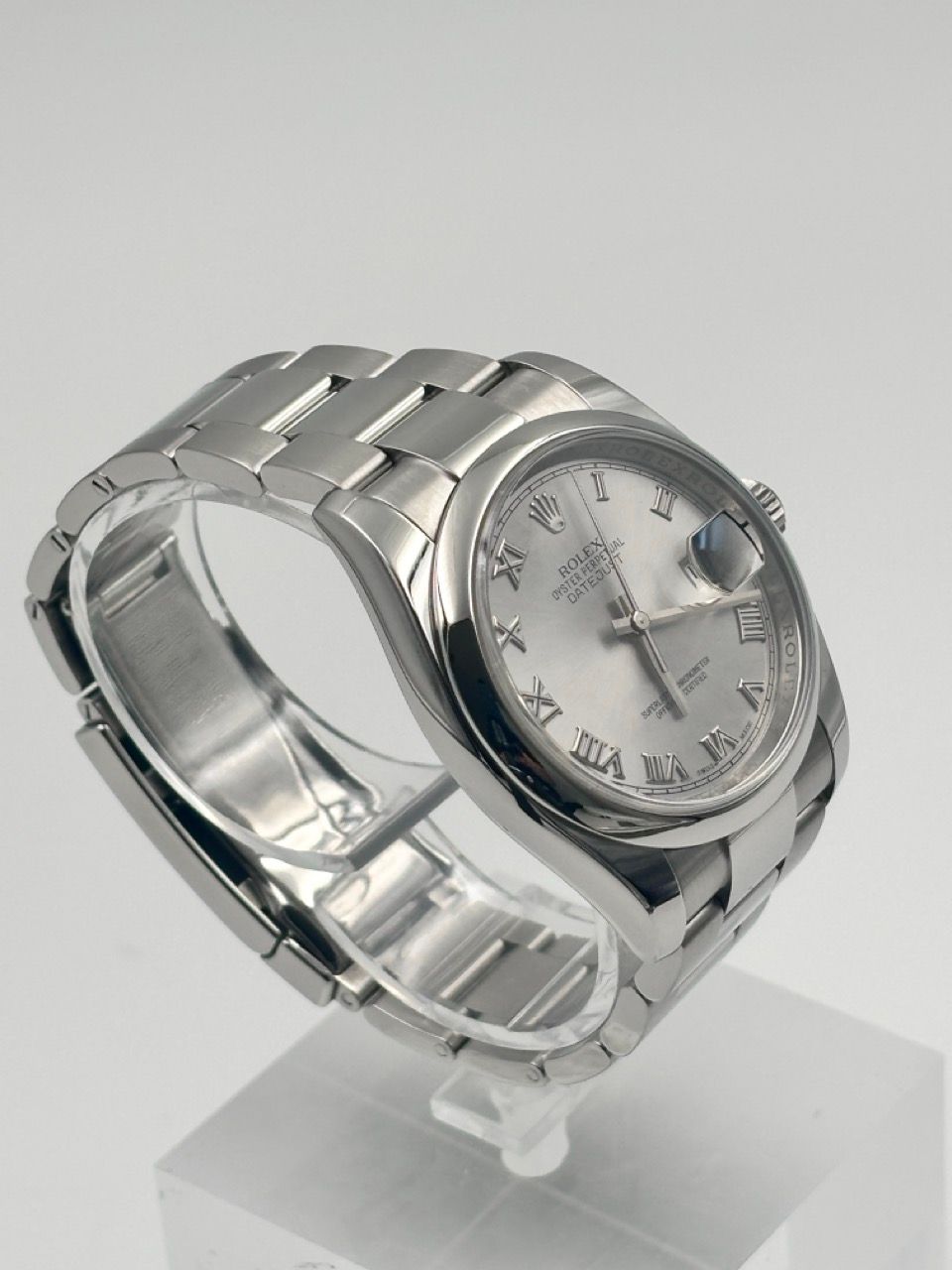 Rolex Datejust 36 with a silver roman dial. Serviced & polished by Rolex in july 2025.Watch works properly, has a very small scratch on the left lug.