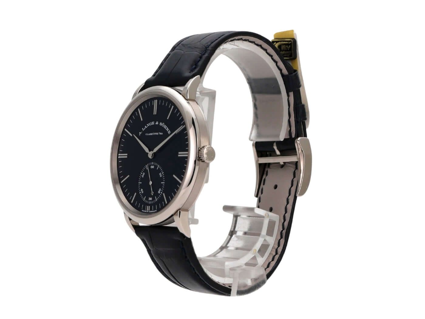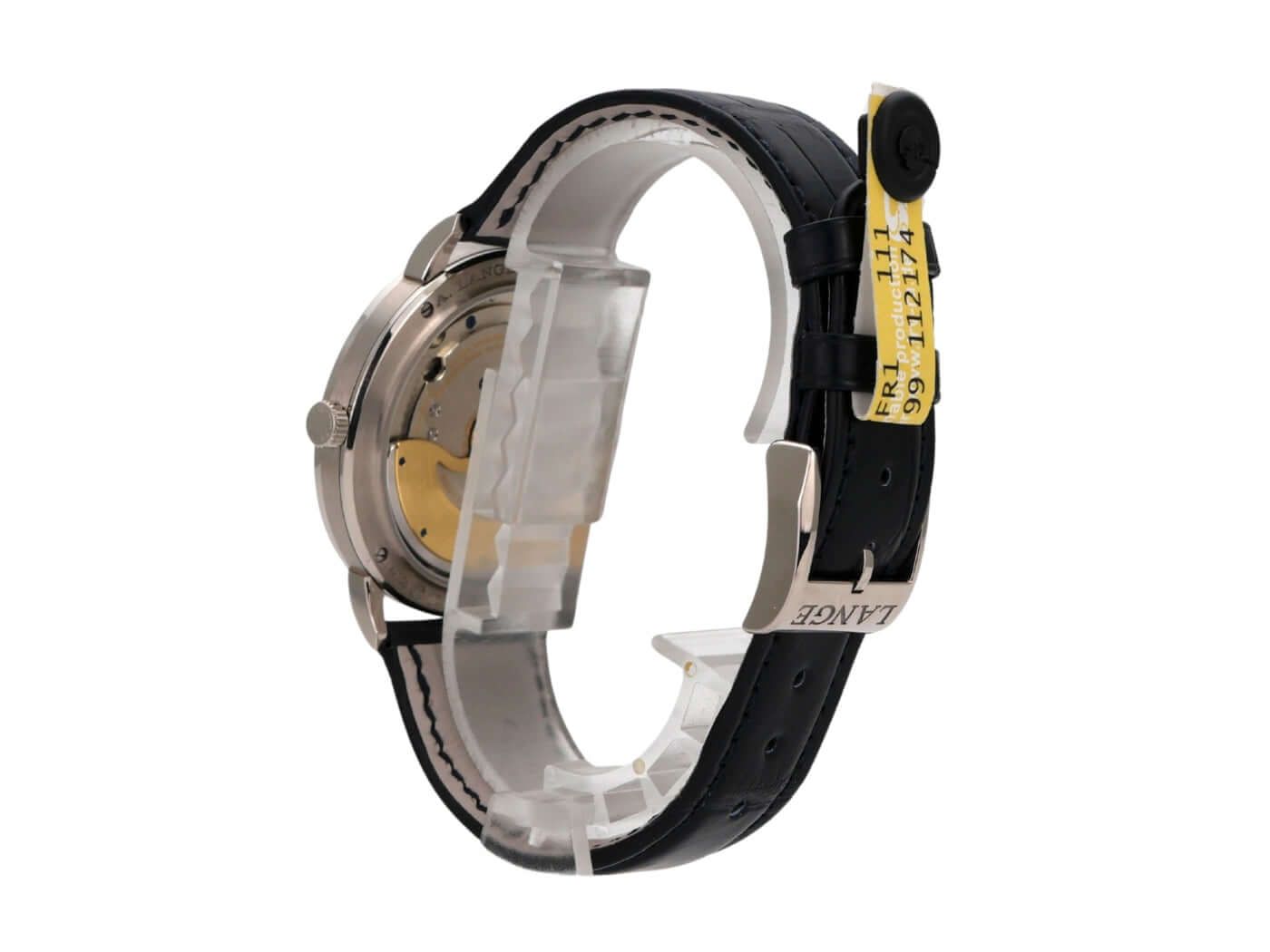 Gehäuse aus 18 kt Weißgold, Gehäusedurchmesser 38,5 mm, Gehäusehöhe 7,8 mm, polierte Lünette aus 18 kt Weißgold, blaues Alligatorlederband mit Dornschließe aus 18 kt Weißgold, blaues Zifferblatt, Automatik, Lange Manufakturkaliber L086.1, Frequenz 21.600 A/h, Gangreserve 72 Stunden, Saphirglas, 18 kt Weißgoldboden mit Saphirglas, wasserdicht bis 3 bar.