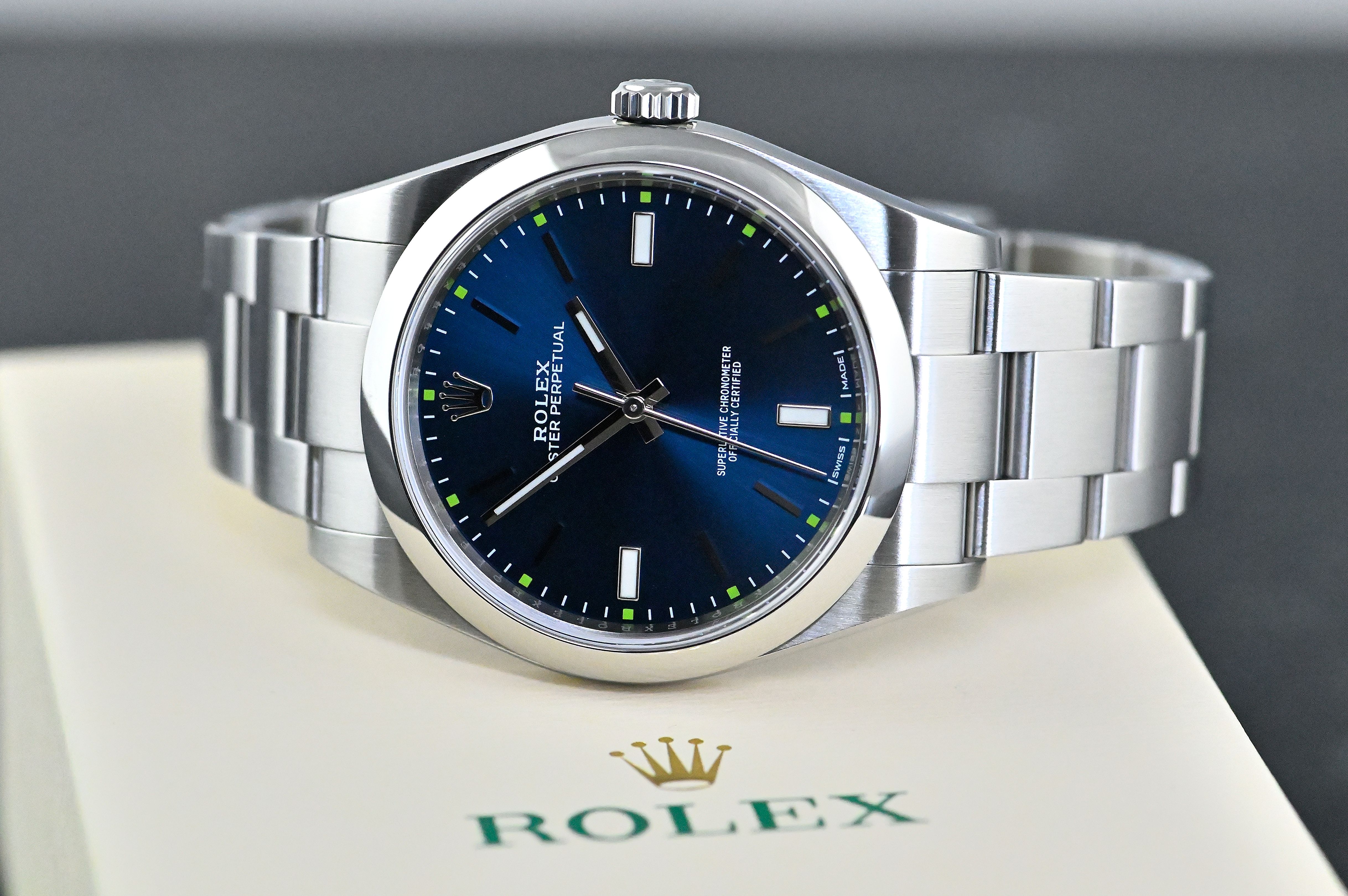 Rolex Oyster Perpetual 39 Chronometer | Referenz 114300 | in Stahl | mit blauem Zifferblatt | SEL Oyster Armband | gewölbte Lünette | neongrüne Indexpunkte | sehr guter Zustand | beiliegendes Original-Garantiezertifikat / Garantiekarte LC100 (verkauft im August 2017 von Rüschenbeck - Deutschland) - Rolex Lederkoffer mit Umkarton.