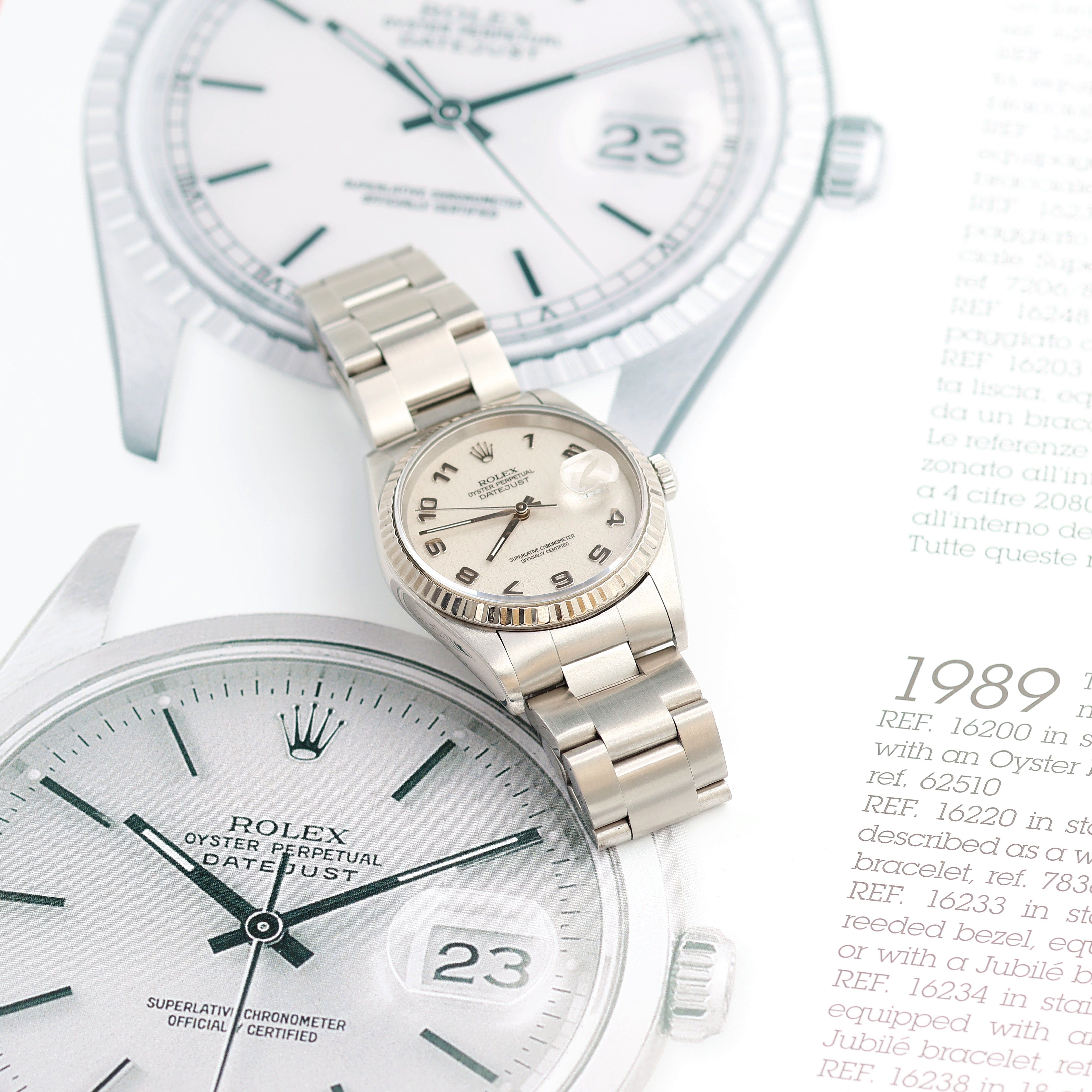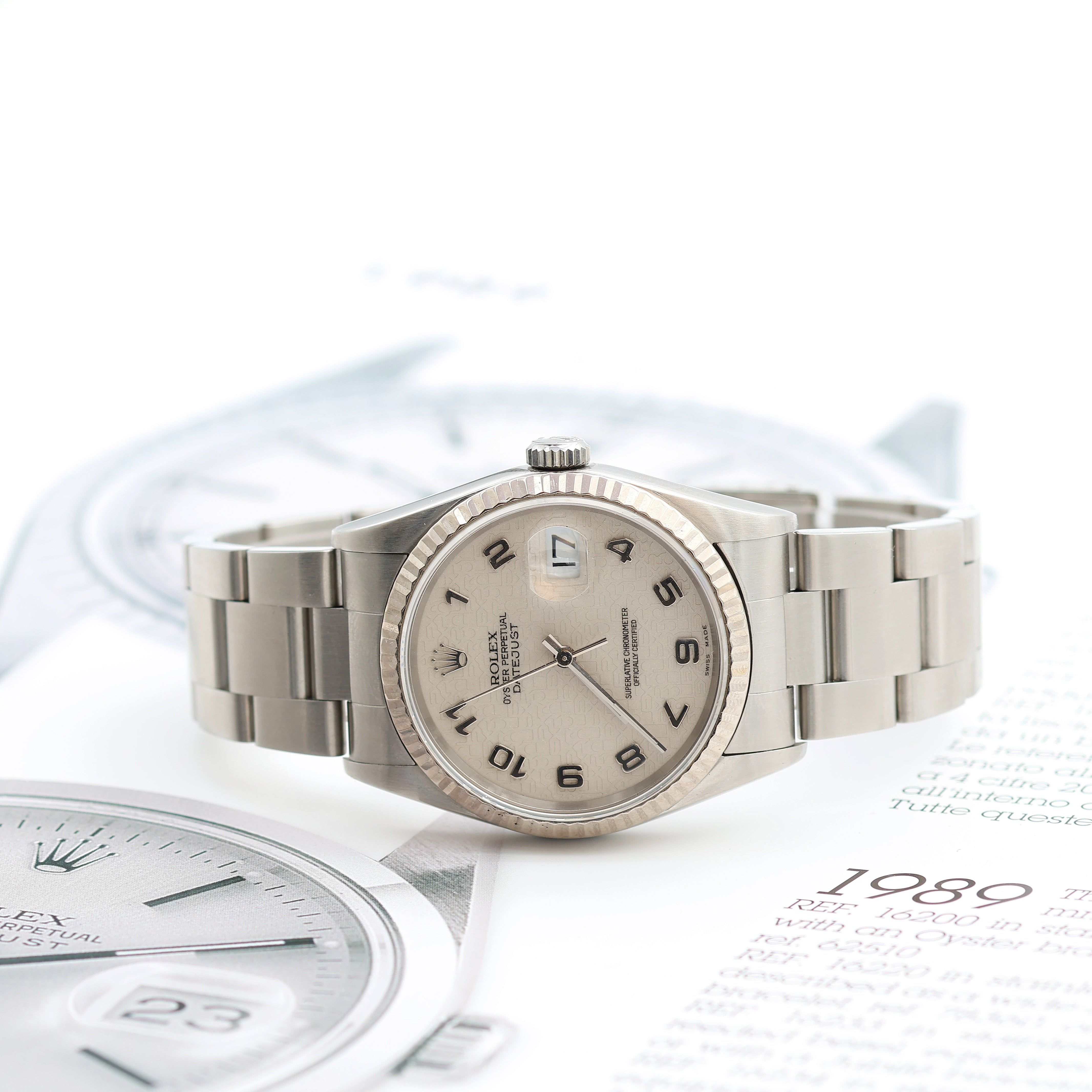 For sale at Debonar Watches: pre-owned Rolex Datejust ref. 16234.This Rolex Datejust in steel presents a peculiar MIllennary dial (also called "jubilee" dial), a white gold bezel and a coordinated oyster bracelet.This 36 mm. diameter stainless steel case is set with screw-down case back and crown, a fluted white gold bezel, a sapphire crystal with cyclops lens.On the dial we find at 12 o'clock the words "ROLEX" - "OYSTER PERPETUAL" - "DATEJUST" and at 6 o'clock the classic writing "Superlative Chronometer Officially Certified". This Datejust's reference has been in production for a long time: you can find Datejust 16234 produced from the late 80s to mid-2000s. BRAND ROLEX MODEL DATEJUST REFERENCE 16234 CASE MATERIAL STEEL MOVEMENT AUTOMATIC DIMENSION 36 MM DIAL MILLENNARY CRYSTAL SAPPHIRE BRACELET TYPE OYSTER BRACELET MATERIAL STEEL ORIGINAL BOX NO ORIGINAL PAPERS NO YEAR APPROX. THE '90s CONDITION VERY GOOD