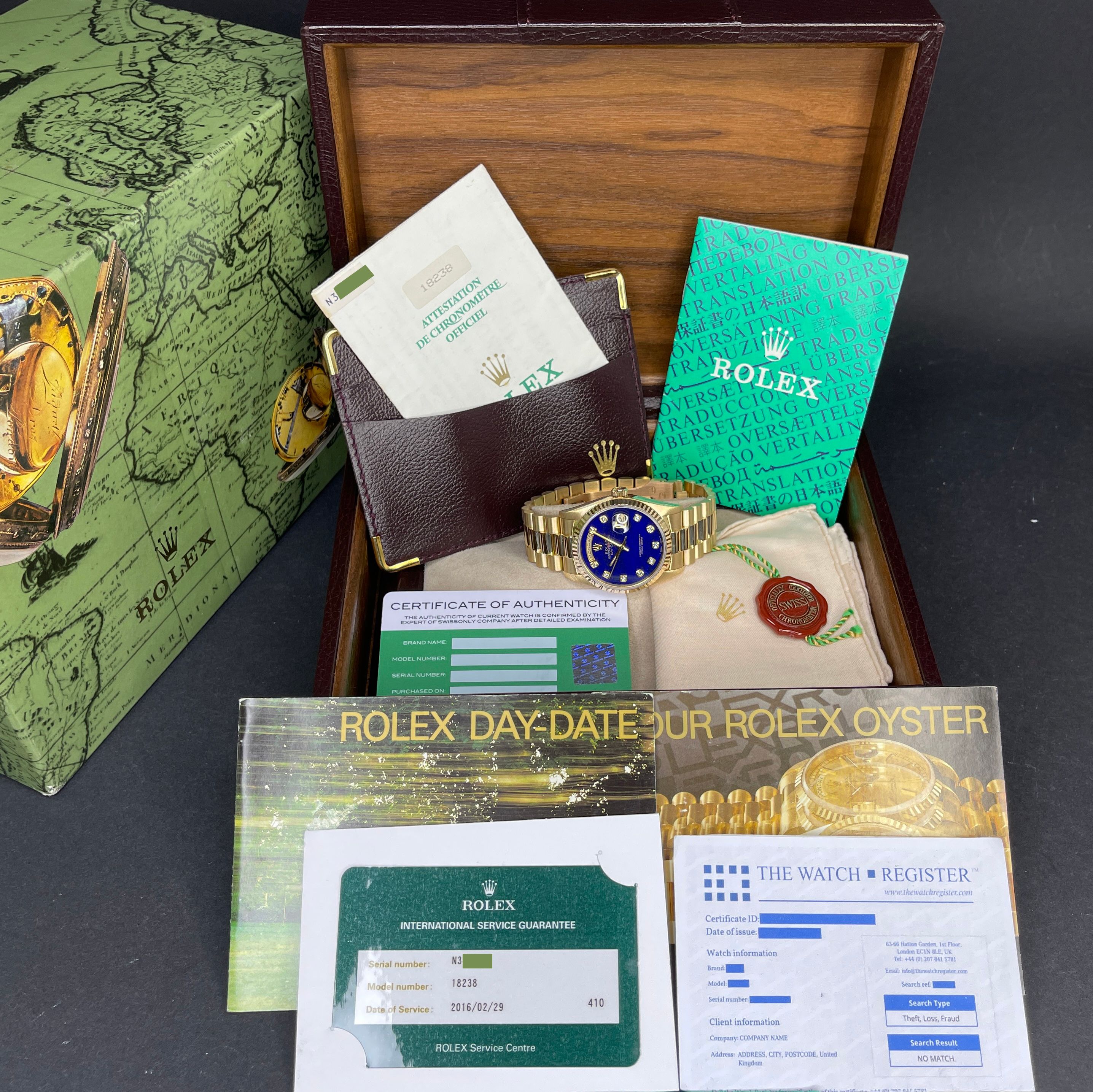 Rolex Day Date President, 18238, 36mm, 1991, Yellow gold, Lapis Lazuli Diamond dial, Fullset, 1y warranty