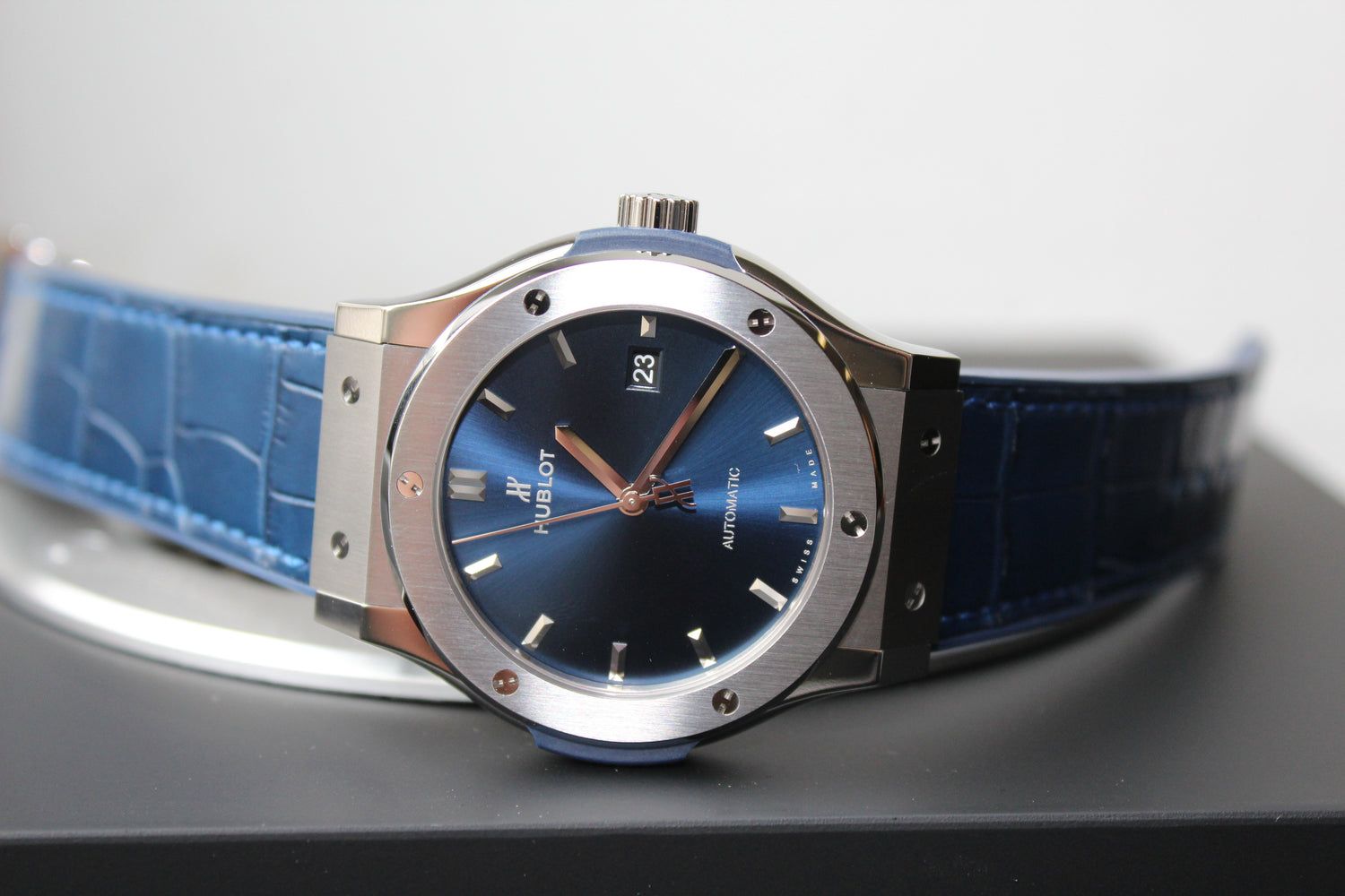 HUBLOT Classic Fusion Titan Blau Titan 42mm 542.NX.7170.LR Titan Automatik Herrenuhr blau Kautschukband Krokodilleder