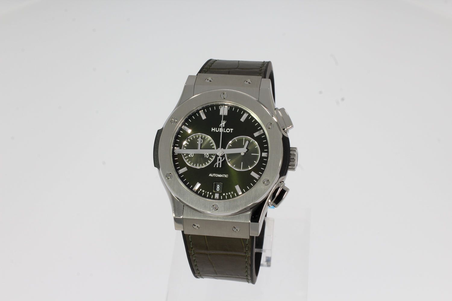 Hublot Classic Fusion Chronograph Titanium Green 42 mm 541.NX.8970.LR Titanium Automatic Chronograph Date Green Alligator Leather Strap Men's Watch