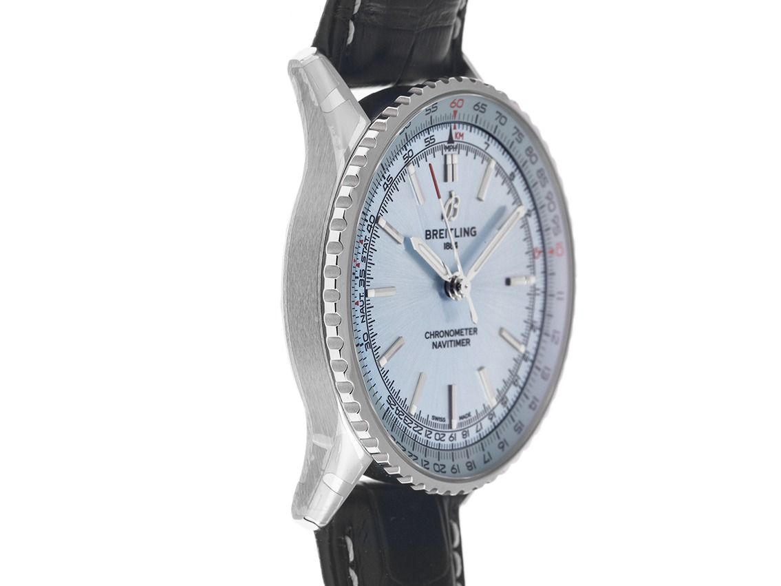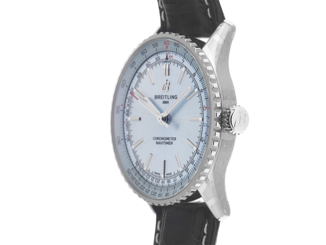 Gehäuse aus poliertem Edelstahl, Gehäusedurchmesser ohne Krone 41mm, Gehäusehöhe 11,6mm. Lünette aus Edelstahl mit geriffeltem Rand und Unterglas-Rechenschieber, beidseitig drehbar. Armband aus schwarzem Krokoleder mit gelben Akzenten, Anstoßbreite 22mm, Sicherheitsfaltschließe aus Edelstahl mit Hersteller-Logo. Zifferblatt in eisblau mit aufgesetzten Edelstahl-Leuchtindizes und Edelstahl-Leuchtzeigern. Uhrwerk Automatik, Chronometer mit Zertifikat, Kaliber Breitling B17 mit 26 Edelsteinen, Gangreserve ca. 38 Stunden. Anzeige von Stunde, Minute und Sekunde über zentrale Zeiger mit Sekundenstopp zur sekundengenauen Einstellung der Uhrzeit. Saphirglas, kratzfest und gewölbt. Krone mit Hersteller-Logo. Boden aus Edelstahl, verschraubt und graviert. Gewicht der Uhr inklusive Armband 81g. Wasserdicht bis 3 ATM. Referenznummer: A17329171C1P1, ID: ST116076600825H-5650, Artikelnummer: 10000081813. Original Breitling Box und Garantieunterlagen von 2025, Full Set. Ungetragen. Lieferzeit sofort.