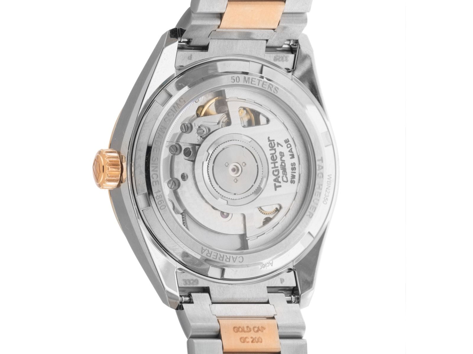 Gehäuse Edelstahl poliert, Gehäusedurchmesser ohne Krone 36mm, Gehäusehöhe 10,6mm. Lünette Roségold glatt und poliert. Armband Edelstahl / Roségold poliert, Doppelsicherheitsfaltschließe Edelstahl mit Hersteller-Logo. Zifferblatt roséfarben mit aufgesetzten roségoldenen Leuchtindexen und roségoldenen Leuchtzeigern. Uhrwerk Automatik, Kaliber Tag Heuer Calibre 7 mit 25 Edelsteinen, Gangreserve ca. 50 Stunden. Anzeige von Stunde, Minute und Sekunde über Zeiger aus der Mitte mit Sekundenstopp zur sekundengenauen Einstellung der Uhrzeit, Datumsanzeige mit Schnellverstellung bei 6 Uhr. Saphirglas kratzfest und gewölbt. Krone mit Hersteller-Logo. Boden Edelstahl verschraubt und graviert mit Saphirglas Sichtfenster. Gewicht der Uhr inklusive Armband 118g, Länge des Armbandes inklusive Gehäuse 190mm. Wasserdicht bis 5 ATM. Referenznummer: WBN2350.BD0000, ID: ST116095420825H-7600, Artikelnummer: 10000081871. Original Tag Heuer Box mit Umkarton und Garantie Papiere von Juli 2025 sowie Beschreibung, Full Set. Ungetragen. Lieferzeit sofort.